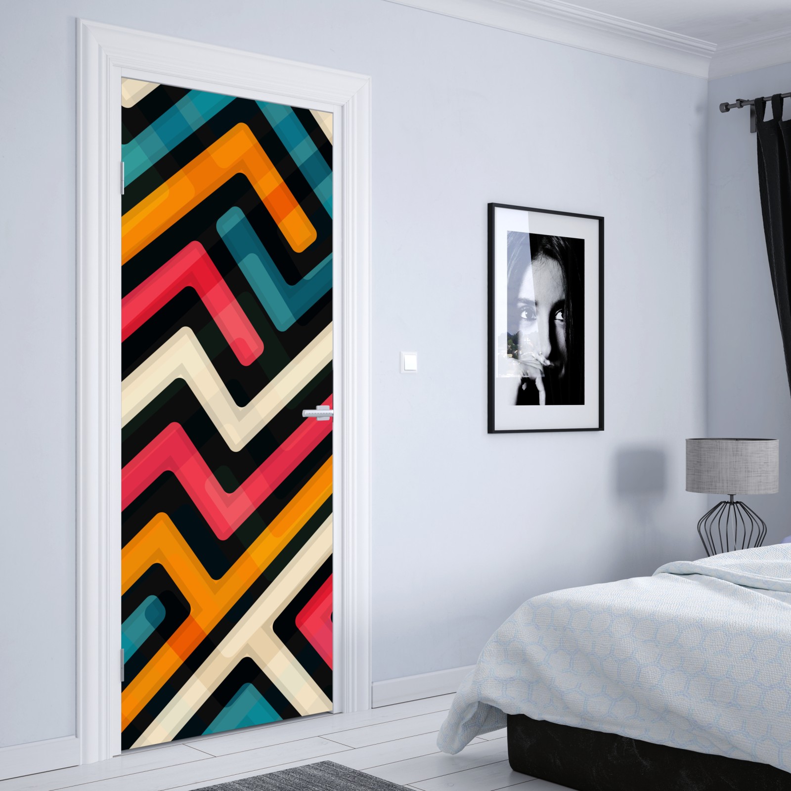 Kräftiges geometrisches Muster in lebendigen Retro-Farben, das Wänden eine dynamische Optik und modernen Charme verleiht.