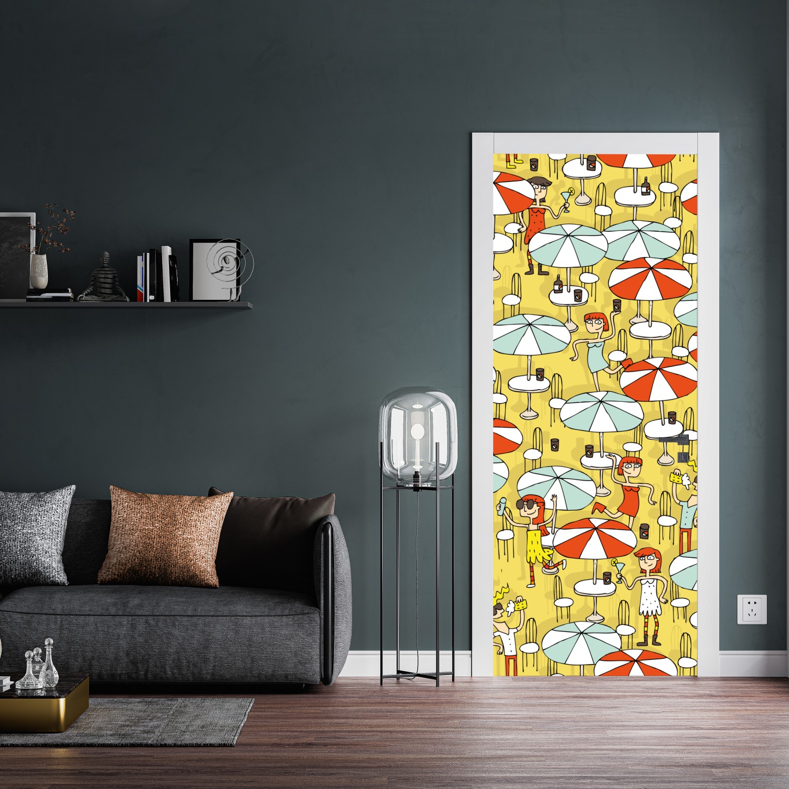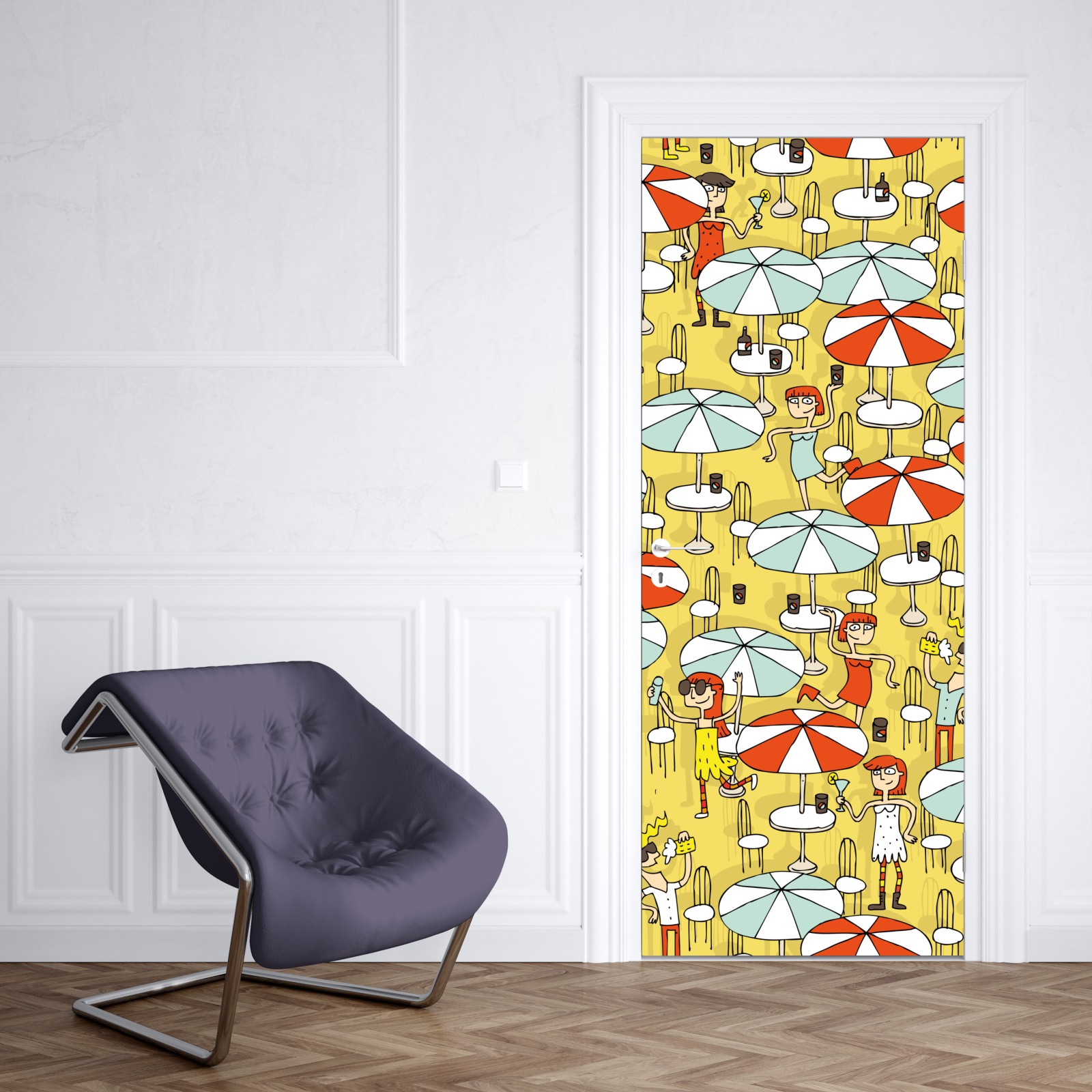 lebendige handgezeichnete strandszene mit schirmen und verspielten figuren bringt sommerliche energie an jede wand.