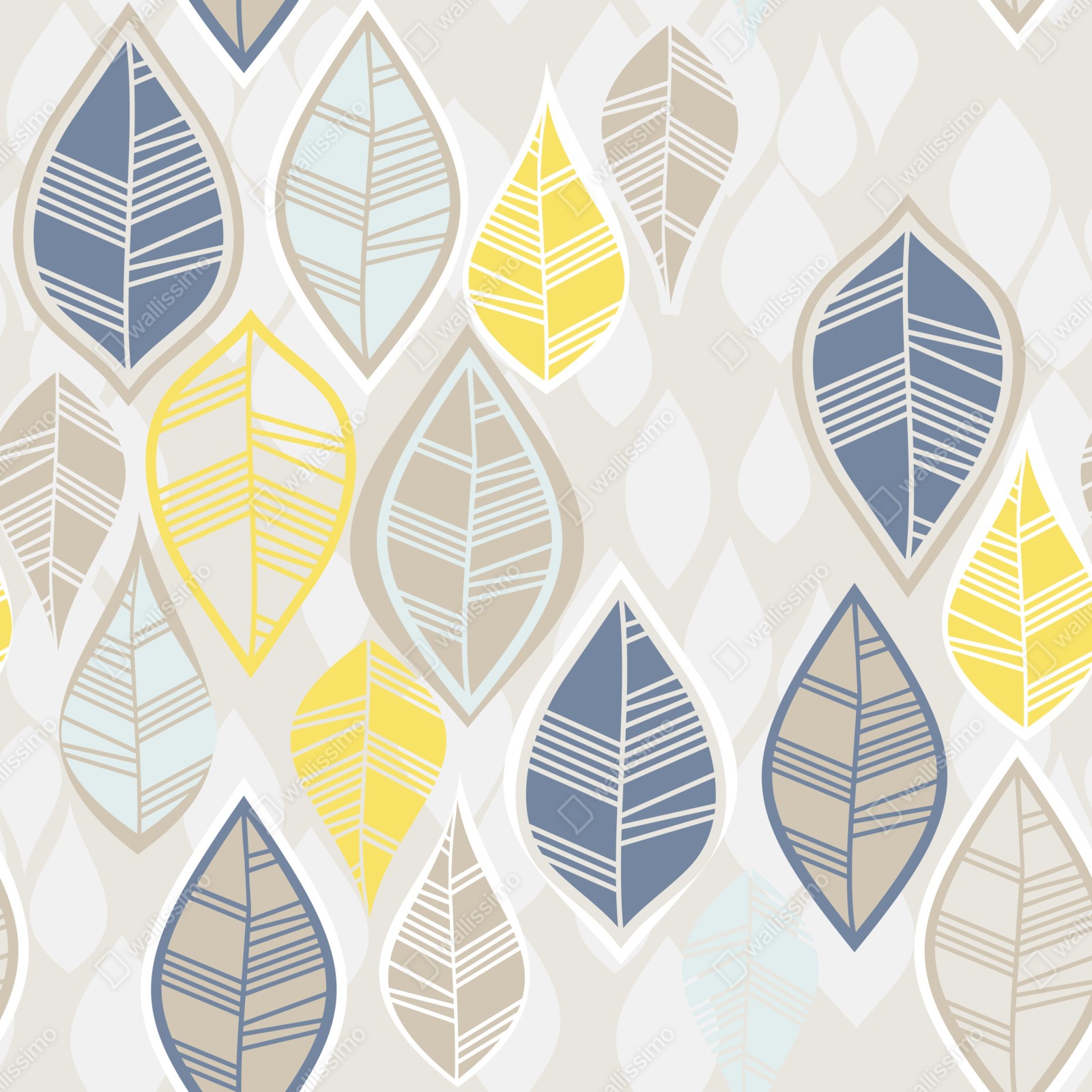 Verleihen Sie dem Raum einen ruhigen, modernen Akzent mit einem wiederholenden Blättermuster in sanften Beige-, Blau- und Gelbtönen.