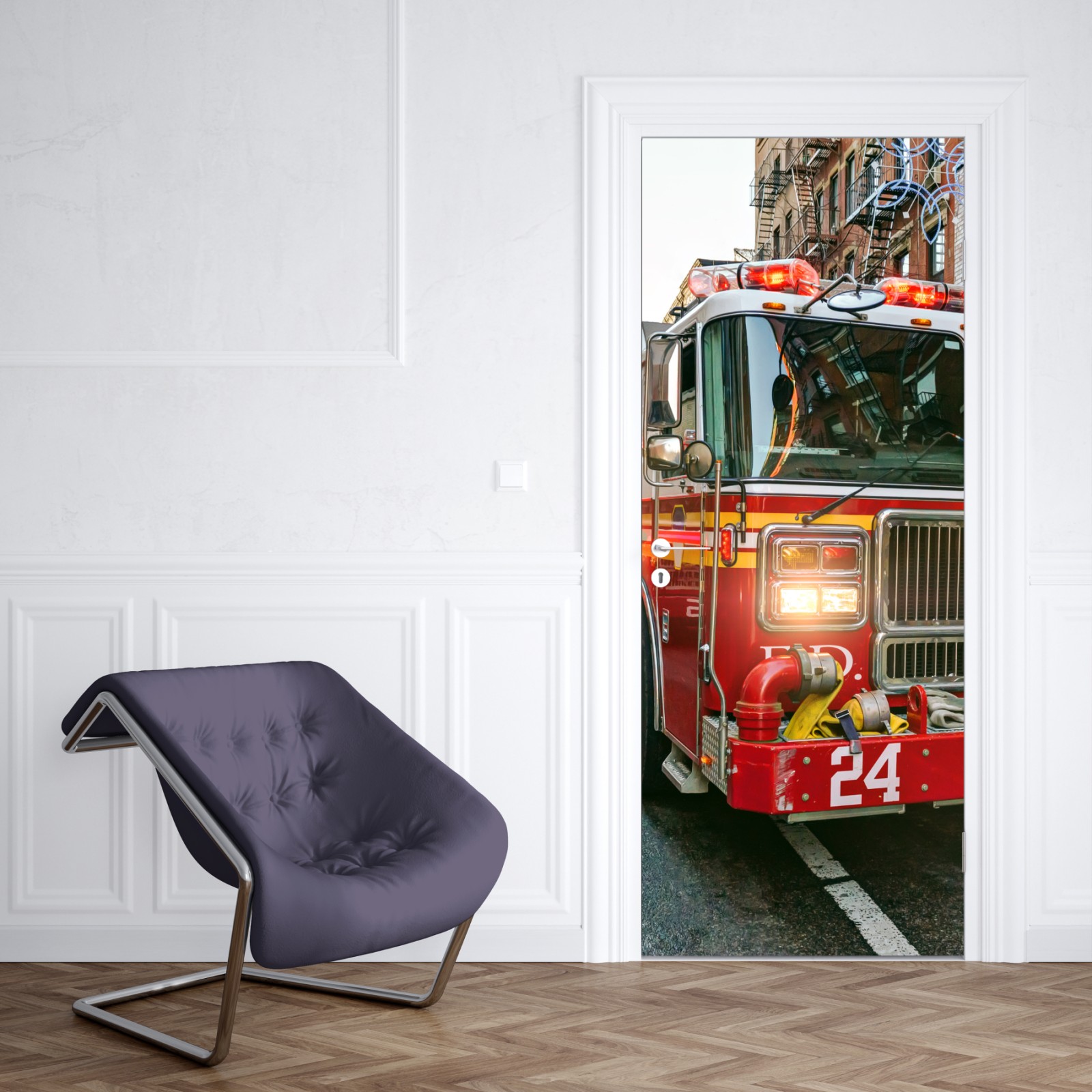 Türaufkleber feuerwehrautos auf einer straße in Manhattan, New York