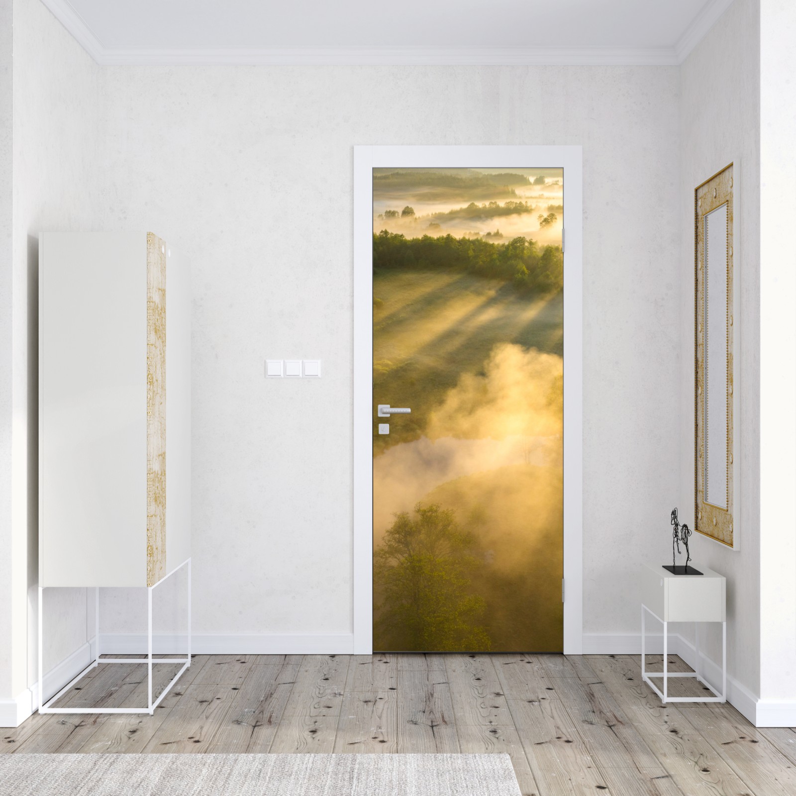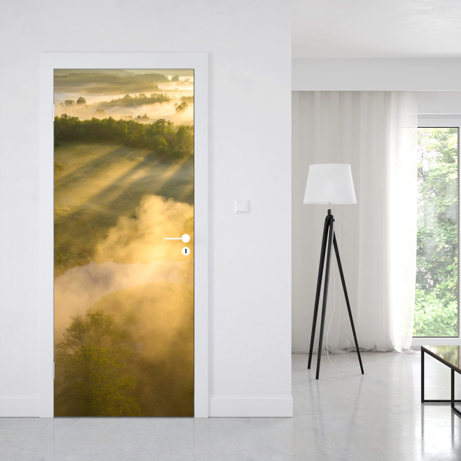 Erleben Sie ruhiges Morgenlicht mit Sonnenstrahlen, die durch den Nebel über einem mäandrierenden Fluss und grünen Wiesen brechen.