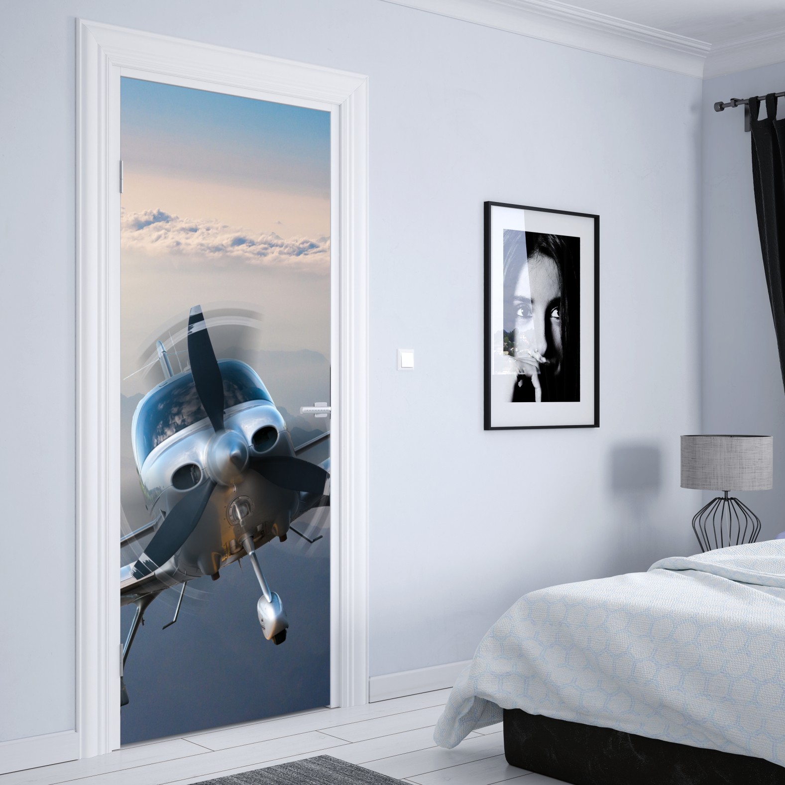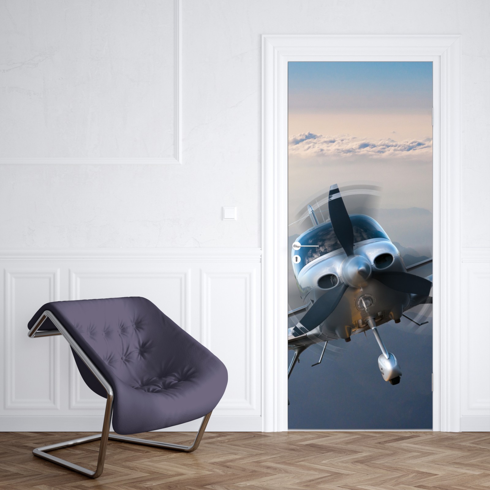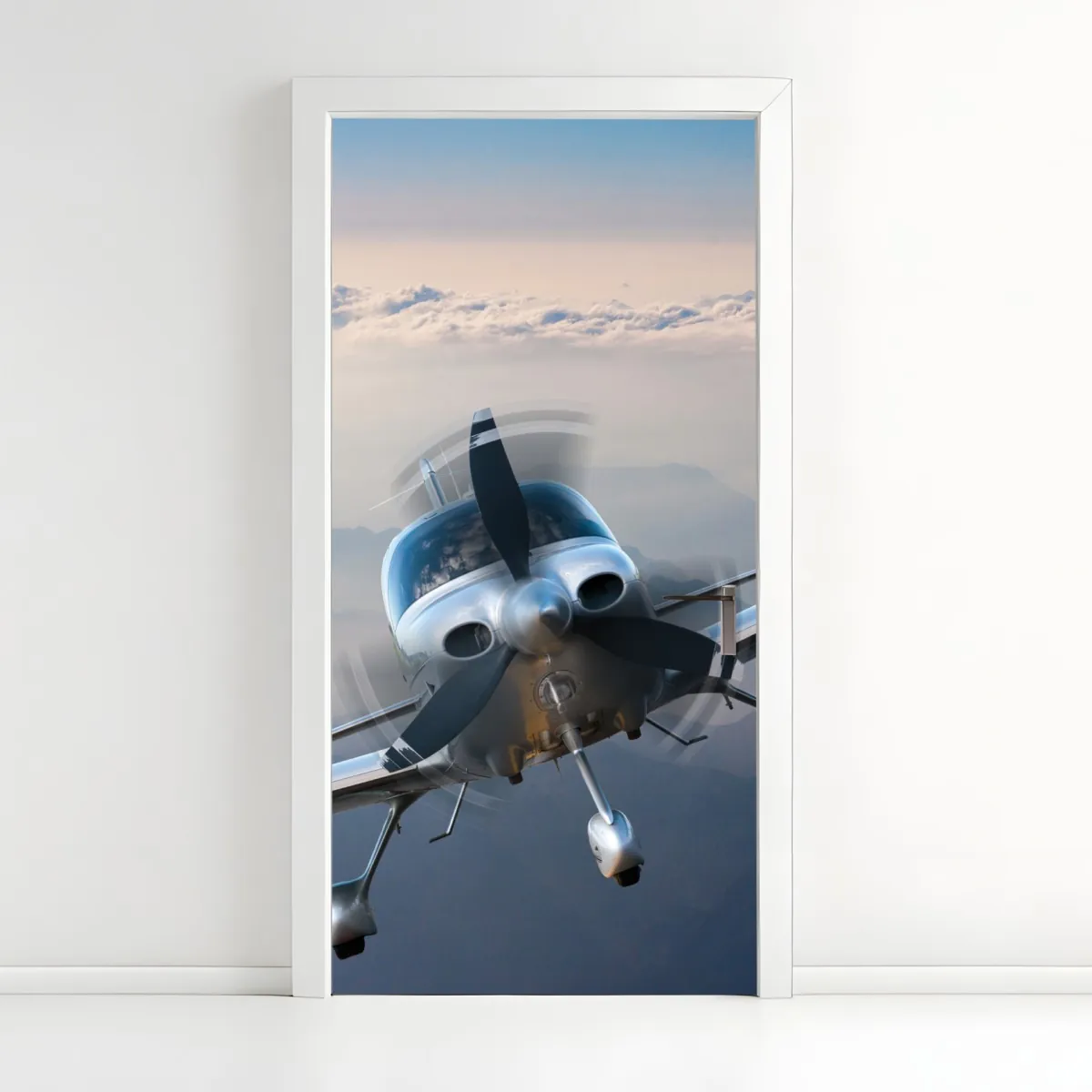Türaufkleber silbernes propellerflugzeug über nebeligen bergen