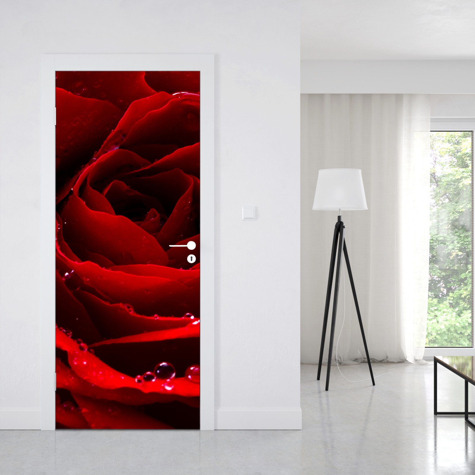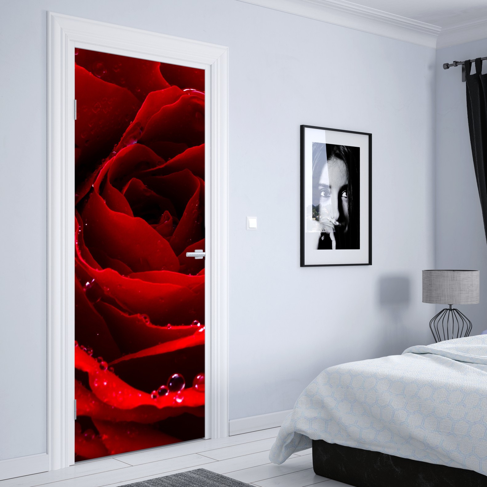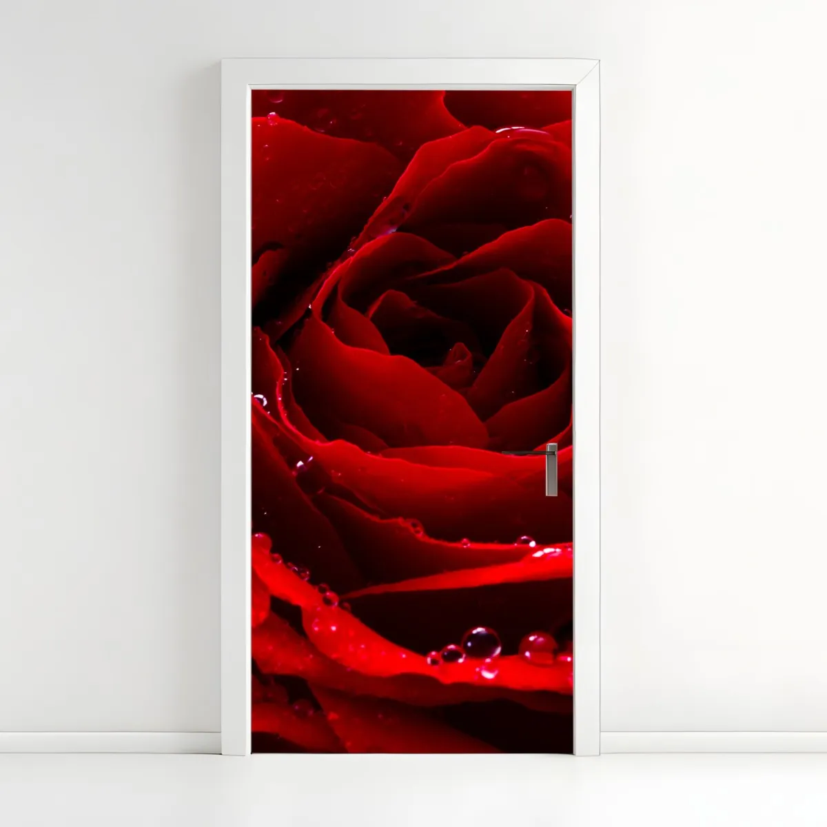 Ein beeindruckendes Close-up einer taufrischen roten Rose, das romantische Eleganz und intensive Farbe an jede Wand bringt.