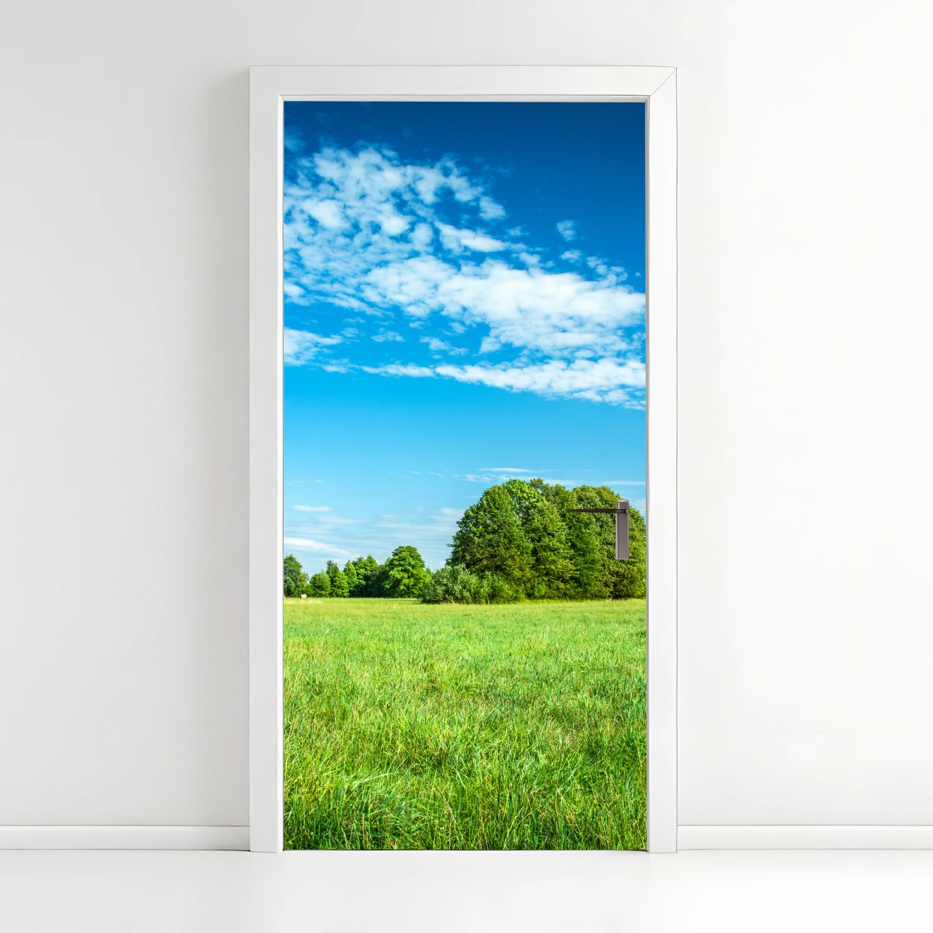 Türaufkleber Sonnige grüne wiese unter blauem himmel