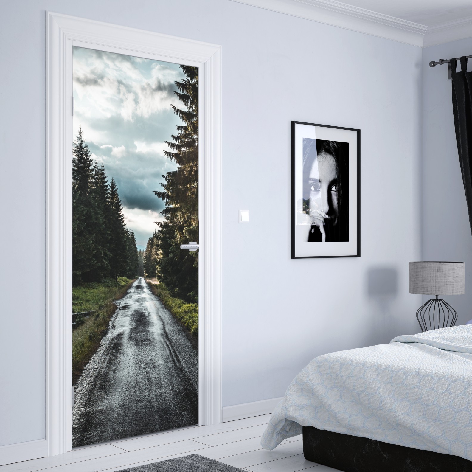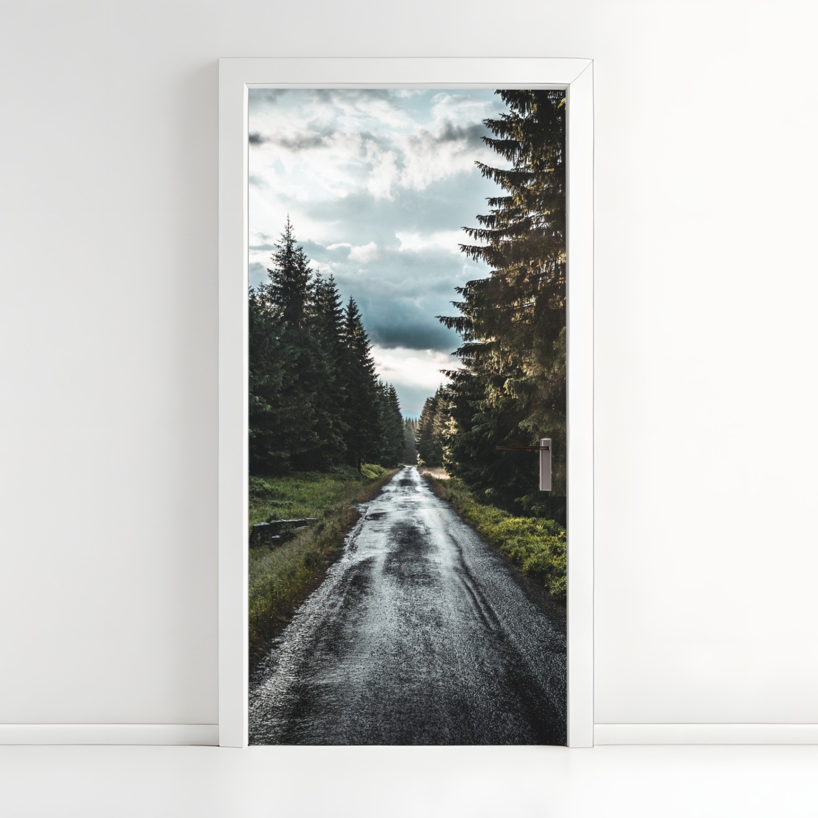 Türaufkleber waldweg durch neblige kiefern