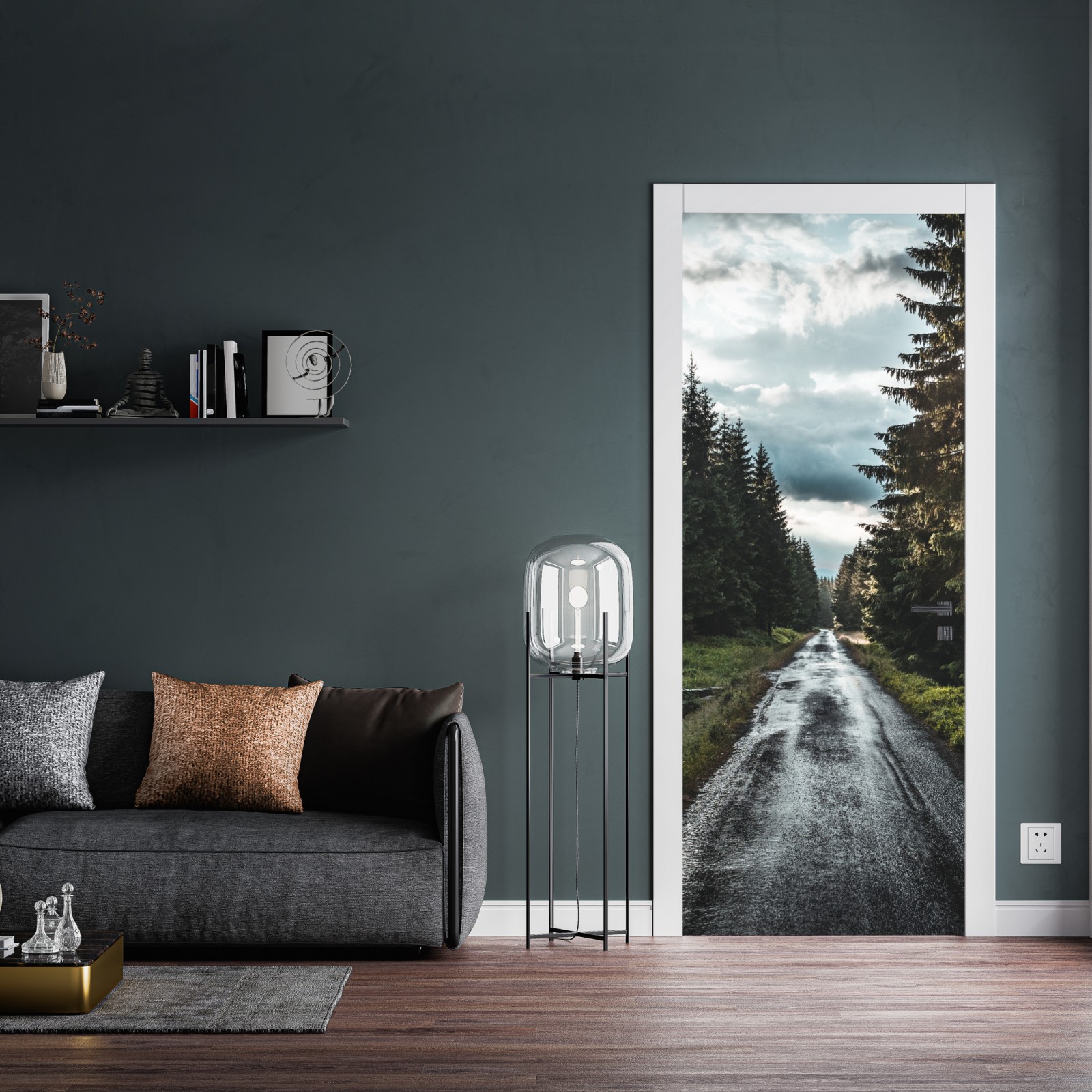 Ein stimmungsvolles Foto eines nassen Waldwegs, das Ruhe und Tiefe in jeden Raum bringt.