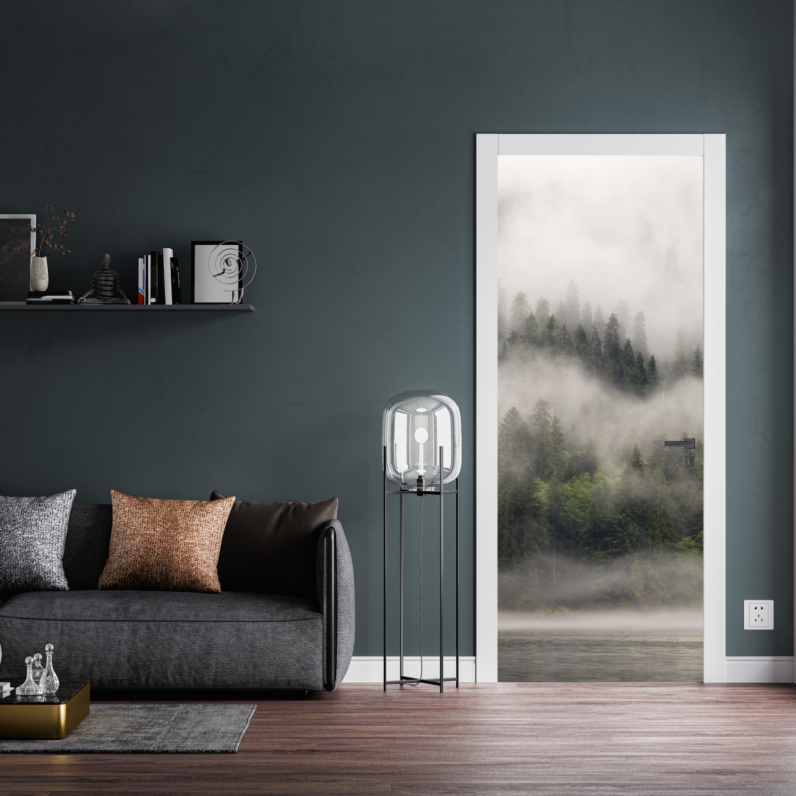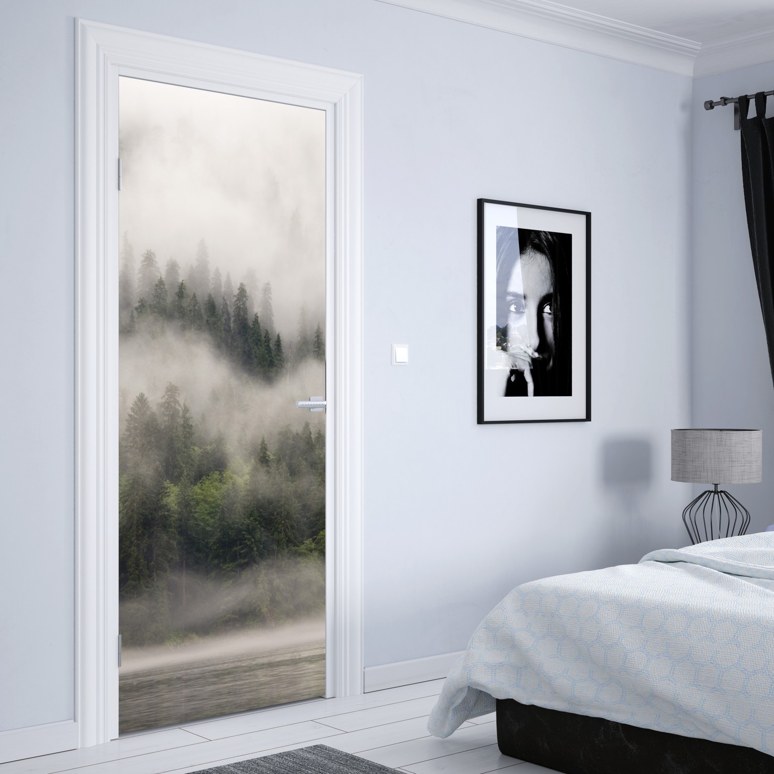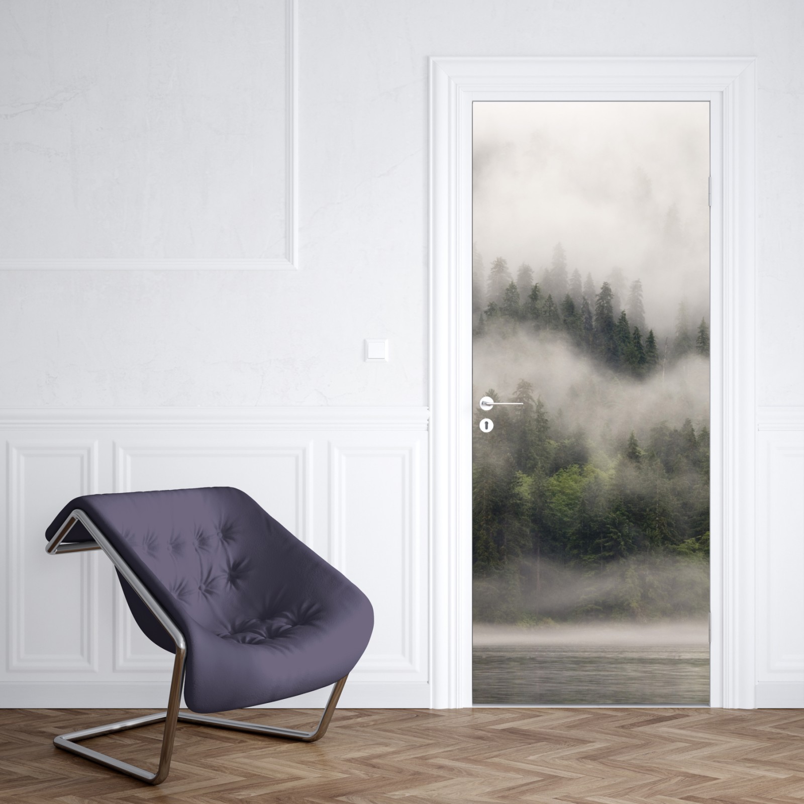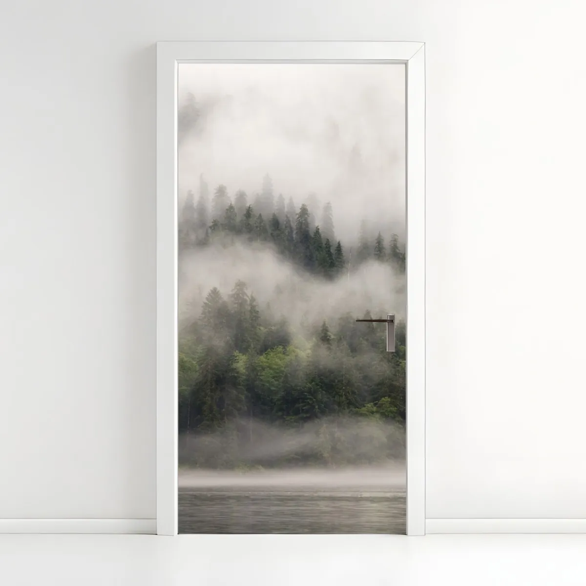 Eine beruhigende nebelige Waldlandschaft an einer Küstenbucht in British Columbia, perfekt, um natürliche Ruhe in Ihr Zuhause zu bringen.