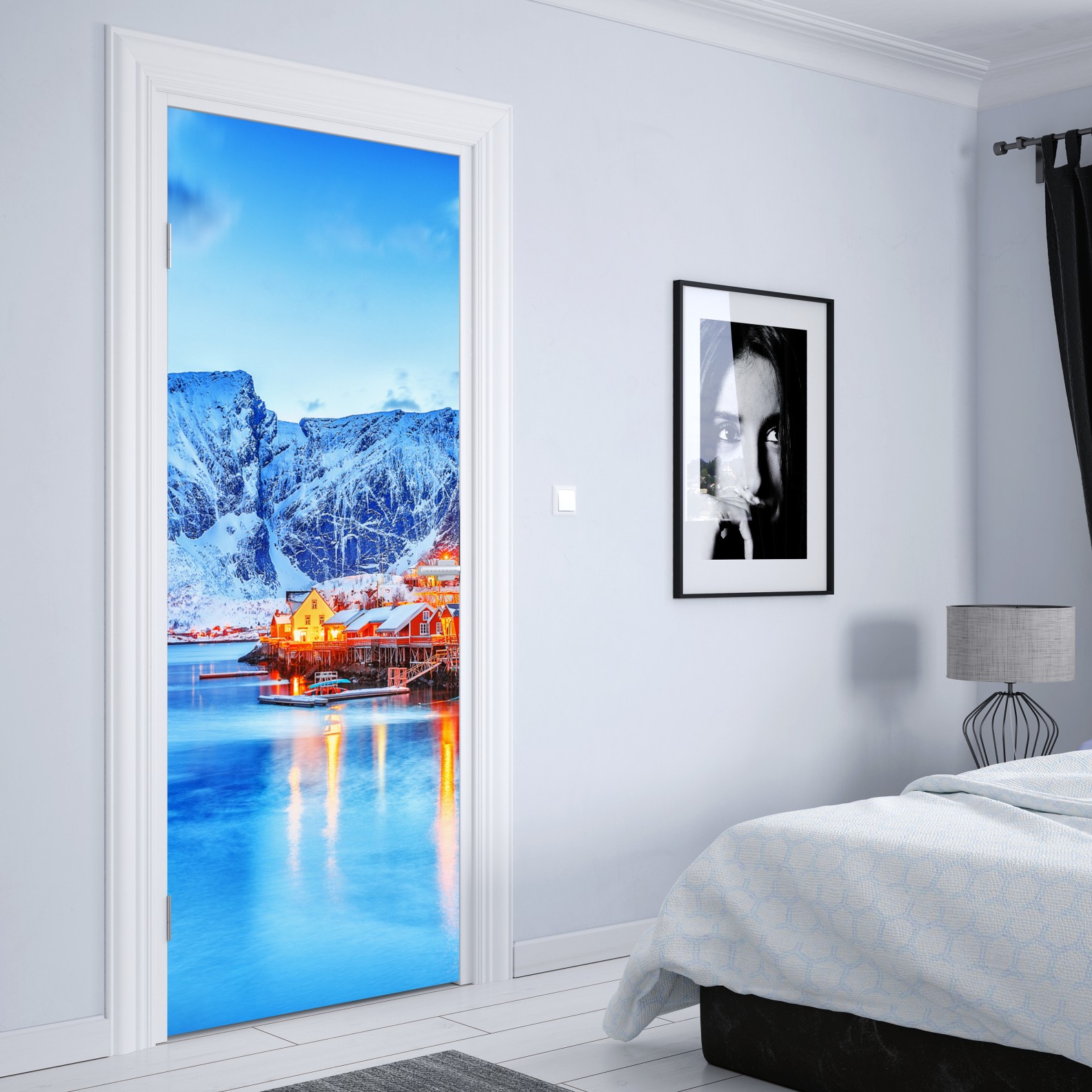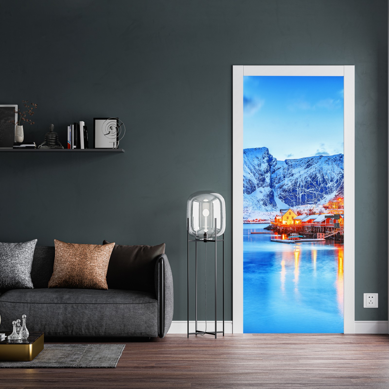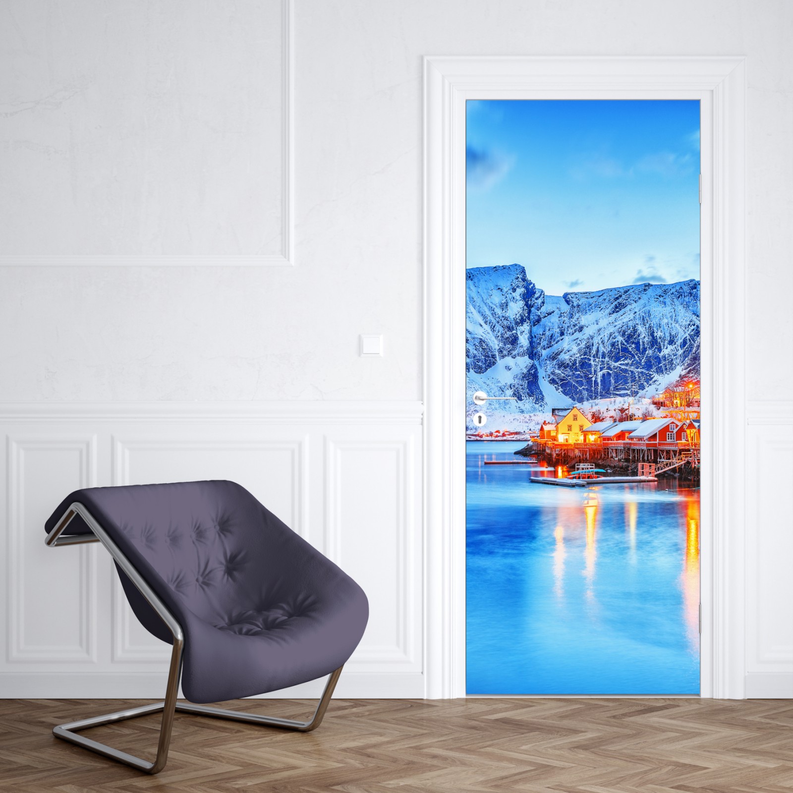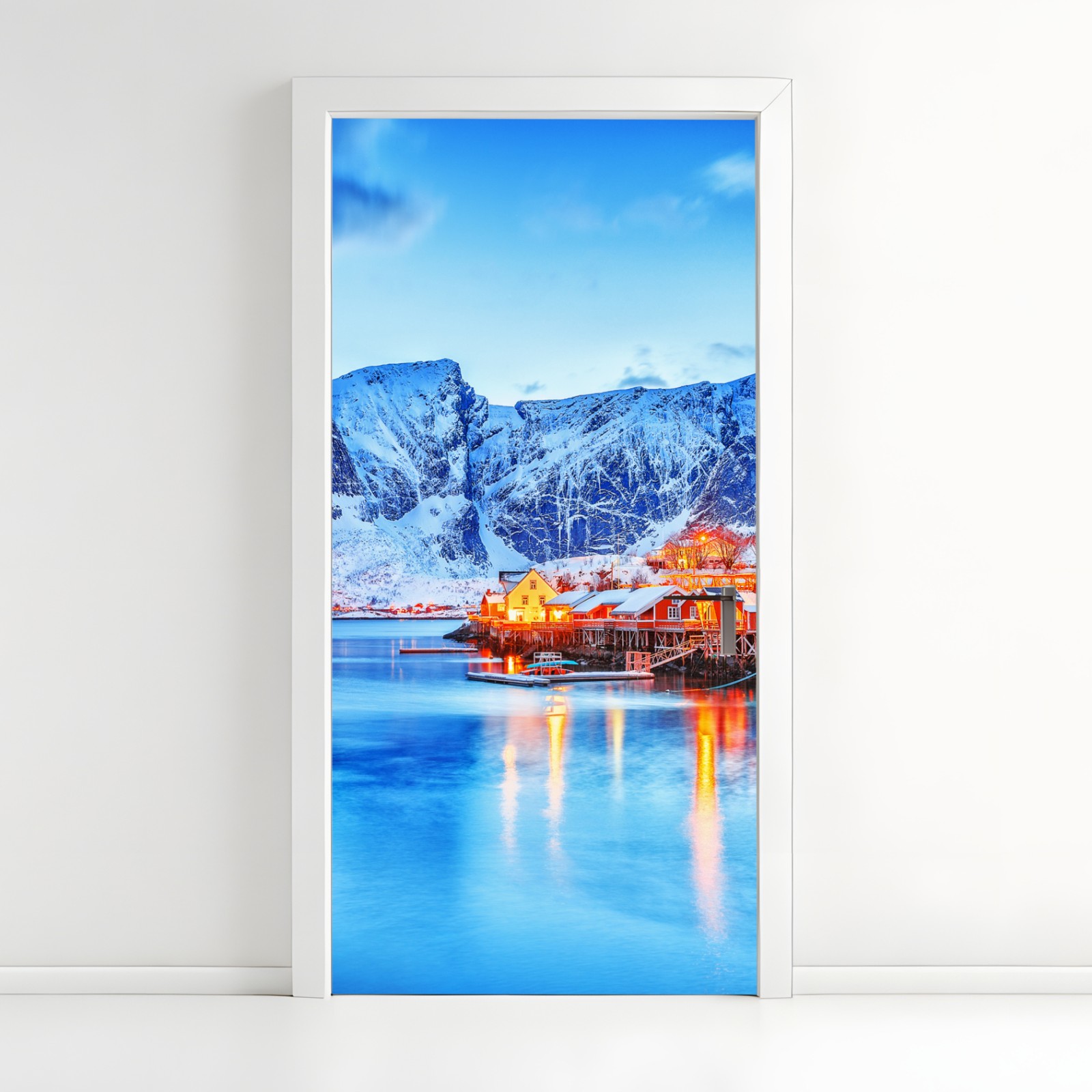 Türaufkleber verschneites küstendorf unter hohen bergen