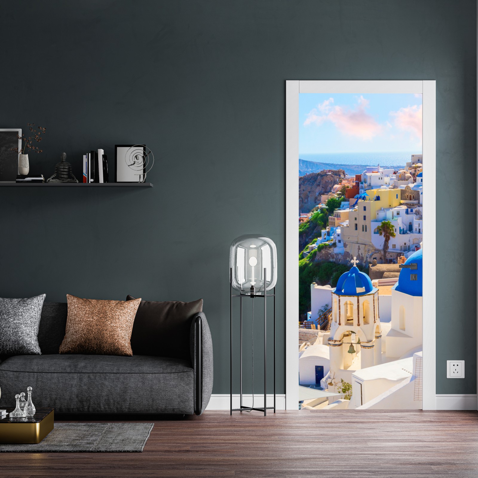 Türaufkleber Santorini blaue kuppeln und weiße häuser