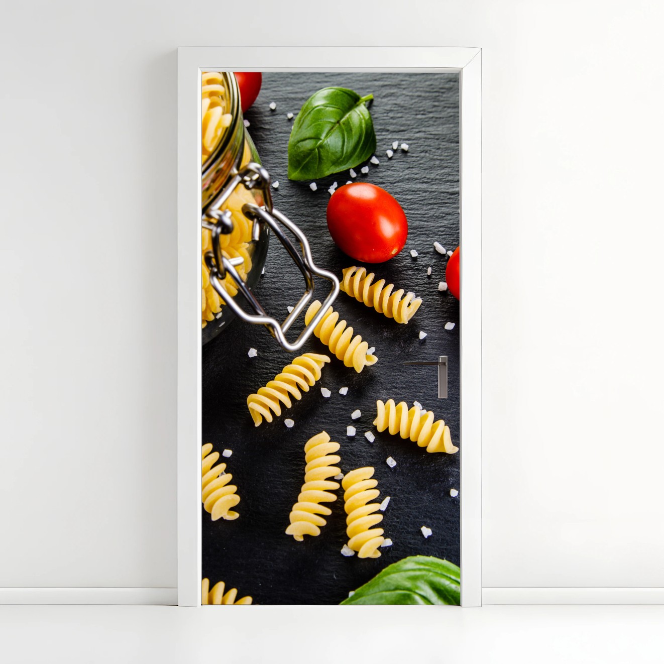 Türaufkleber Pasta zutaten arrangiert mit tomaten und basilikum