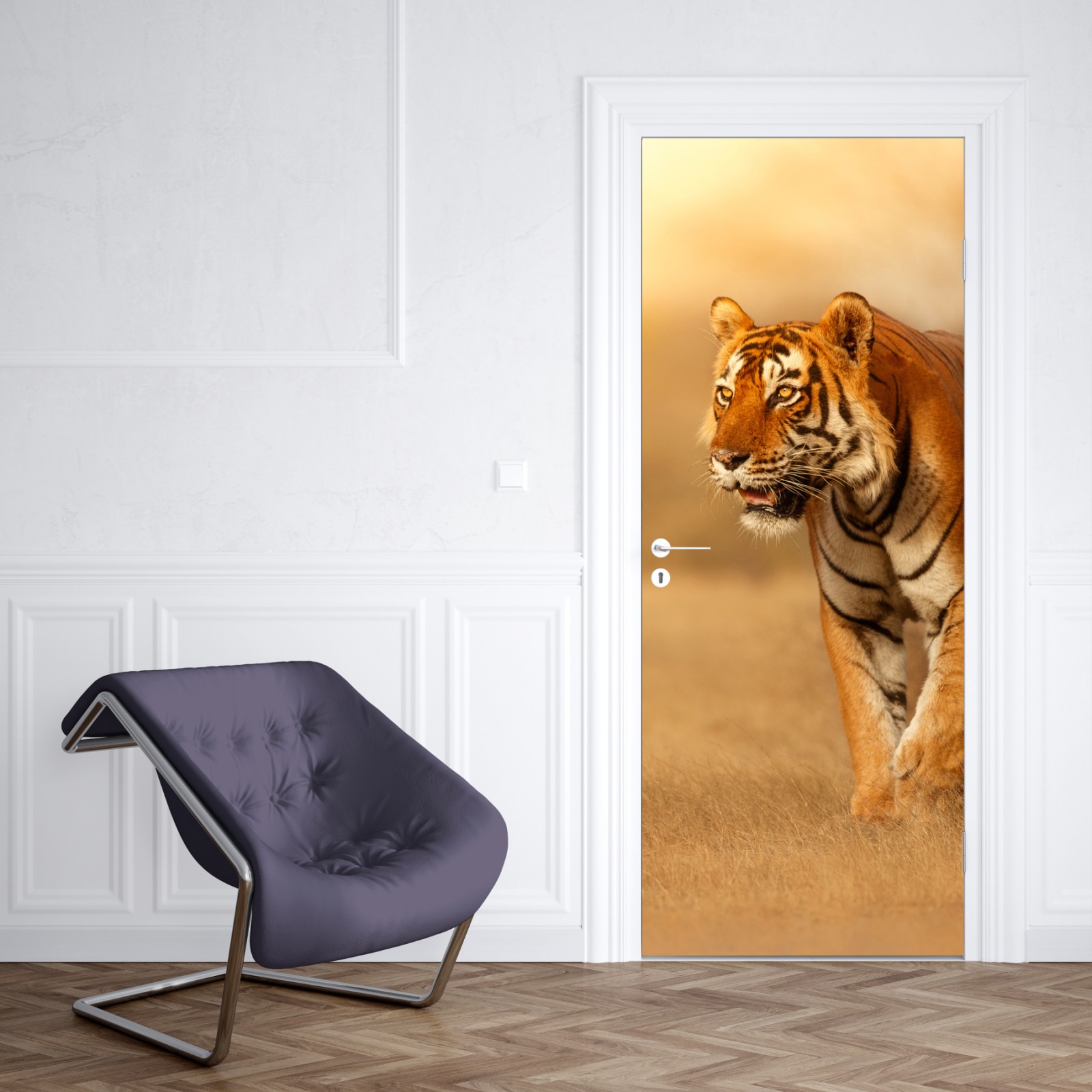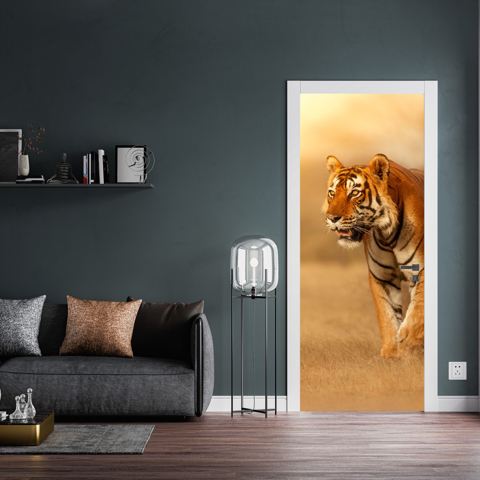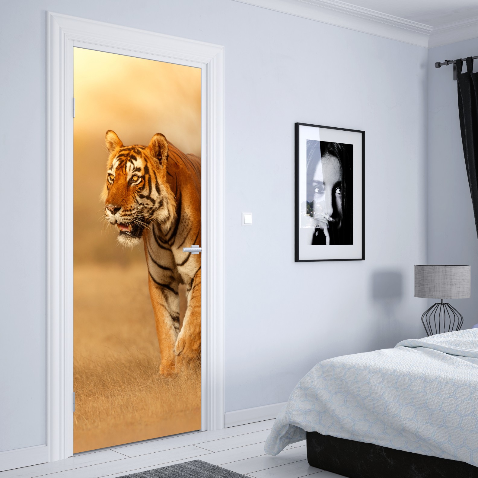 Beeindruckende Nahaufnahme eines Tigers, der durch sonnenbeschienenes Gras schreitet, ein dramatischer und natürlicher Akzent für jedes Interieur.