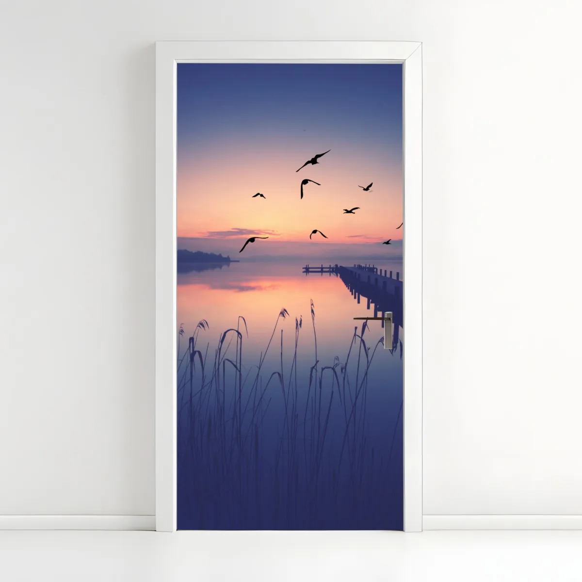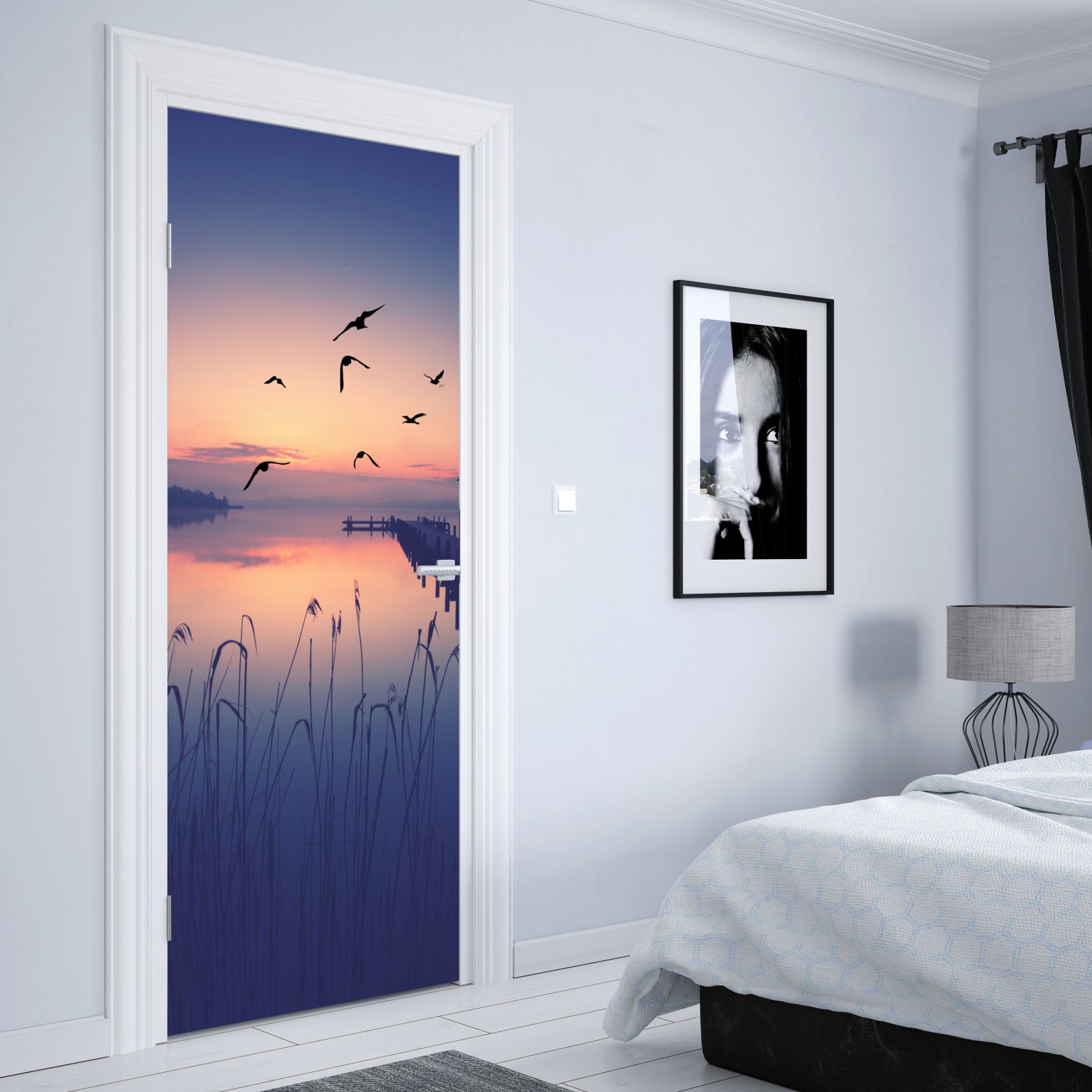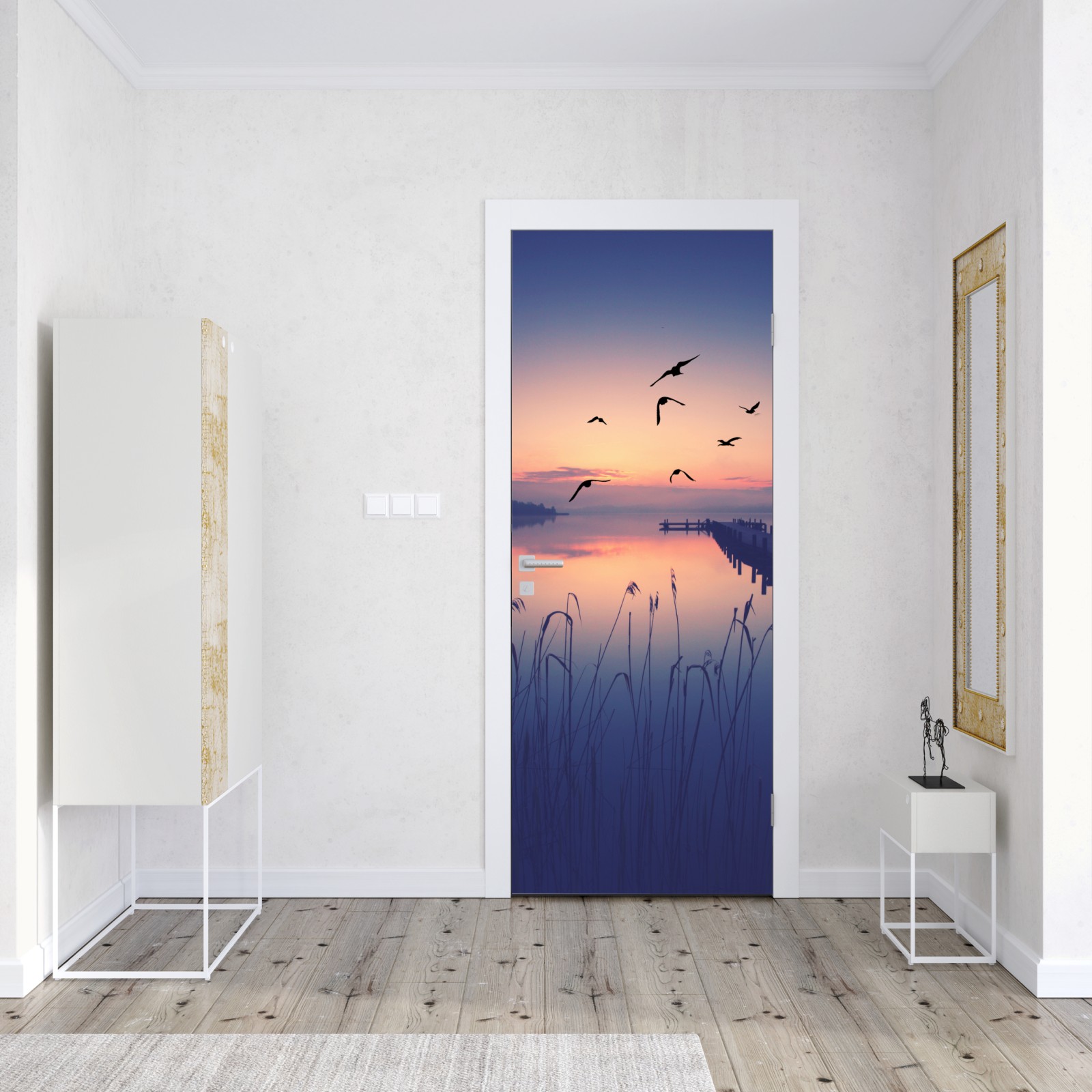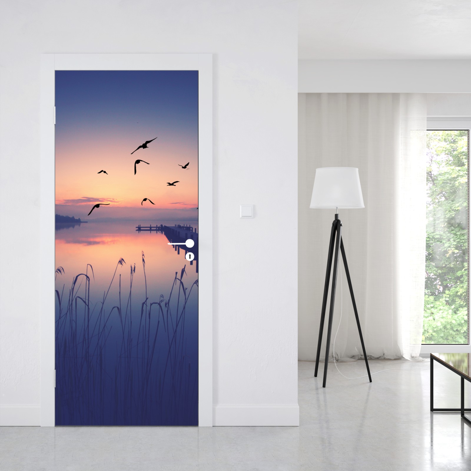 Türaufkleber ruhiger sonnenaufgang am see mit vögeln