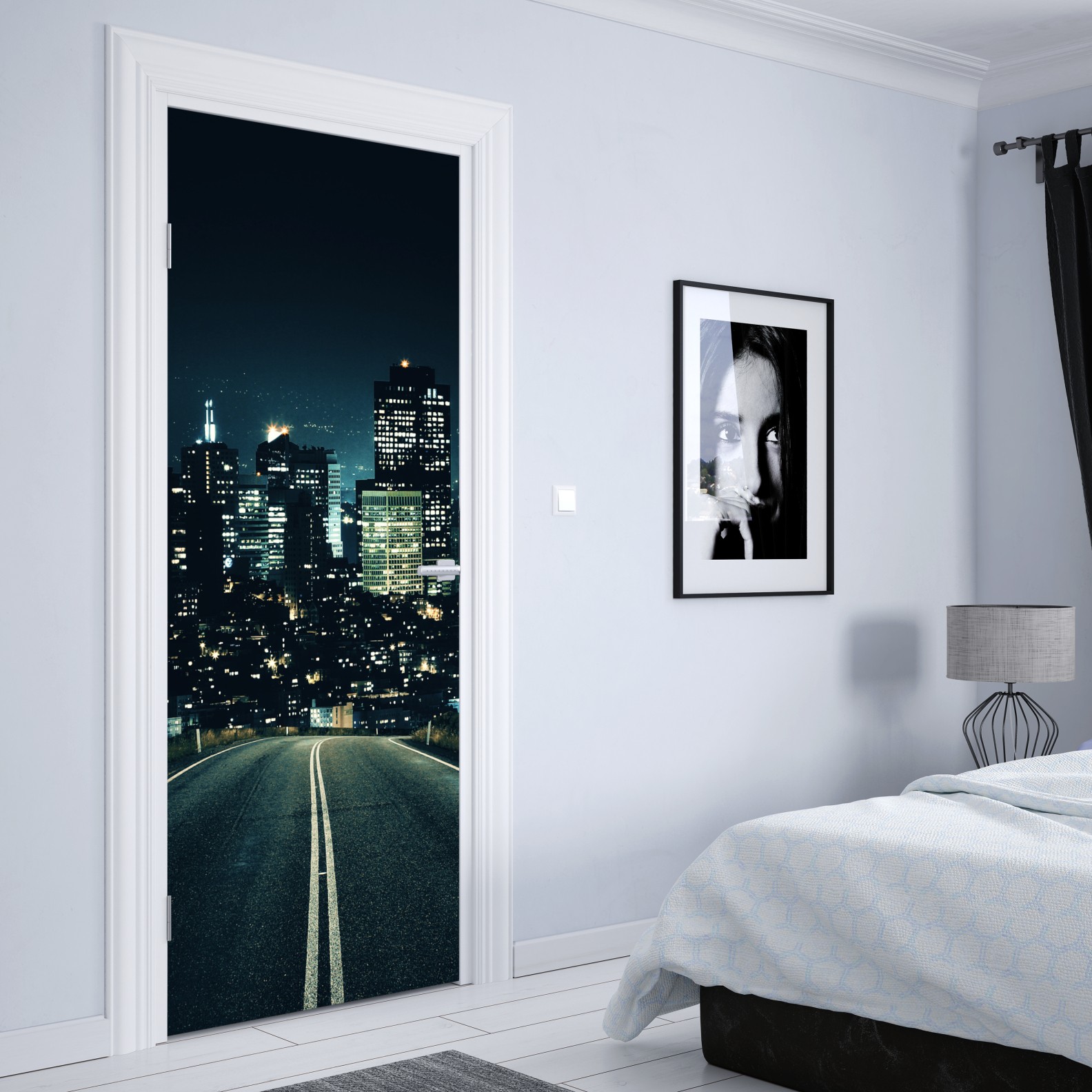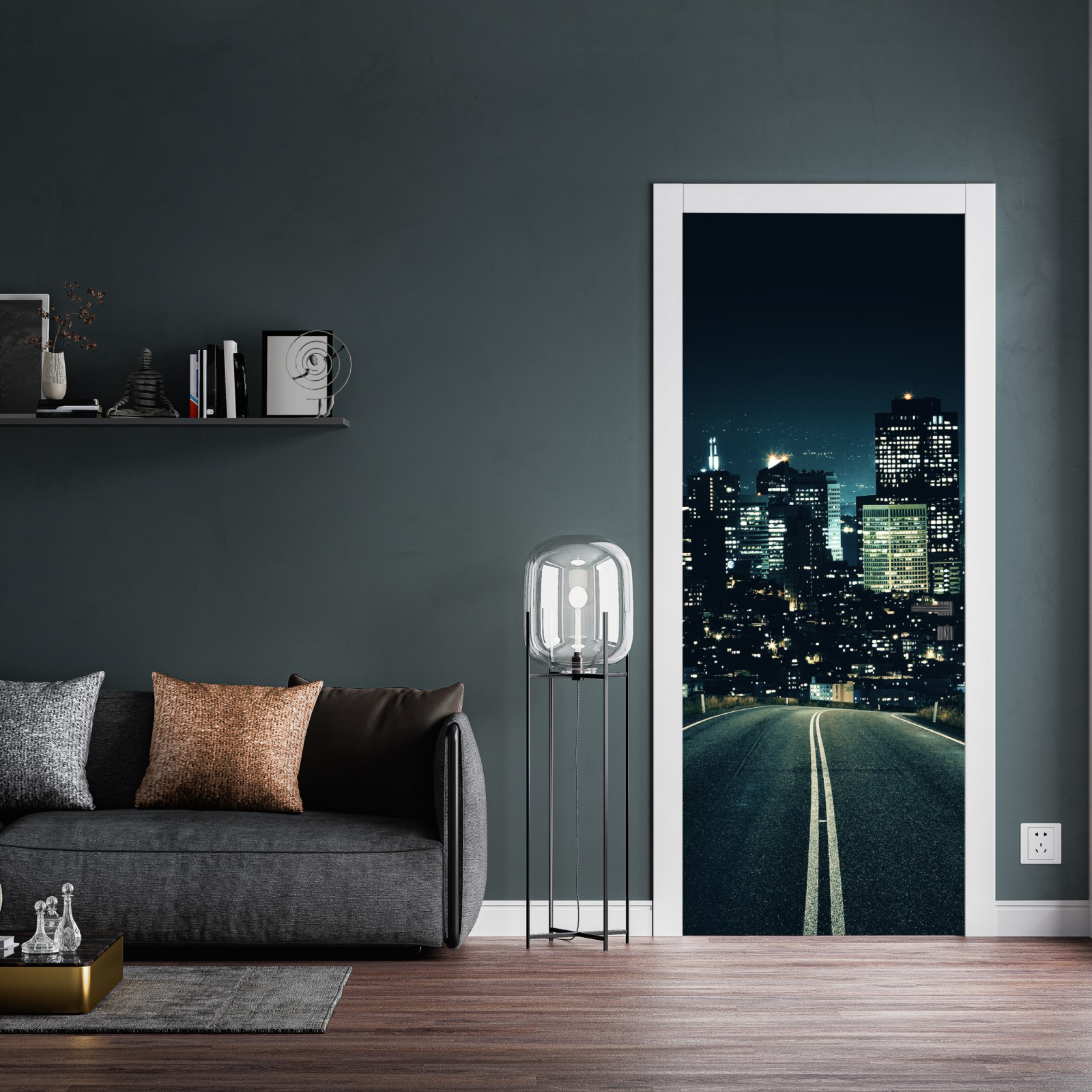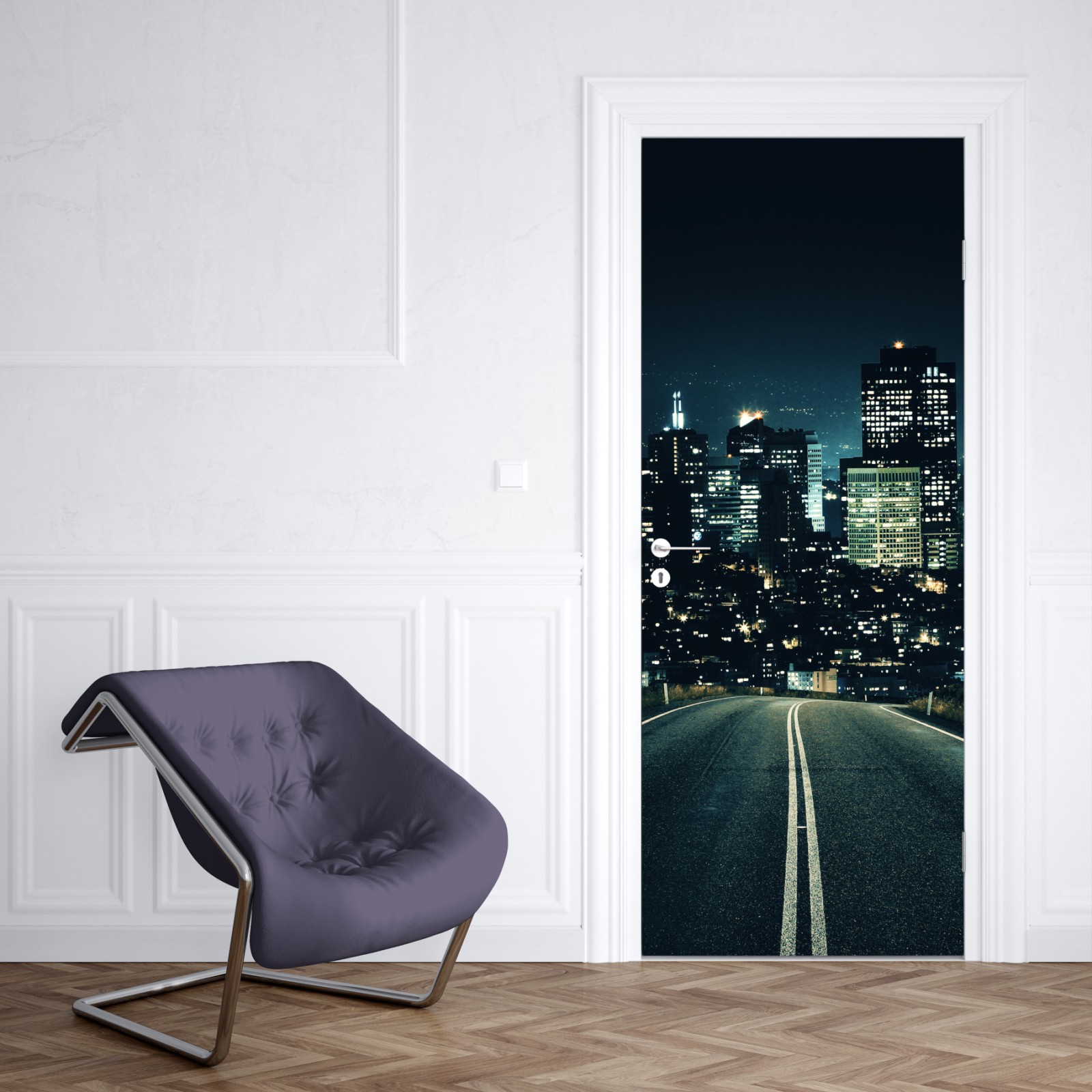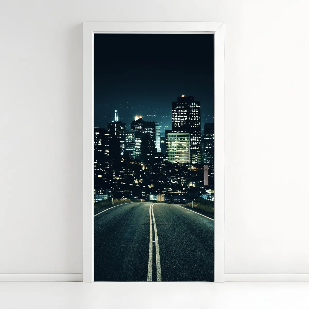 Türaufkleber straße zur beleuchteten stadtsilhouette bei nacht