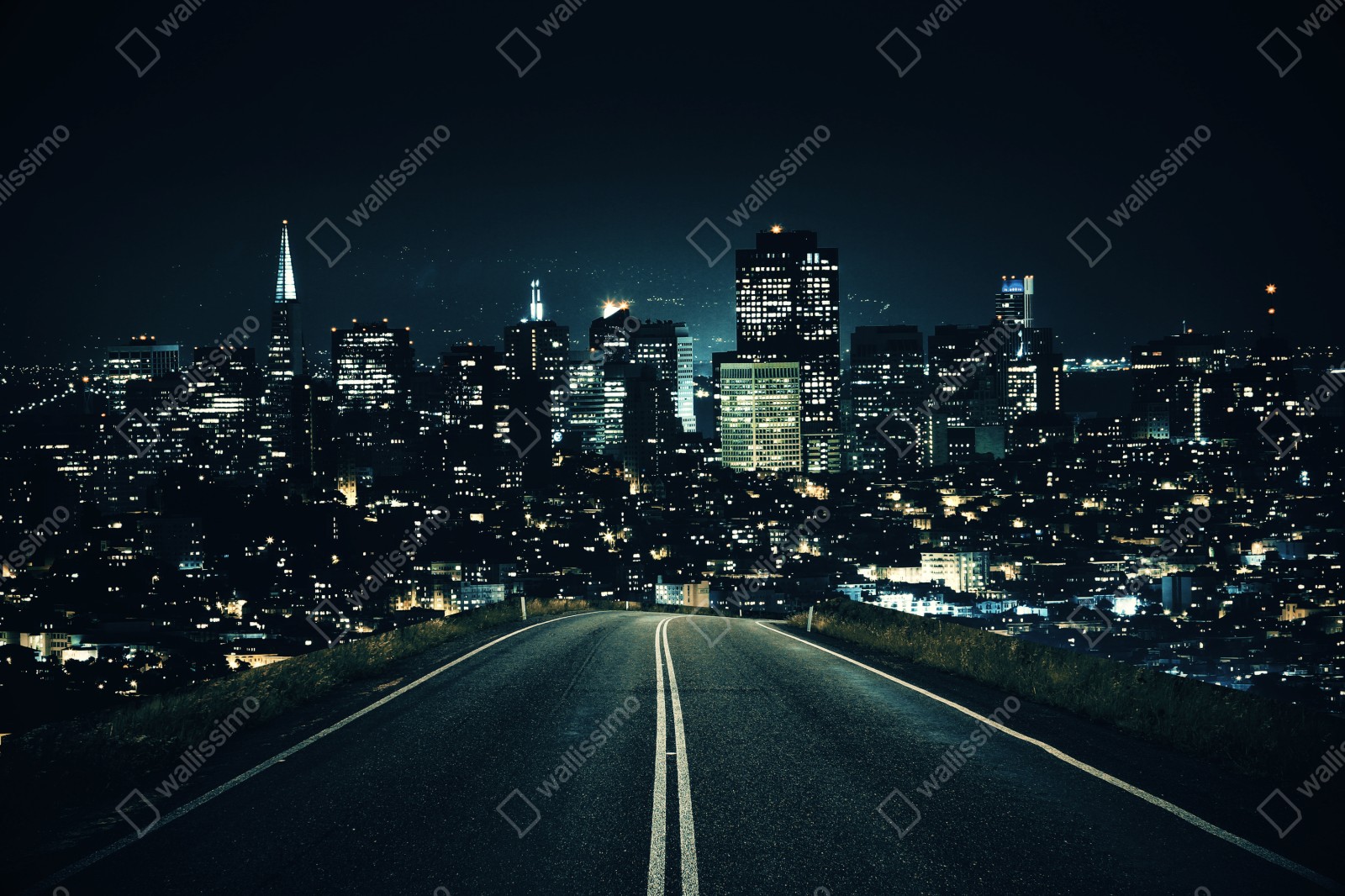 Dramatische nächtliche Stadtansicht mit einer Straße, die zur beleuchteten Skyline führt, ideal, um modernen urbanen Charme an die Wand zu bringen.