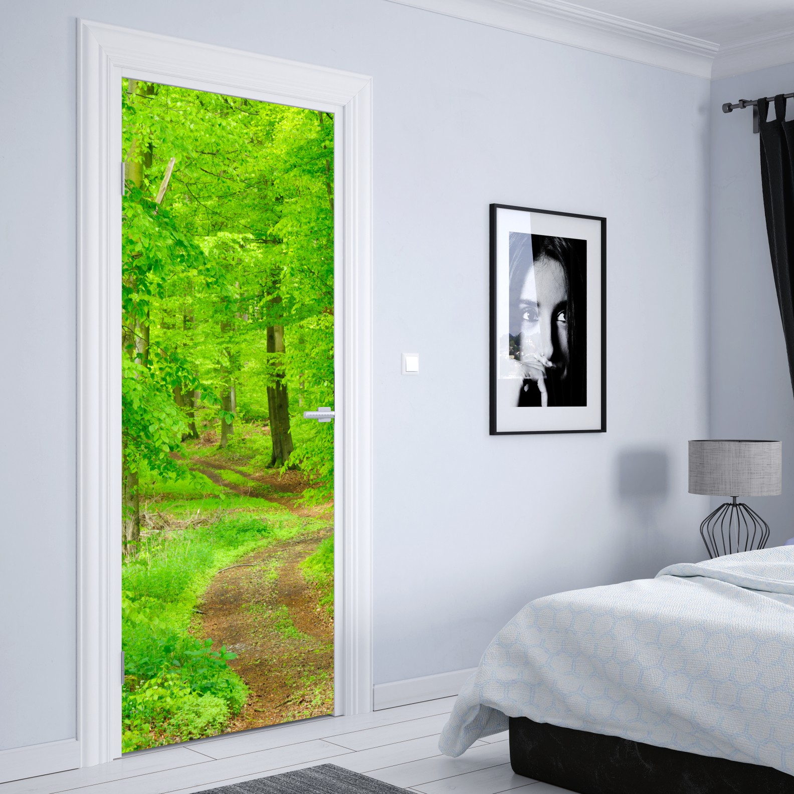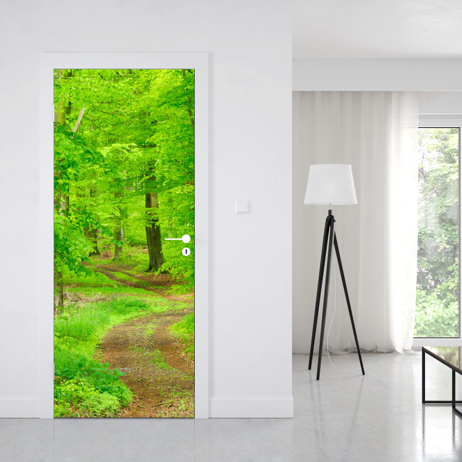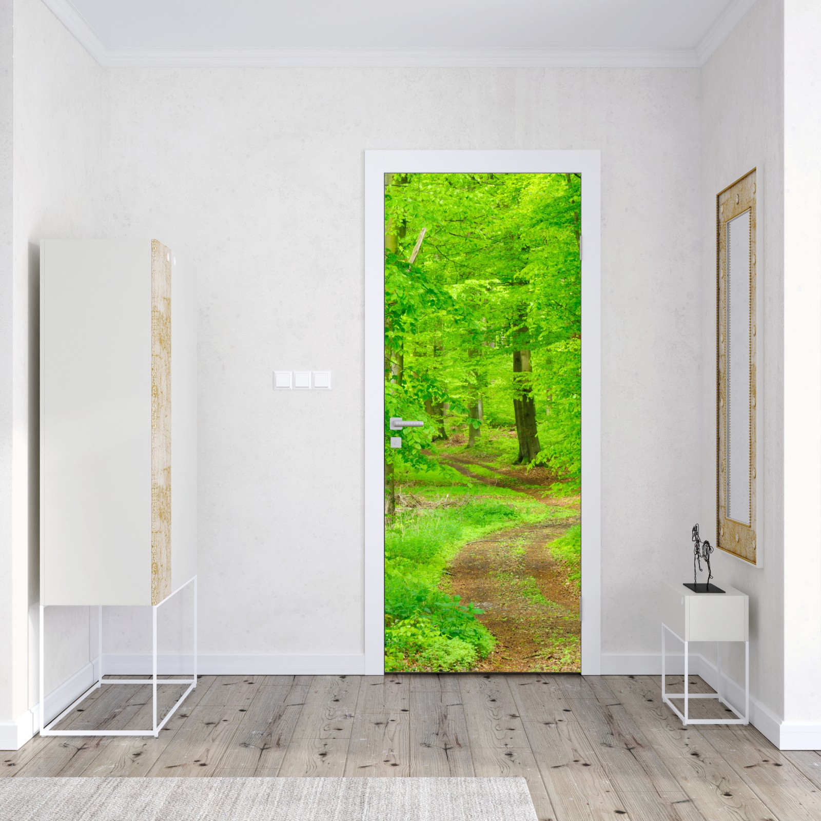 Ein ruhiger grüner Waldweg, der jedem Raum natürliche Ruhe und Frische verleiht.