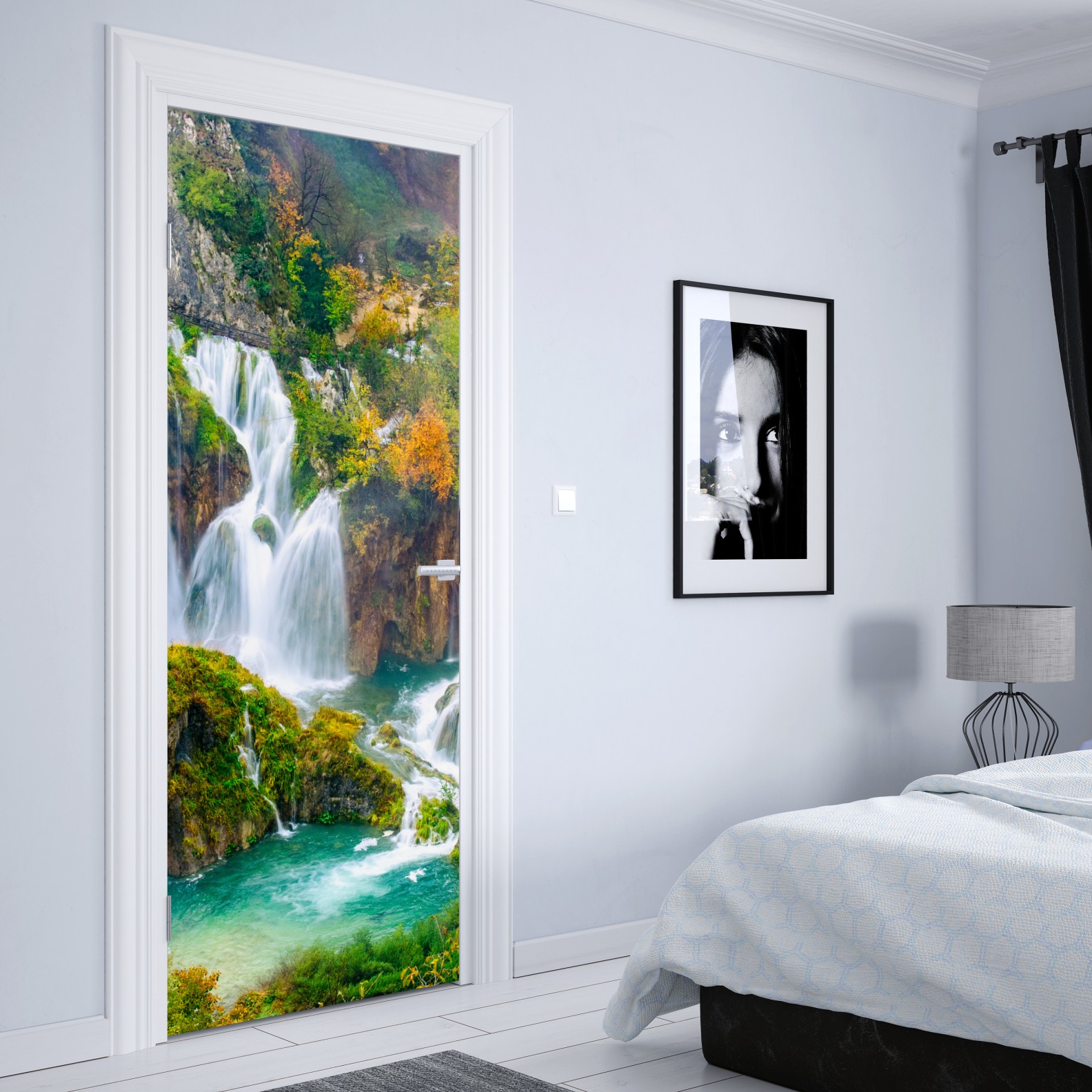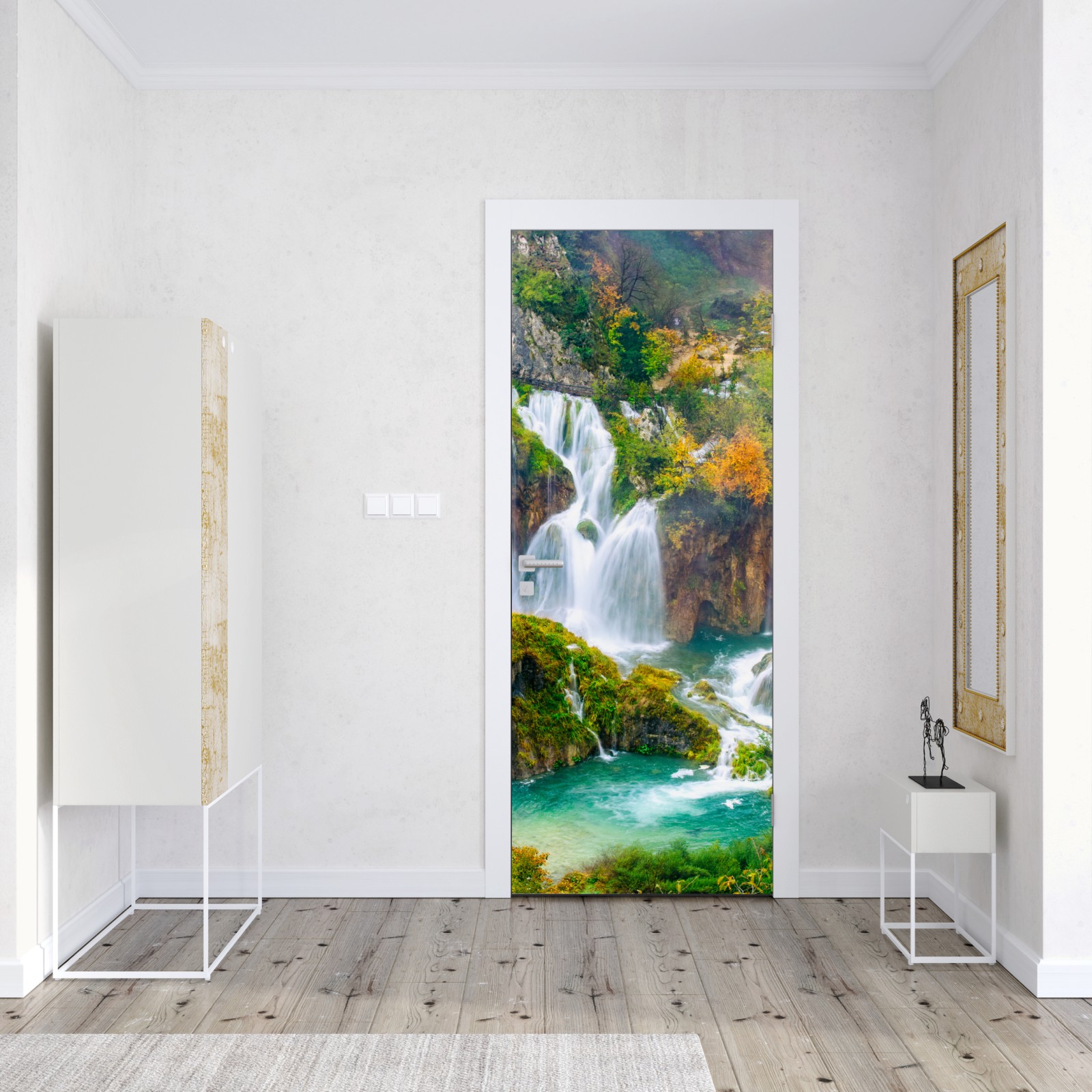 Atemberaubende herbstliche wasserfalllandschaft mit lebhaften farben und kristallklaren türkisbecken, die ruhe und natur in jeden raum bringt.