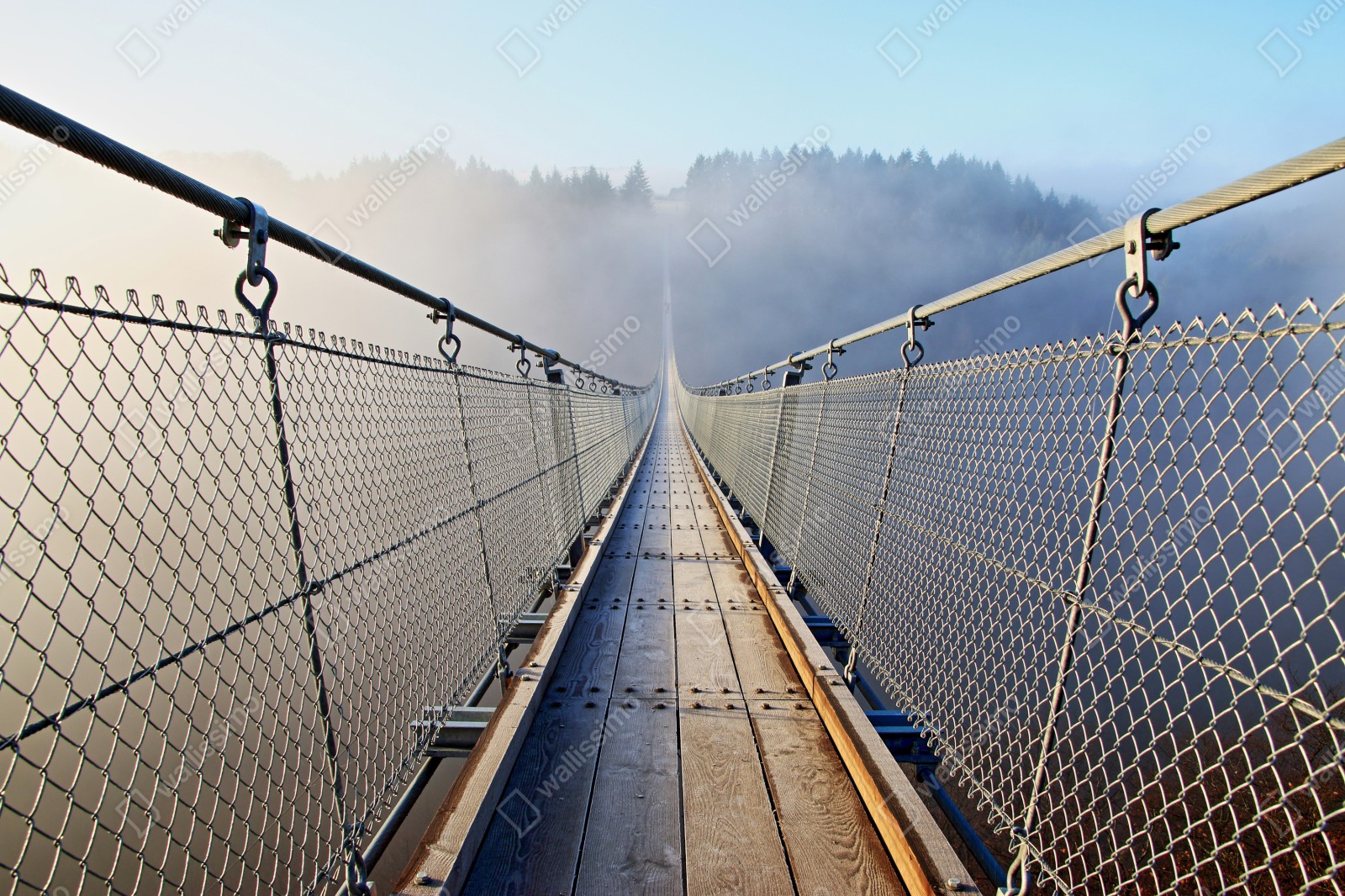 Beeindruckende Perspektive einer nebligen Hängebrücke, die in einen mystischen Wald führt, perfekt, um Tiefe und Ruhe in Ihr Interieur zu bringen.