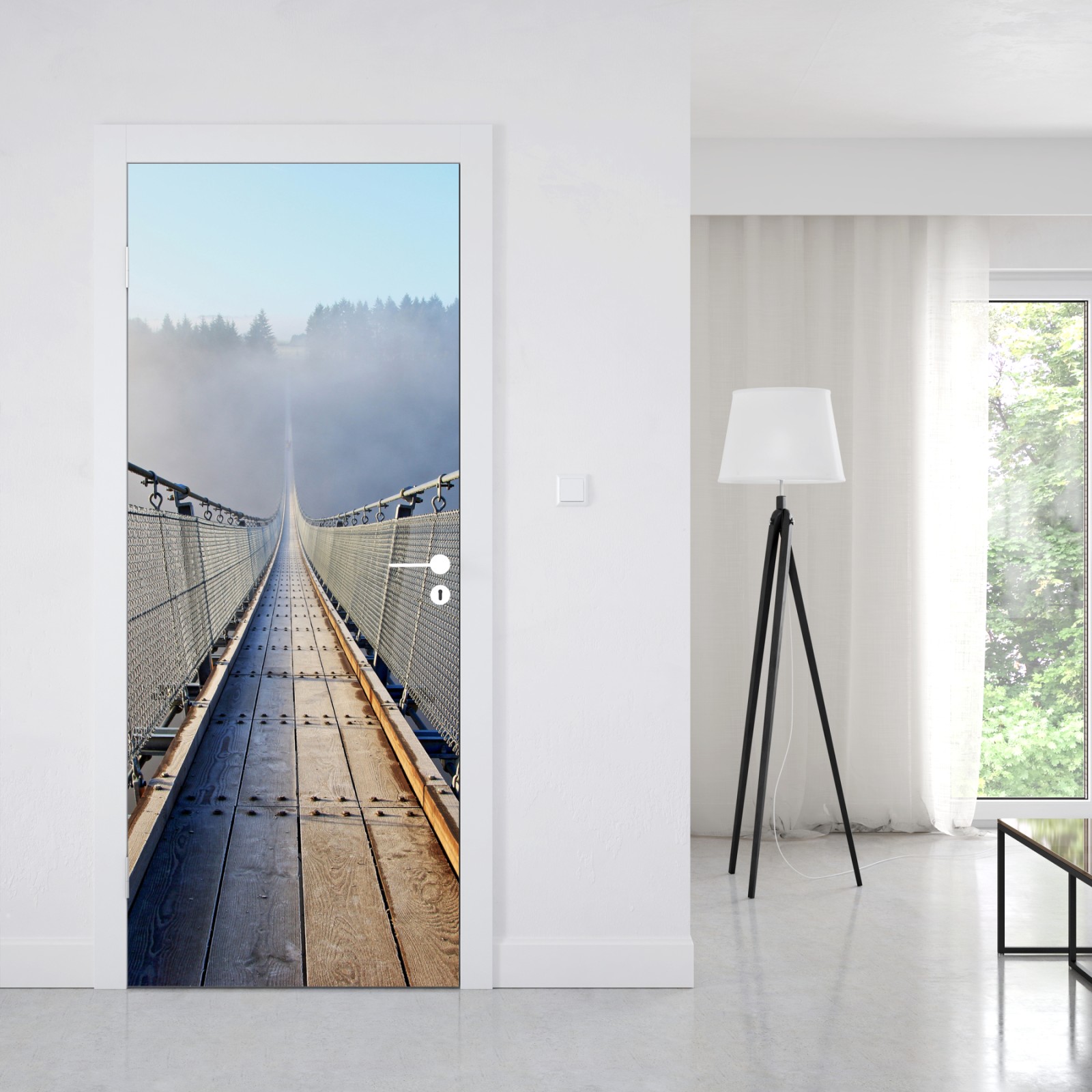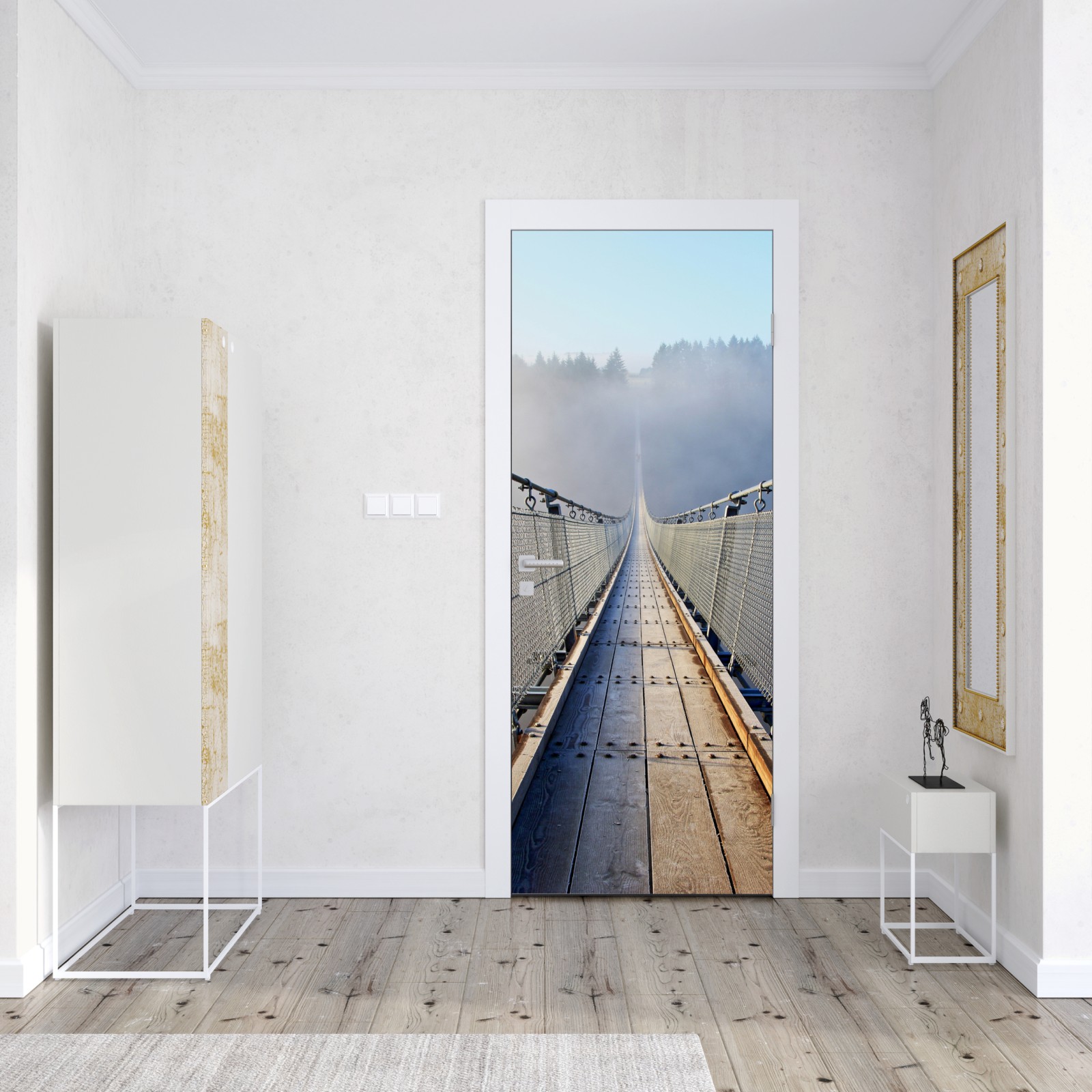 Türaufkleber neblige hängebrücke, die in den wald führt