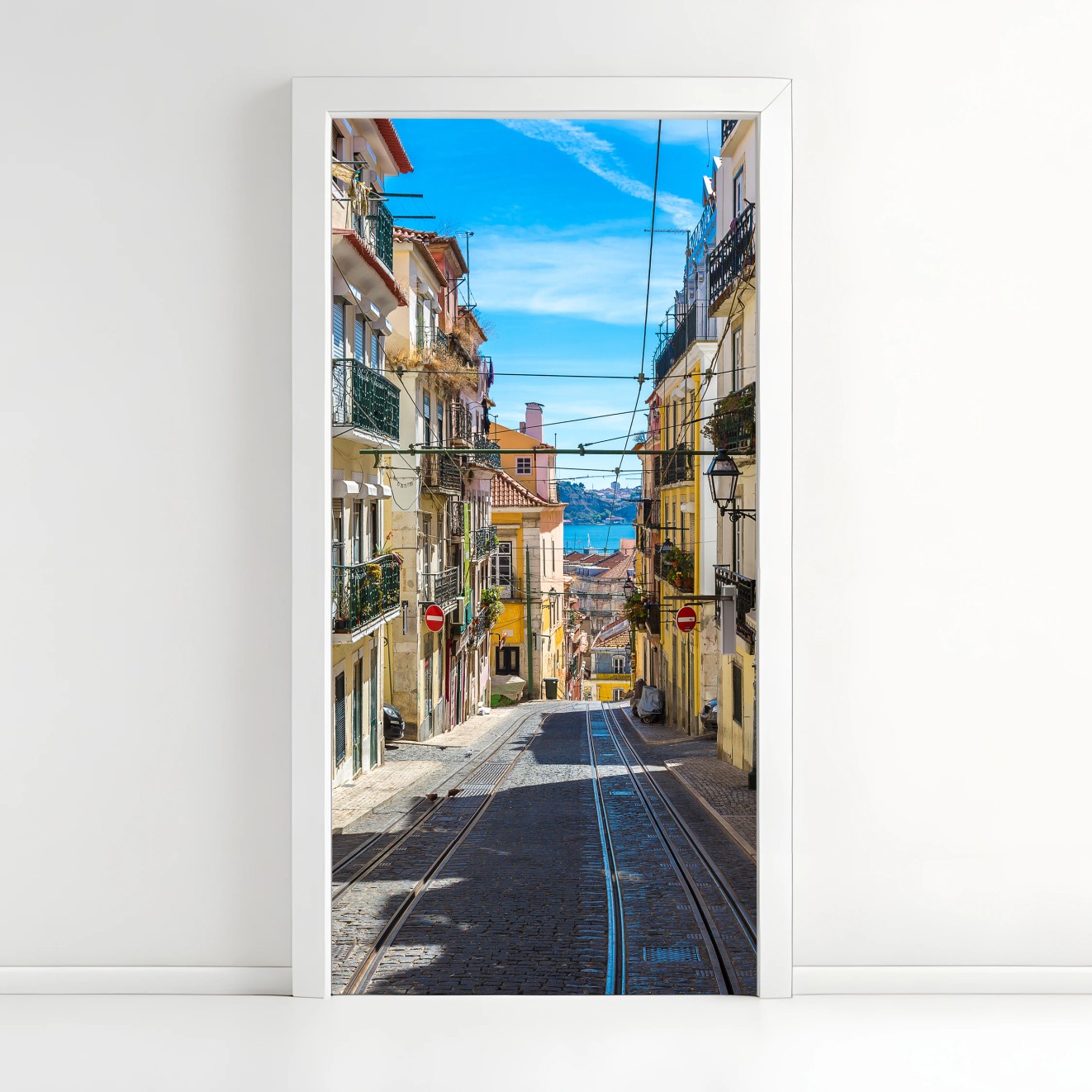 Türaufkleber Alte straße in Lissabon an einem sommerlichen tag