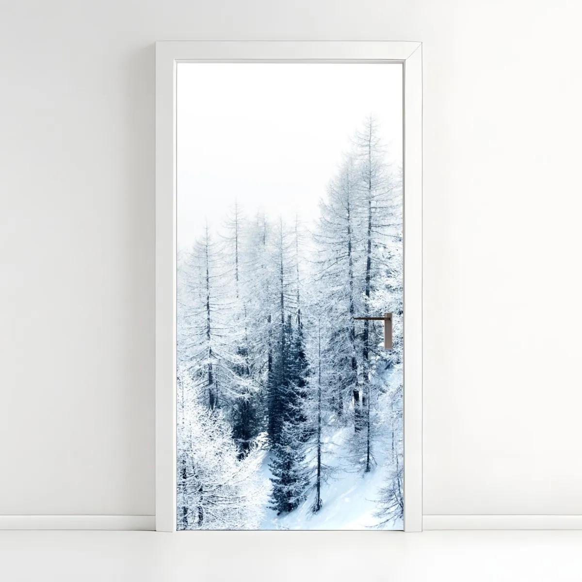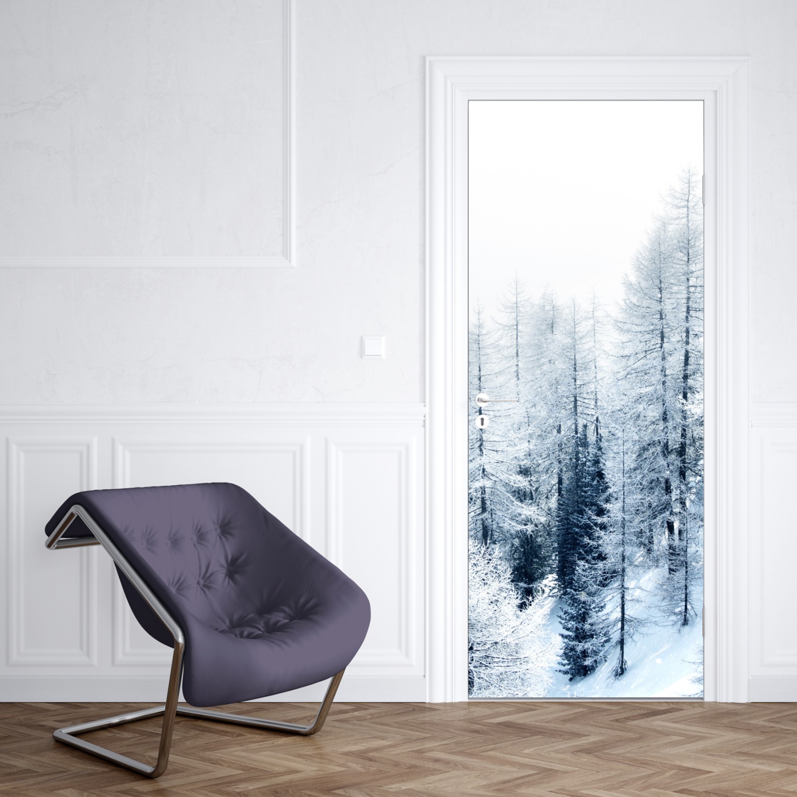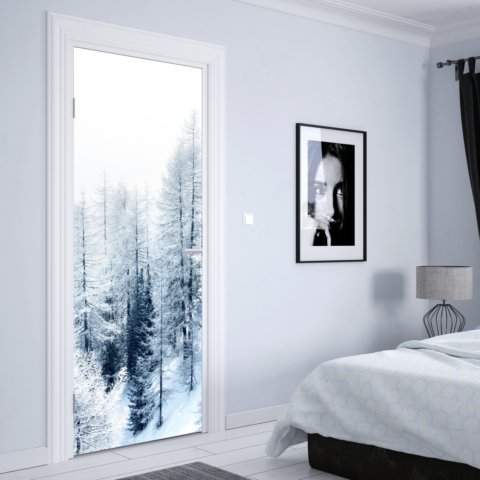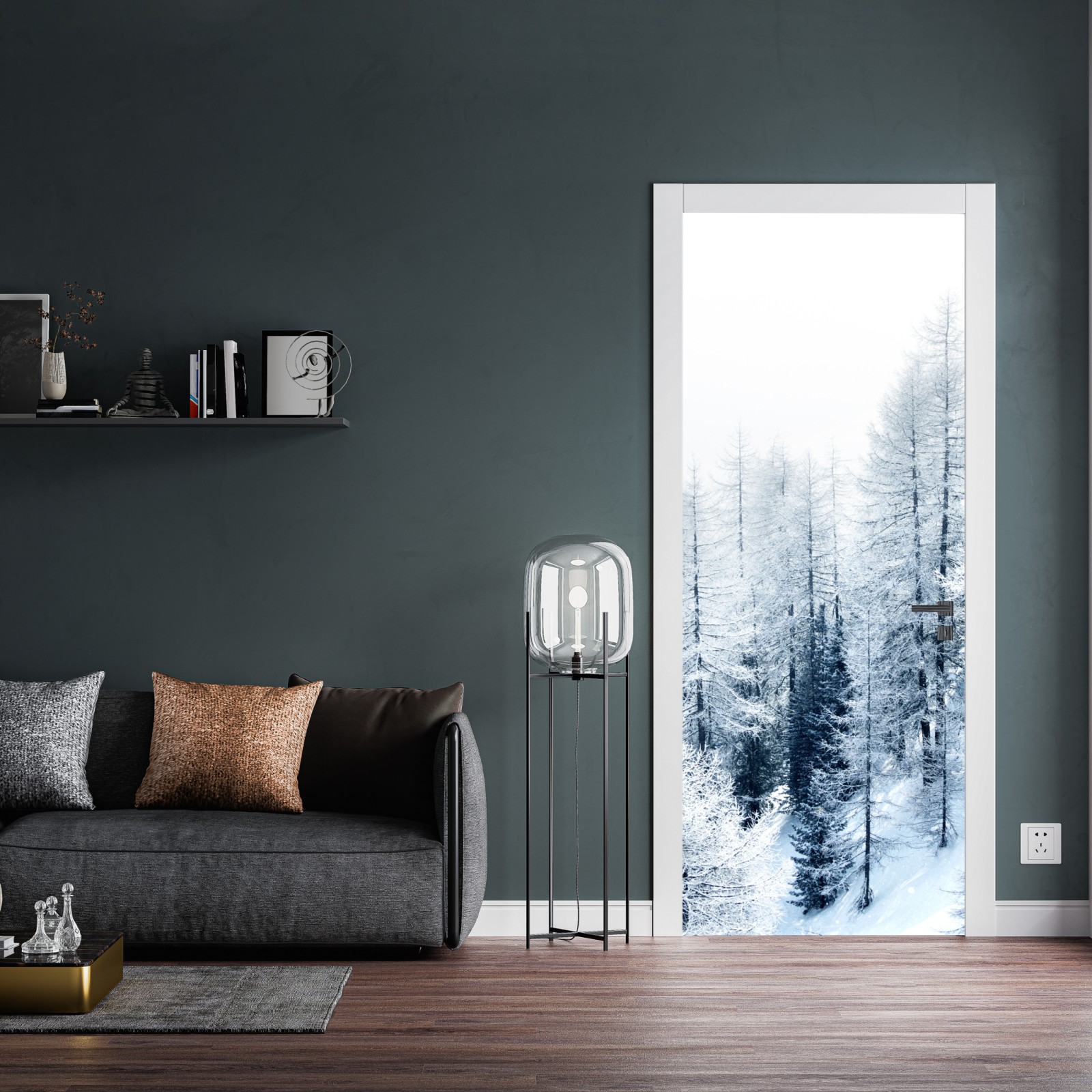 Eine ruhige verschneite Waldlandschaft, die eine kühle, minimalistische Atmosphäre ins Zimmer bringt und gut zu skandinavischem Design passt.