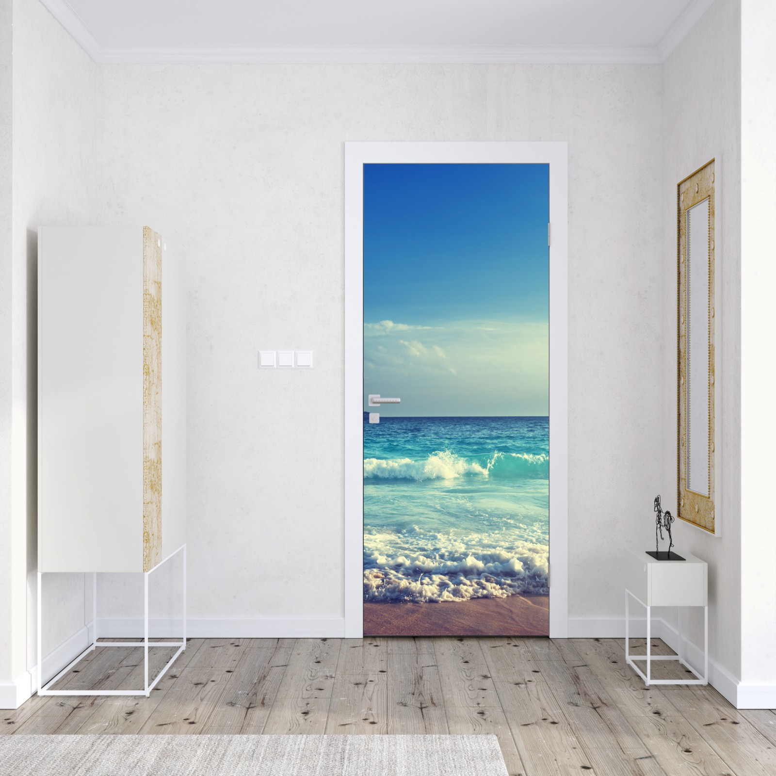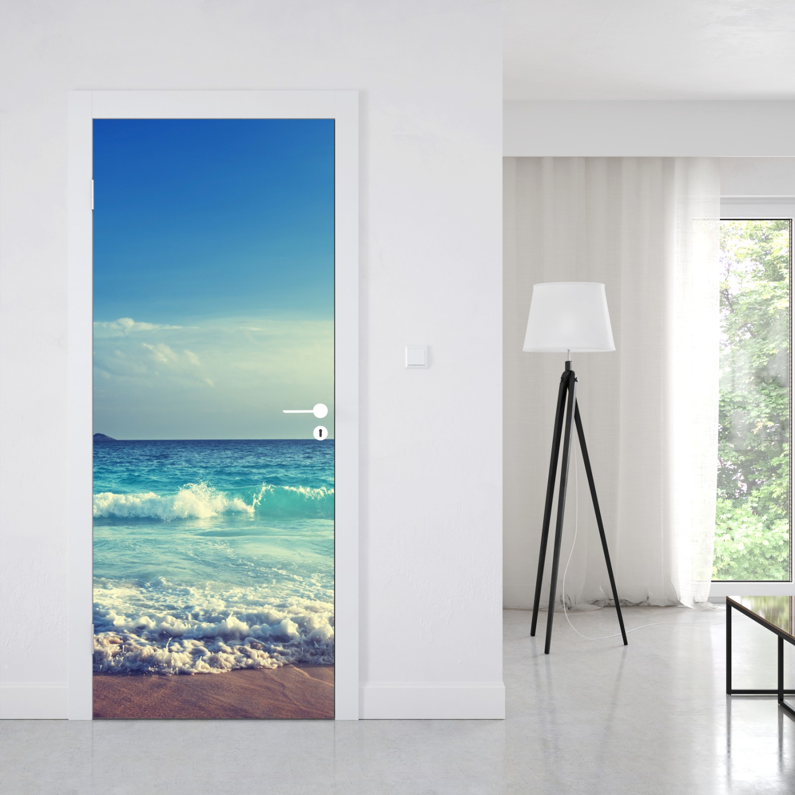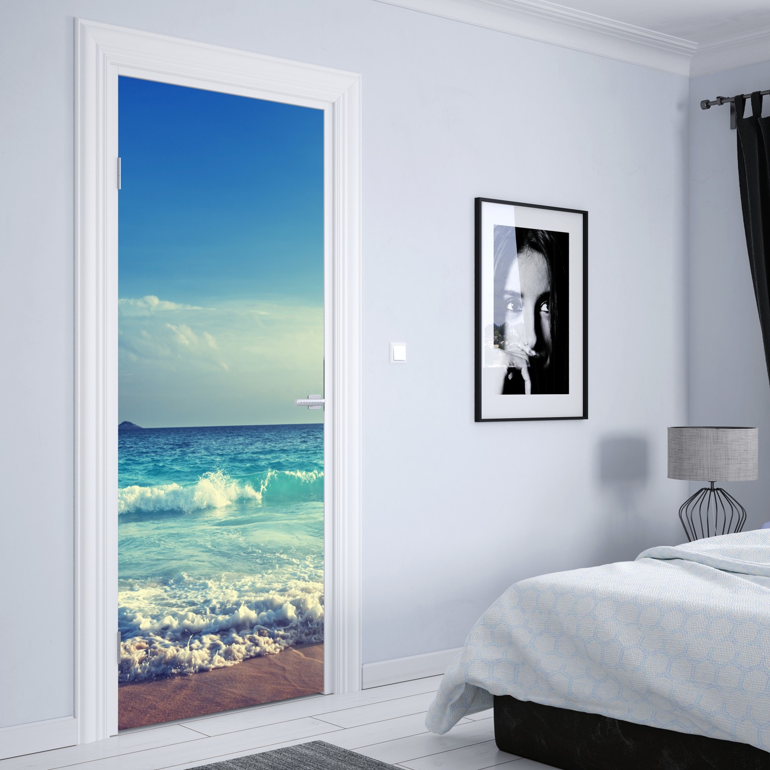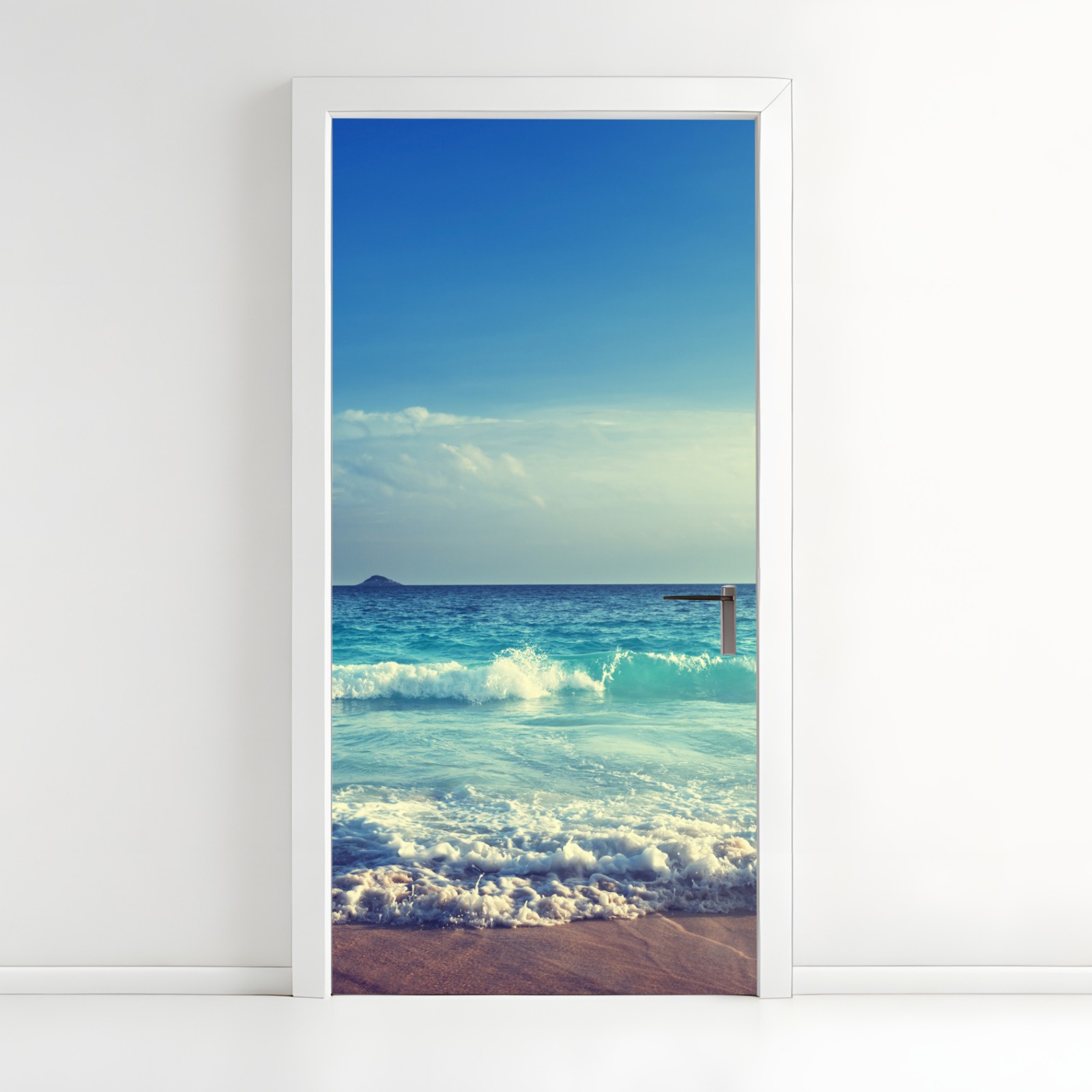 Türaufkleber strand auf den Seychellen bei sonnenuntergang