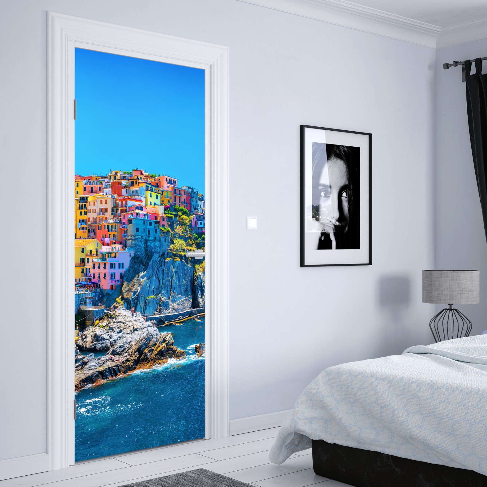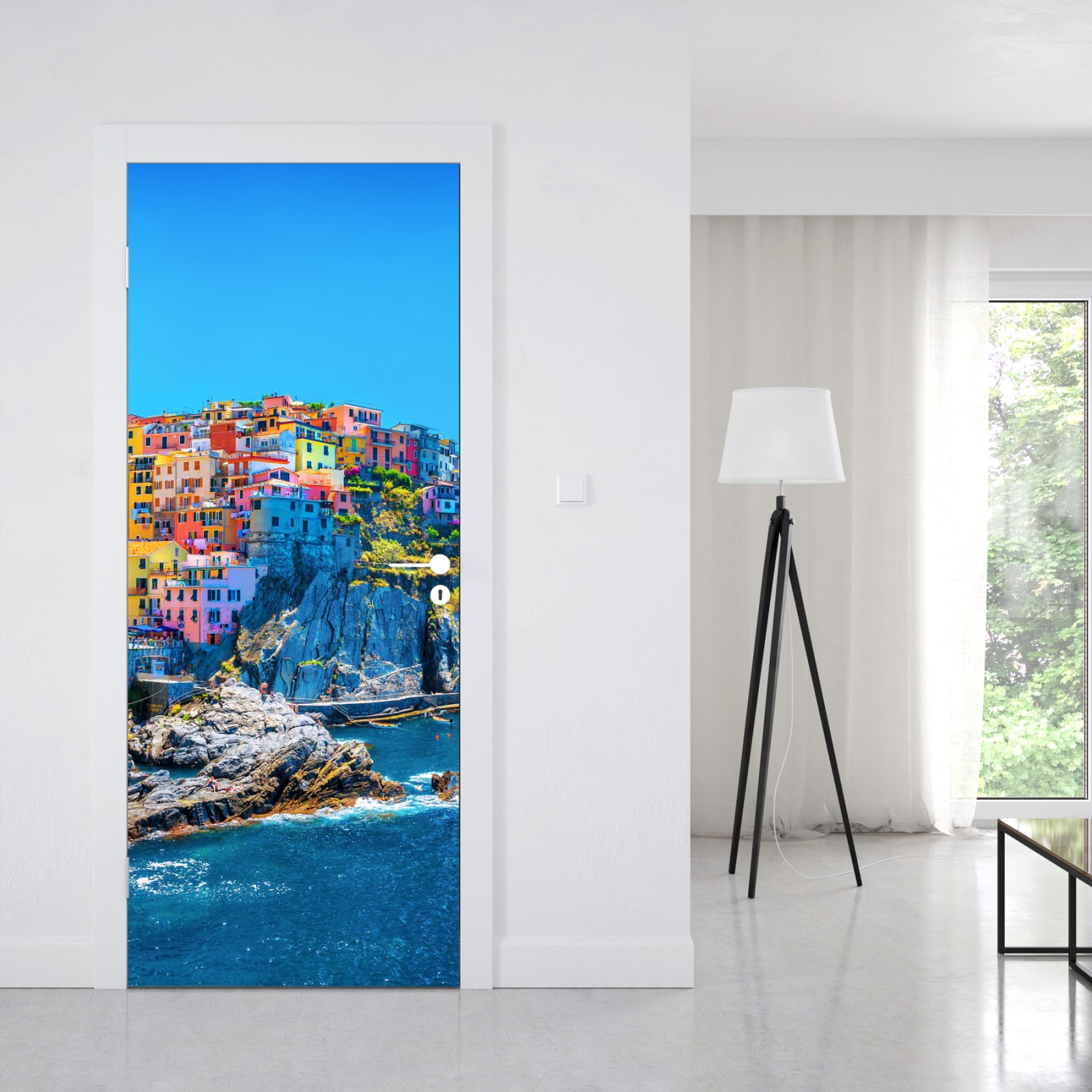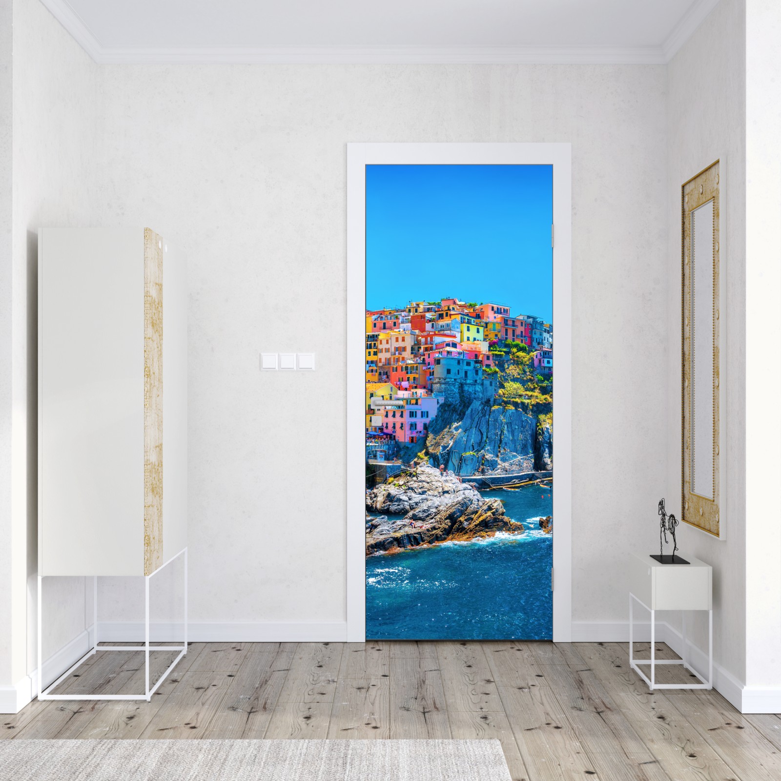 Türaufkleber farbenfrohes dorf am klippenmeer
