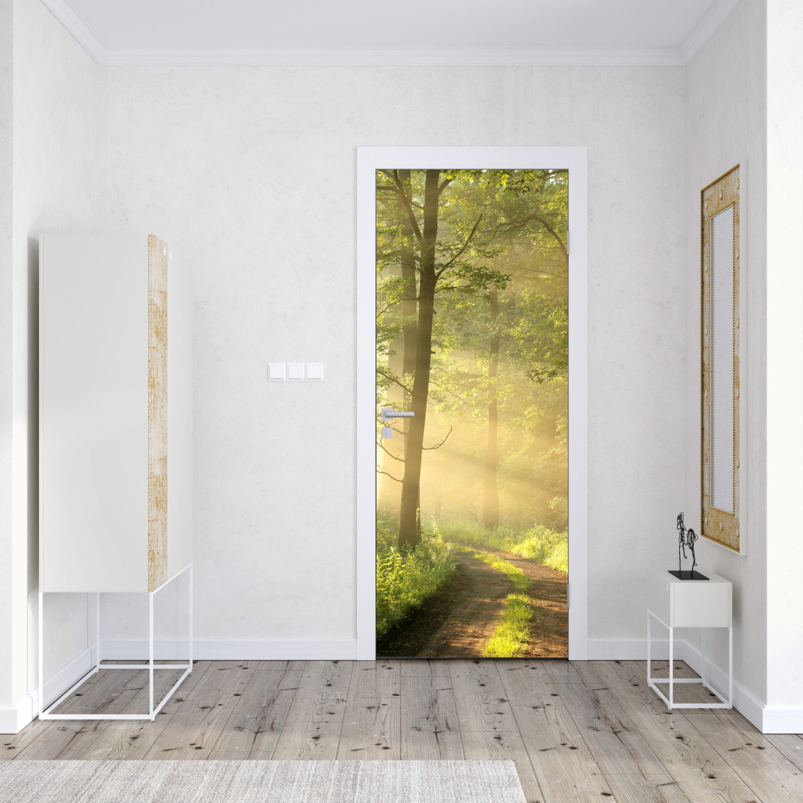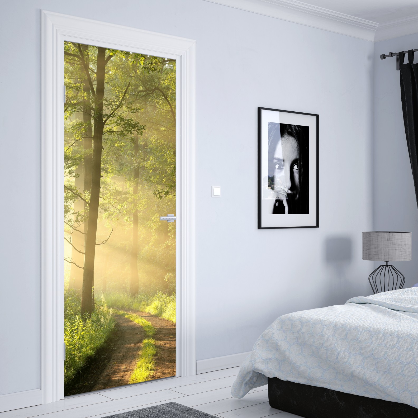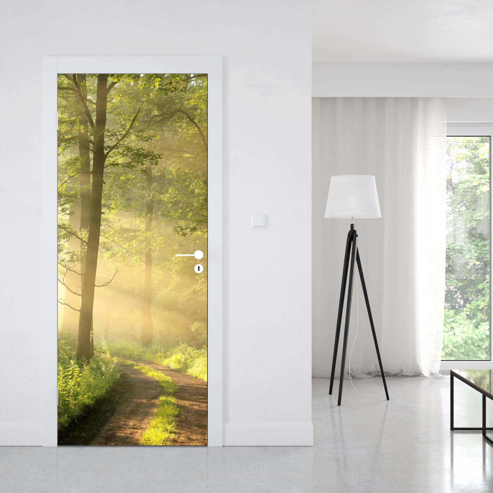 Ein ruhiger Waldweg im warmen Morgenlicht, der natürliche Ruhe und frische grüne Töne in Ihren Raum bringt.