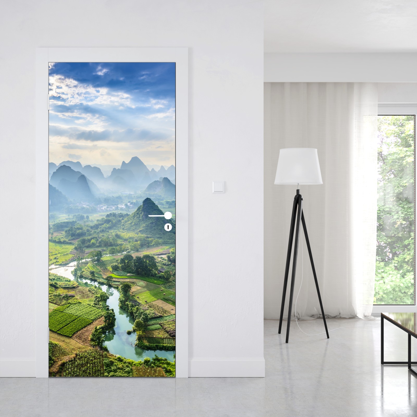 Türaufkleber nebliges karsttal bei sonnenaufgang