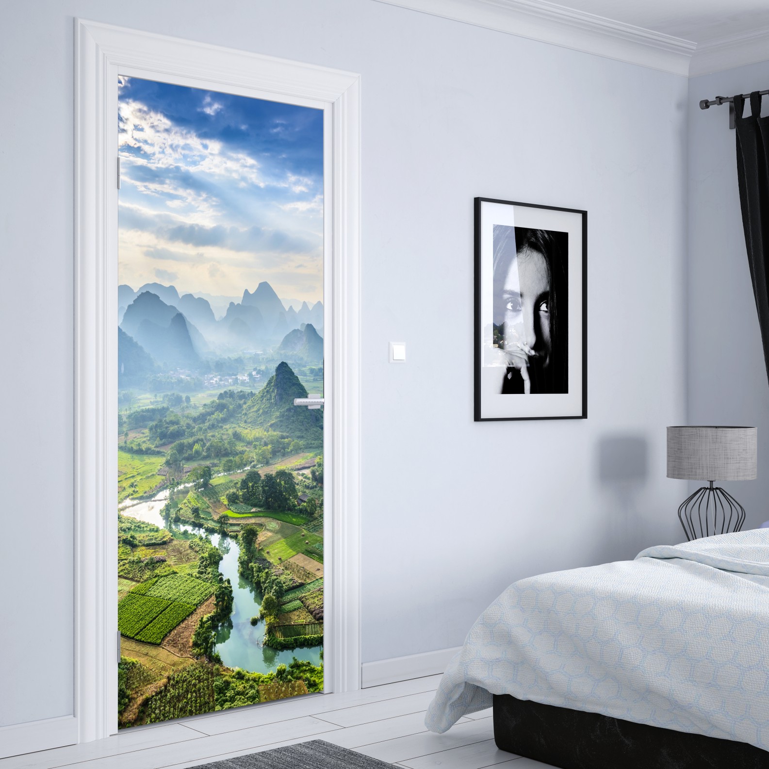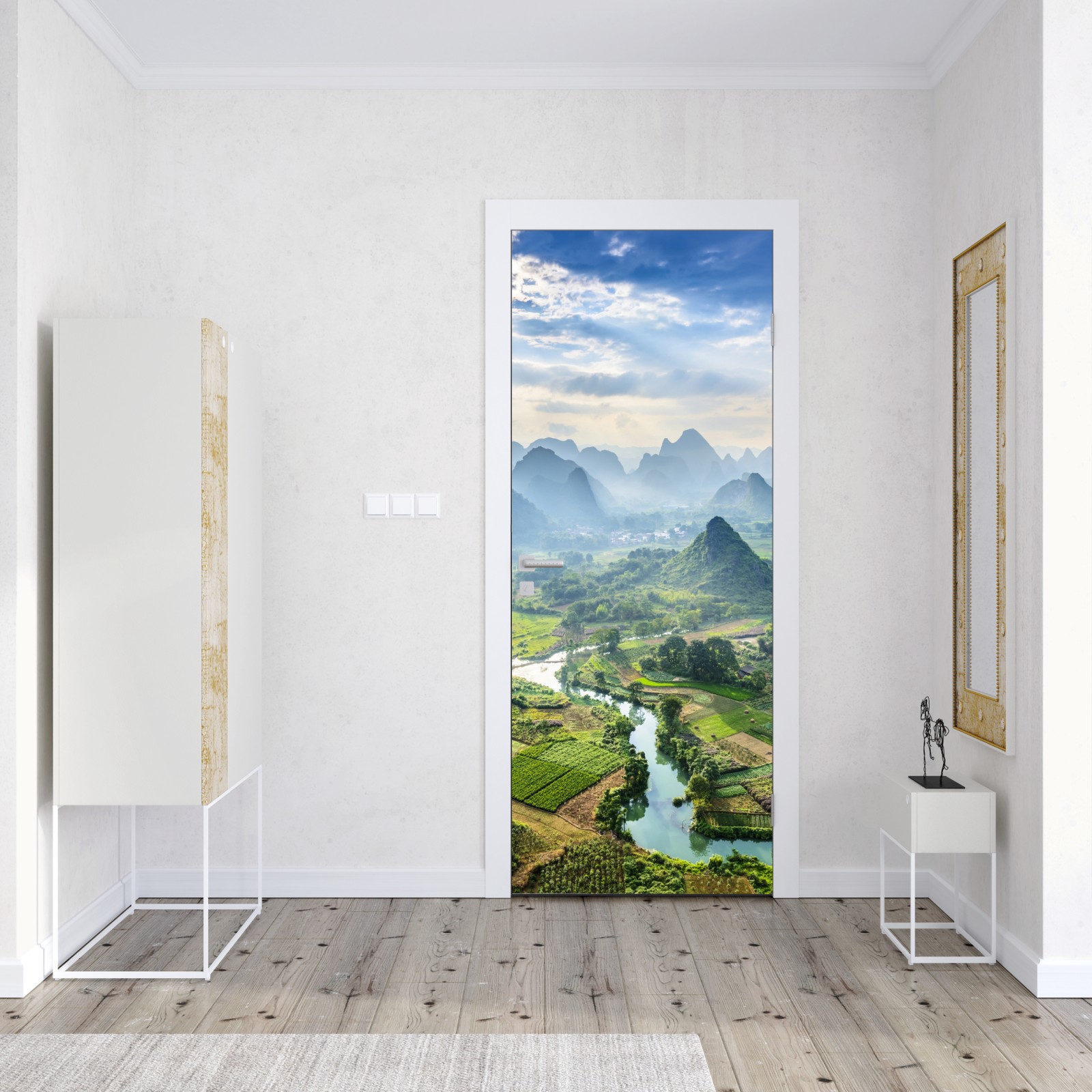 Ein ruhiges Panorama mit nebligen Karstgipfeln, mäandrierenden Flüssen und grünen Feldern, das natürliche Harmonie in jeden Raum bringt.