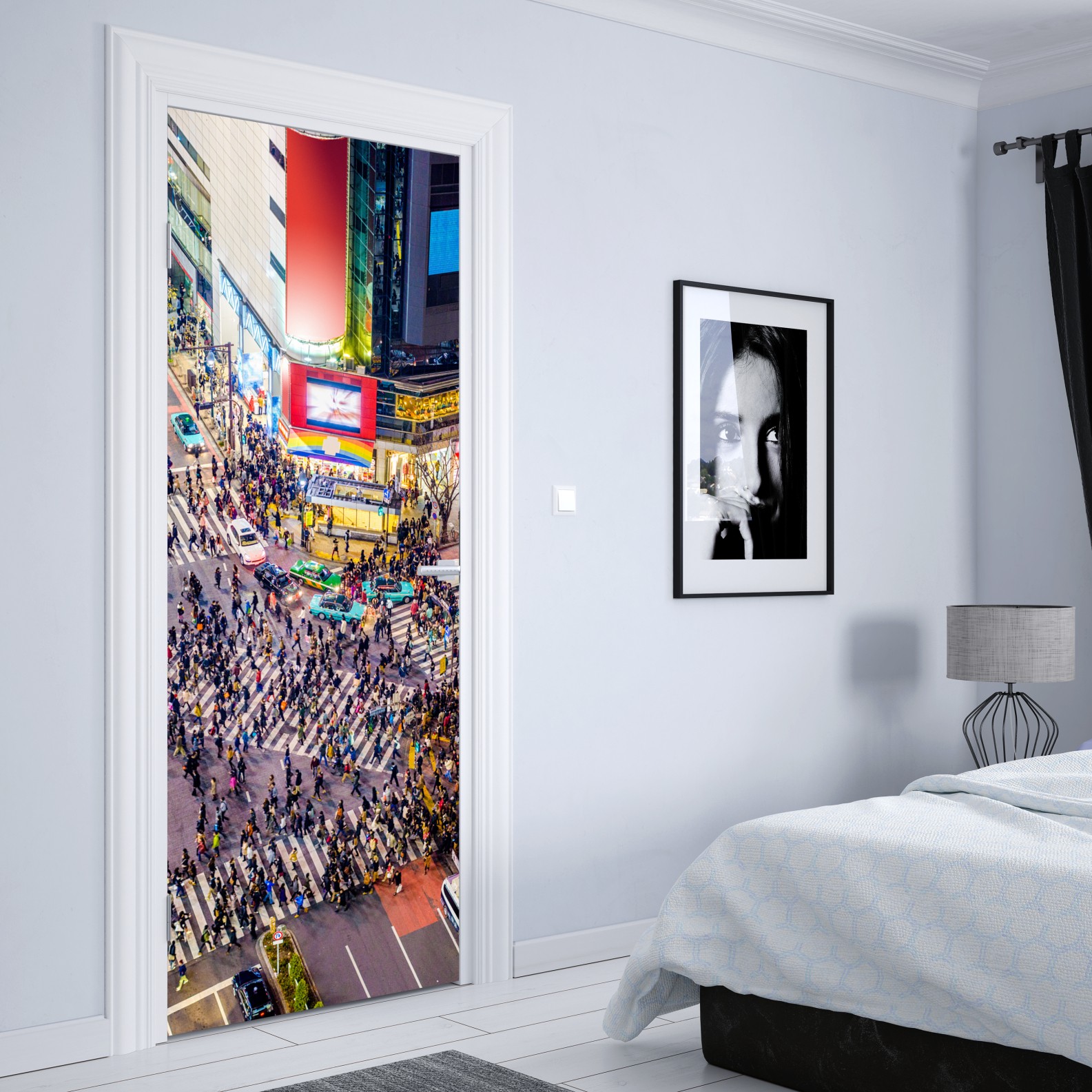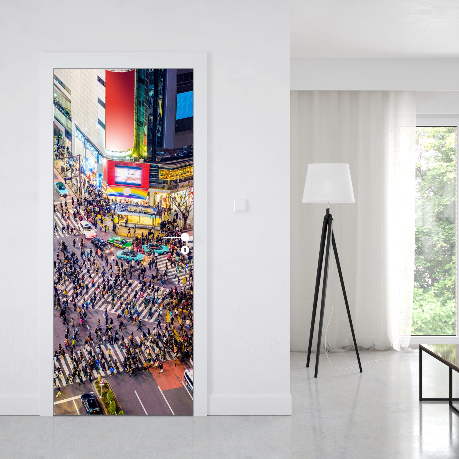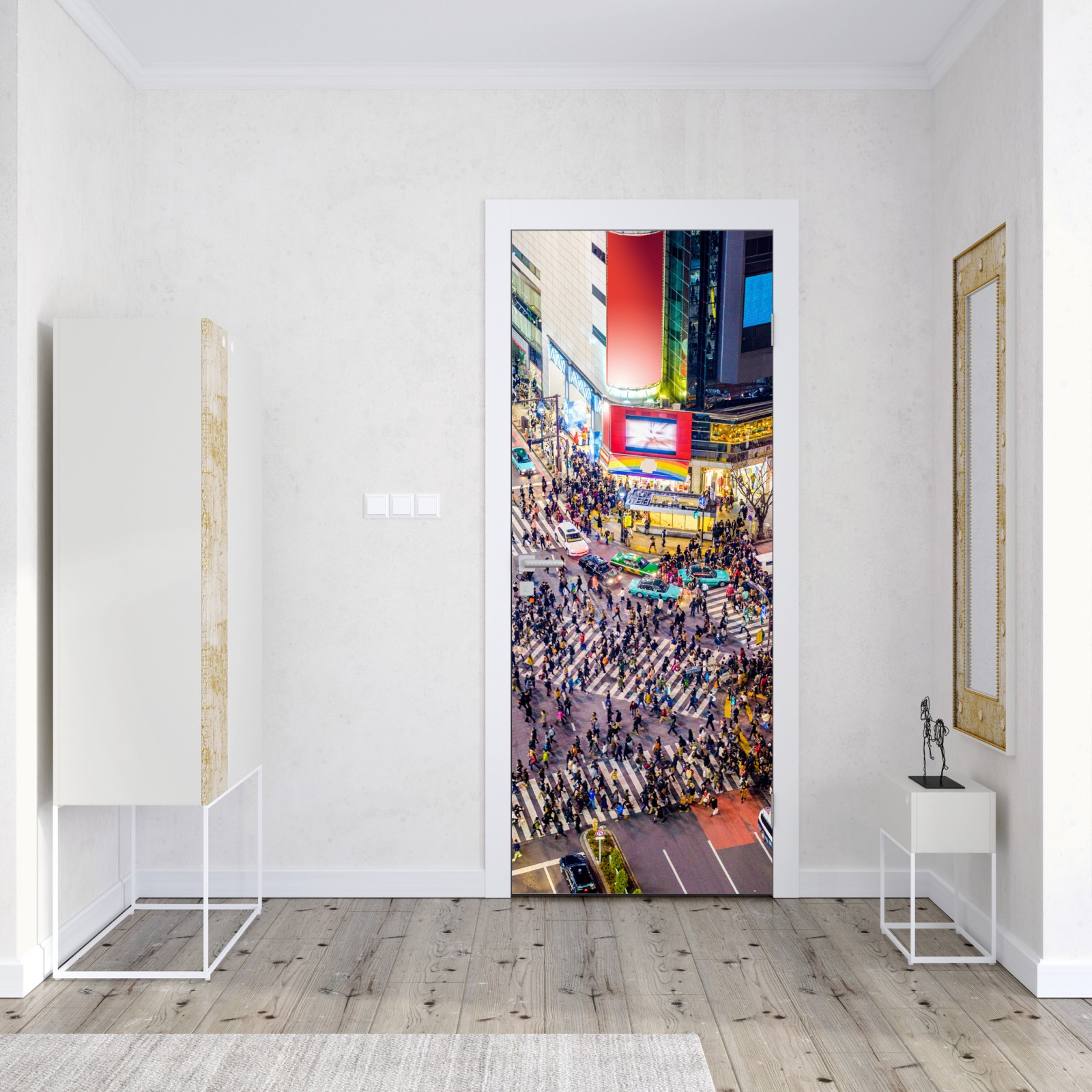Lebendige Luftaufnahme der Shibuya-Kreuzung, die die Energie des nächtlichen Tokios einfängt und jedem Raum urbanes Flair verleiht.