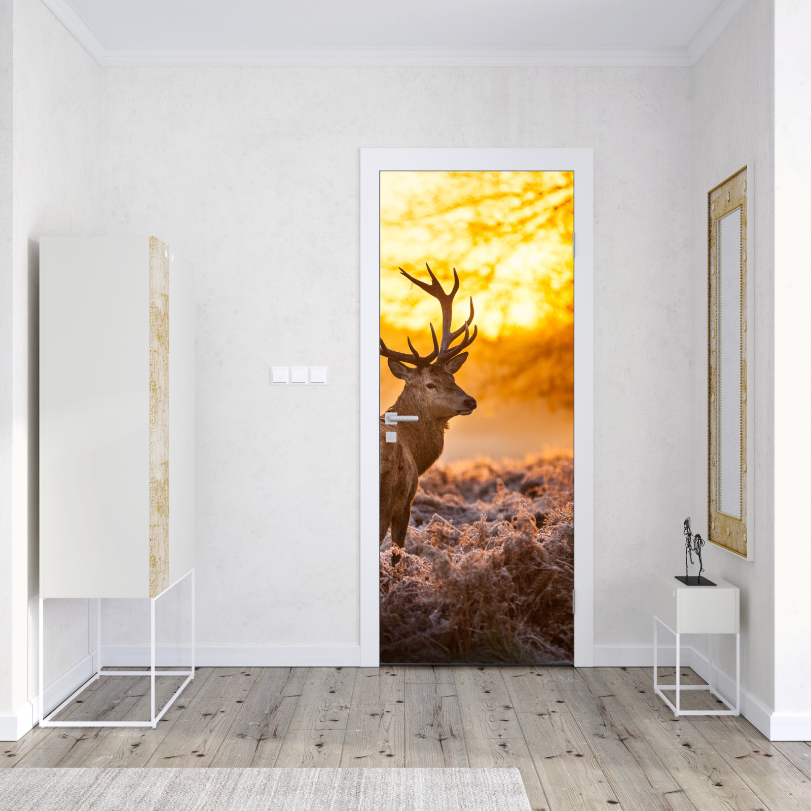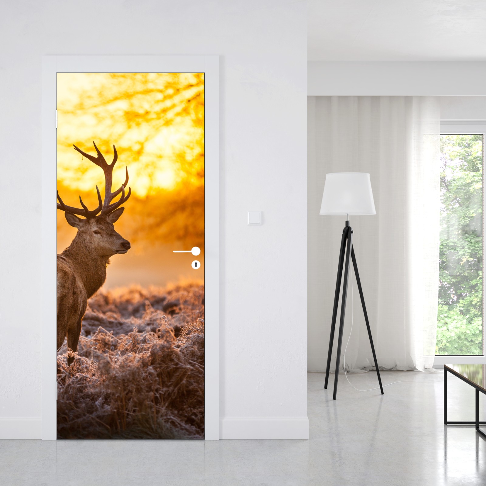 ein beeindruckendes naturfoto eines hirschs im goldenen licht des sonnenaufgangs, perfekt um ruhe und natur in ihr zuhause zu bringen.