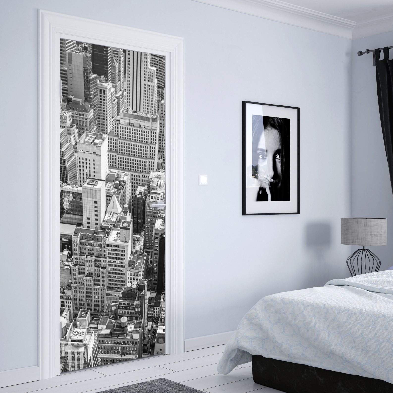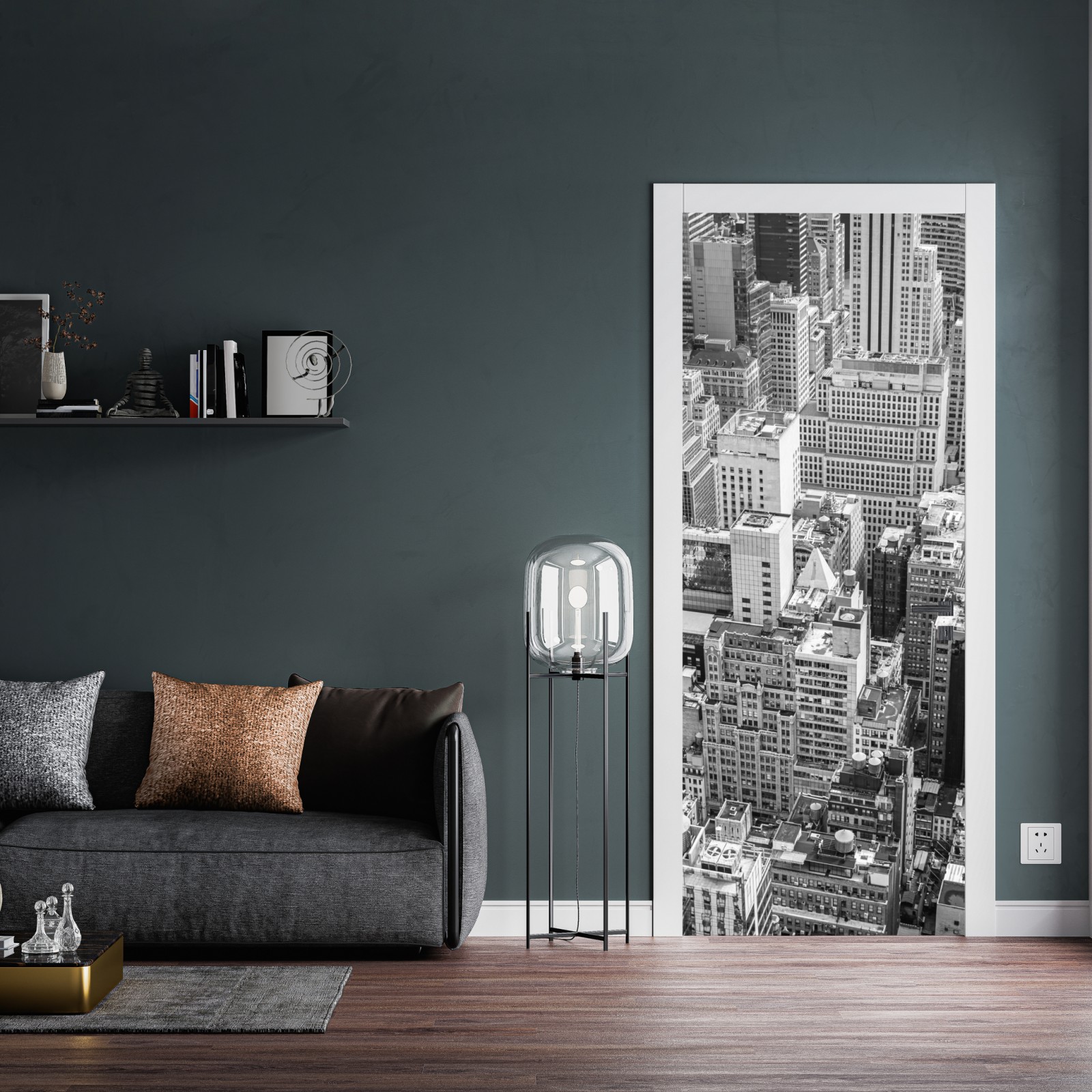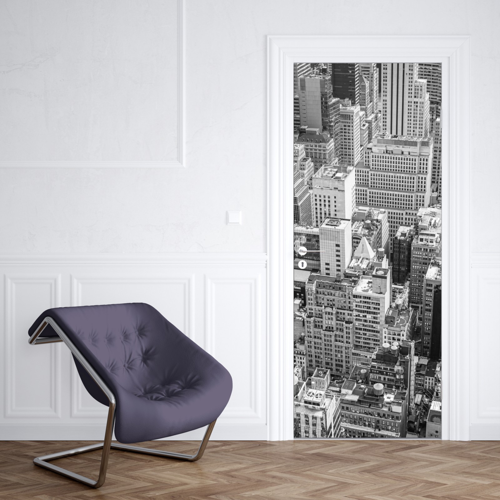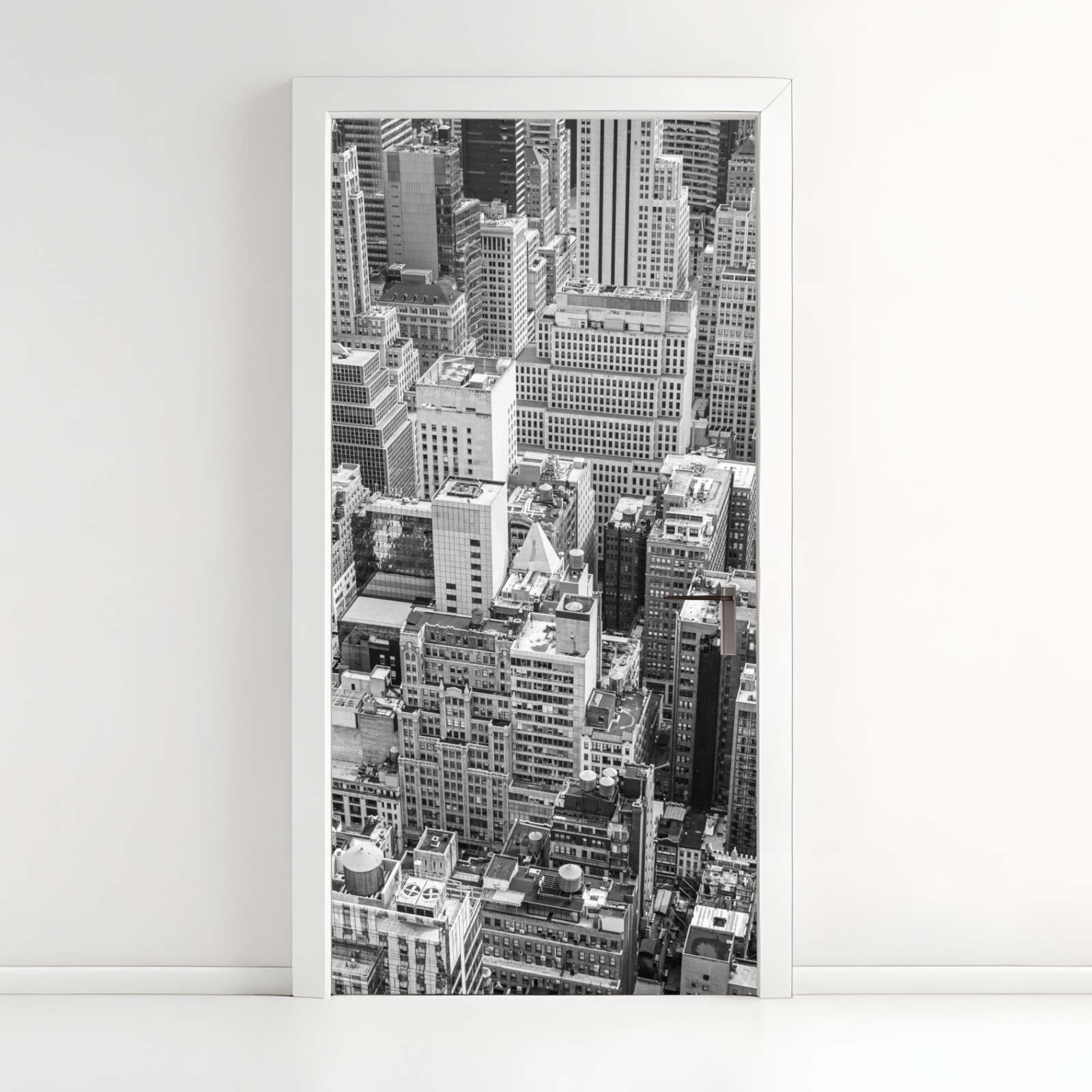 Türaufkleber luftaufnahme einer städtischen skyline in schwarzweiß