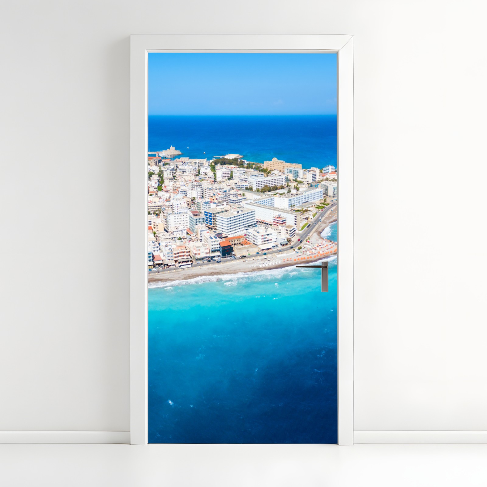 Lebendige Luftaufnahme der Küste von Rhodos mit türkisblauem Meer und sonniger Stadtansicht, ideal zur Aufwertung Ihres Wohnraums.