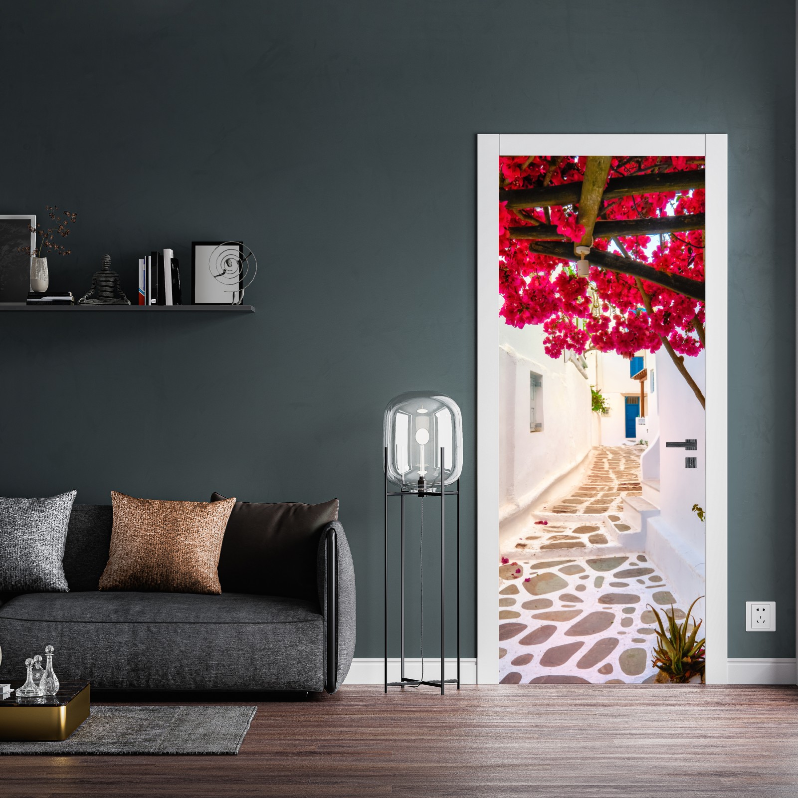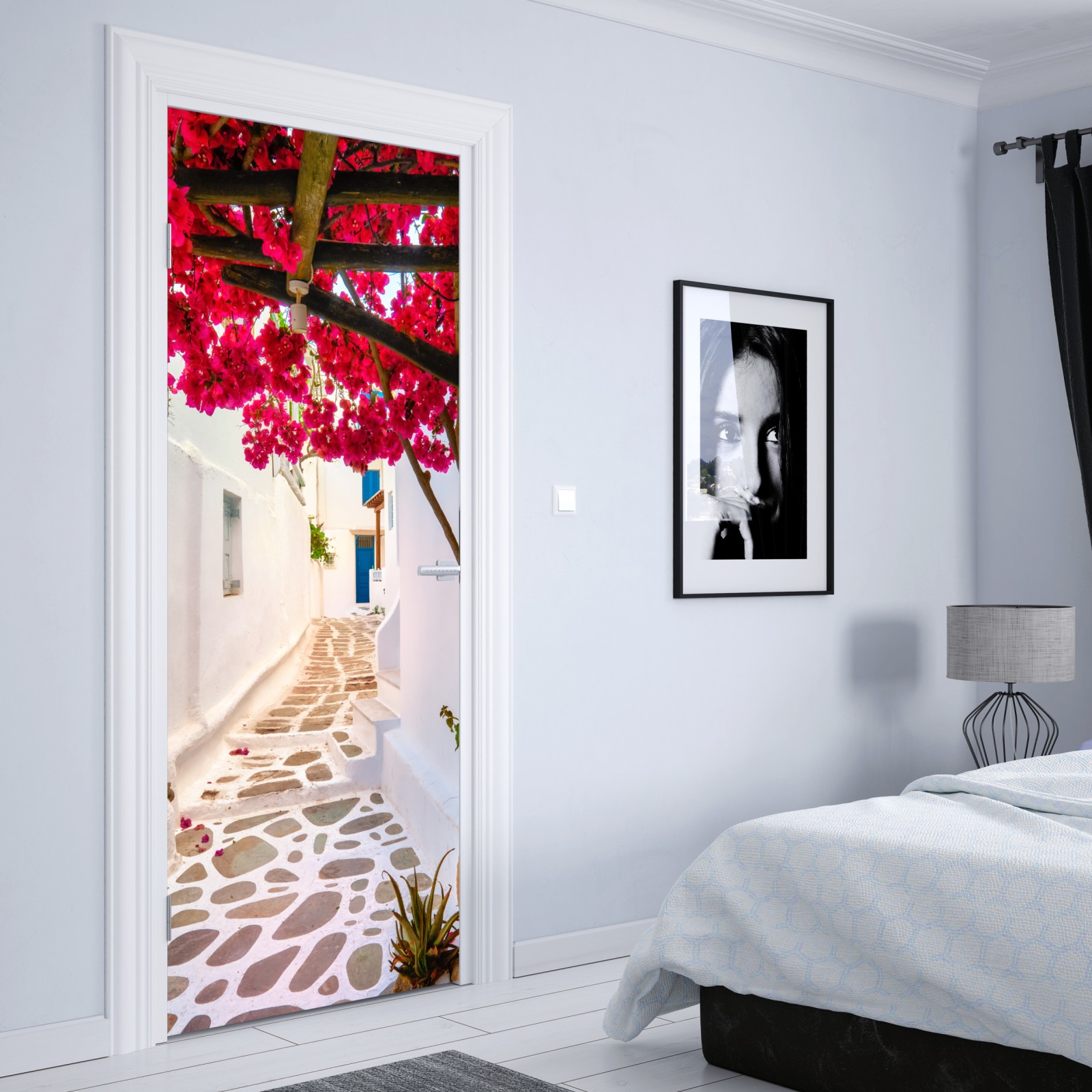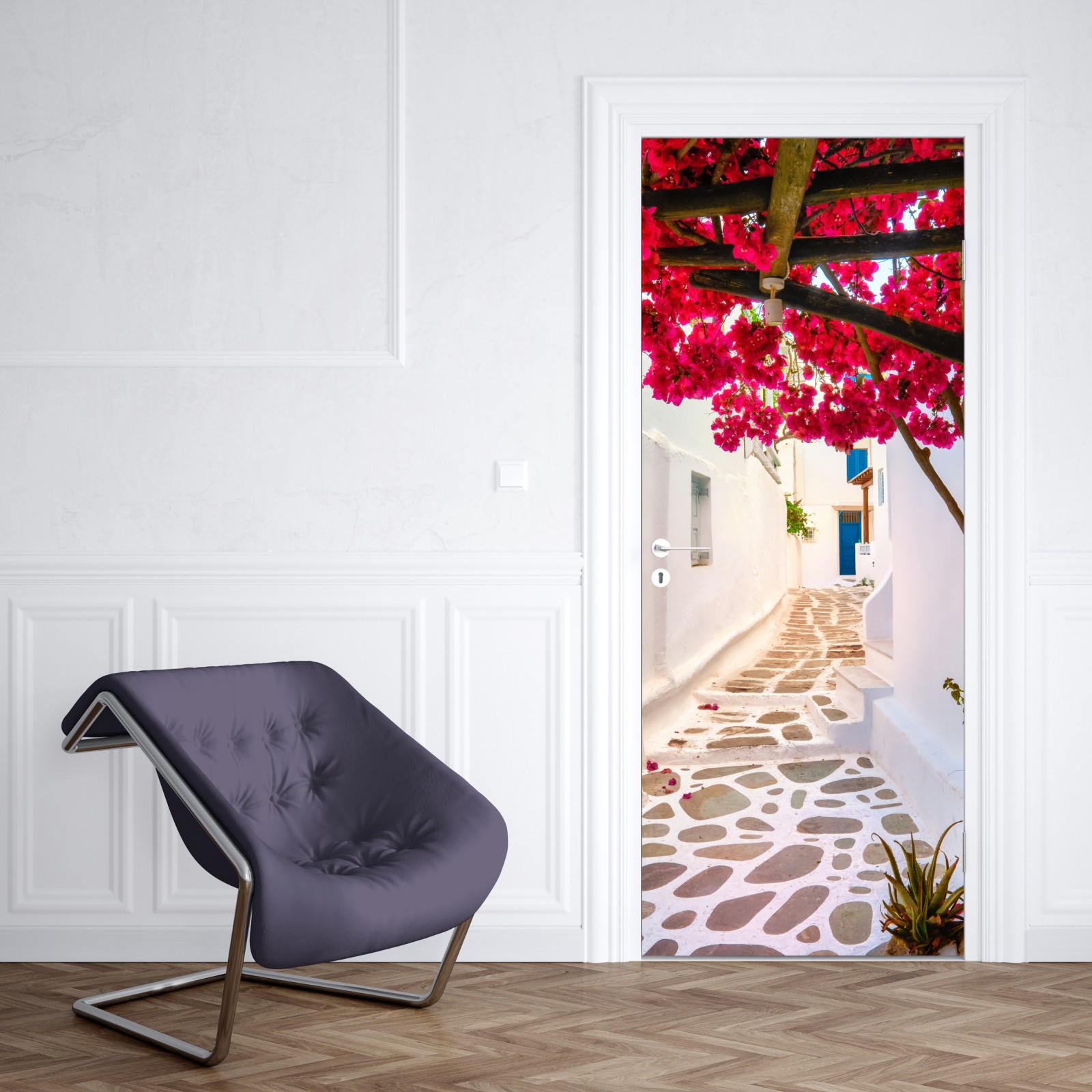 Türaufkleber sonnige gasse in Griechenland mit bougainvillea