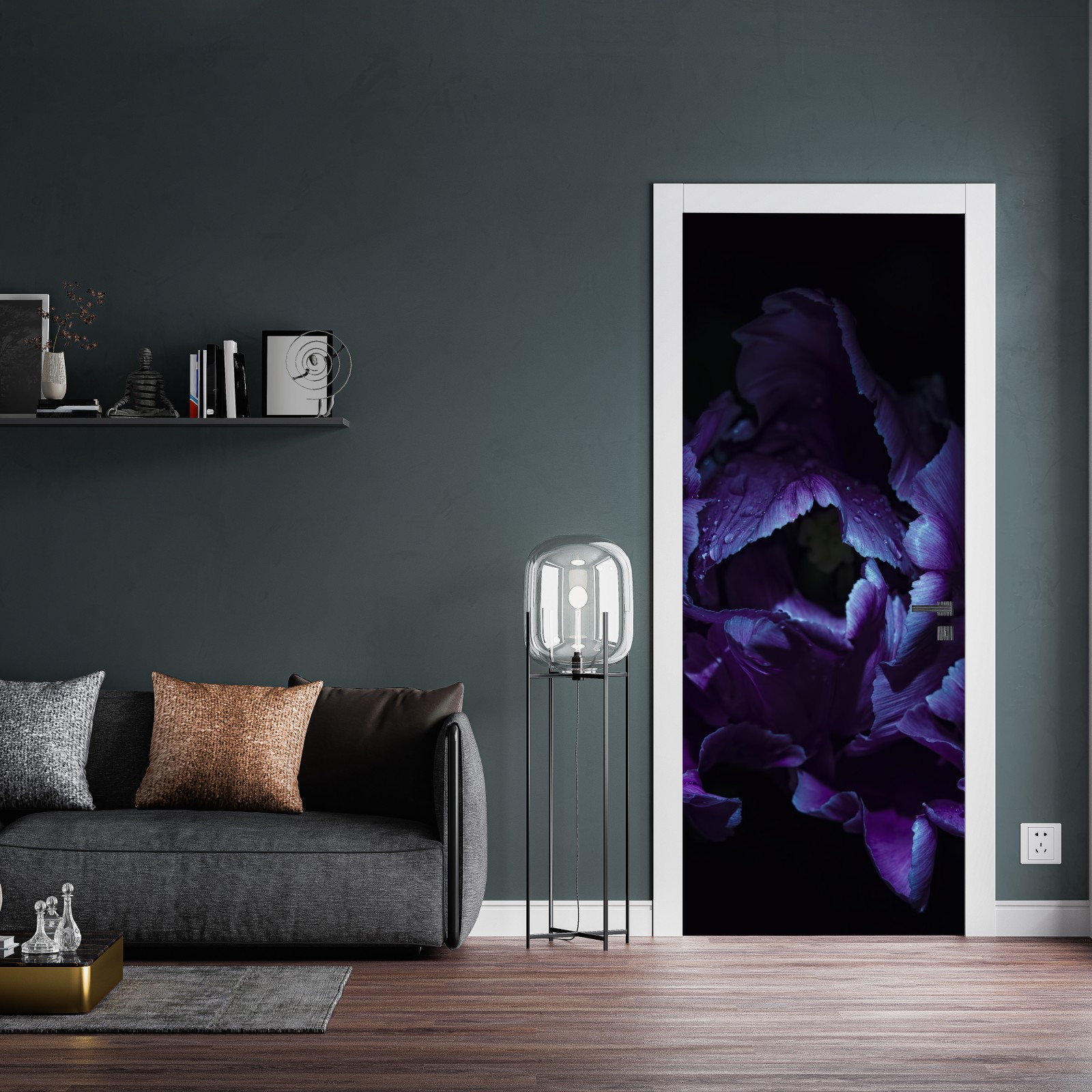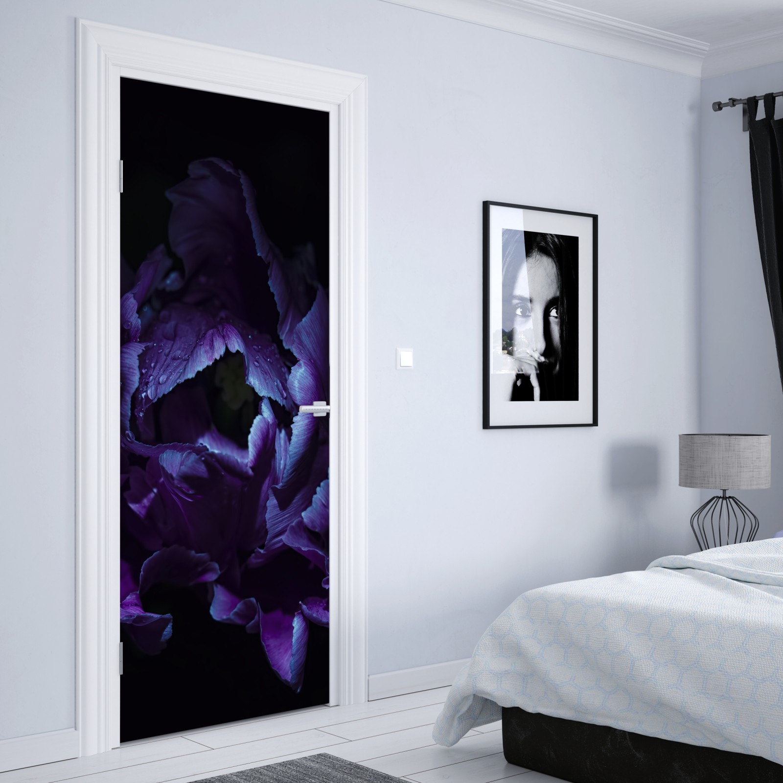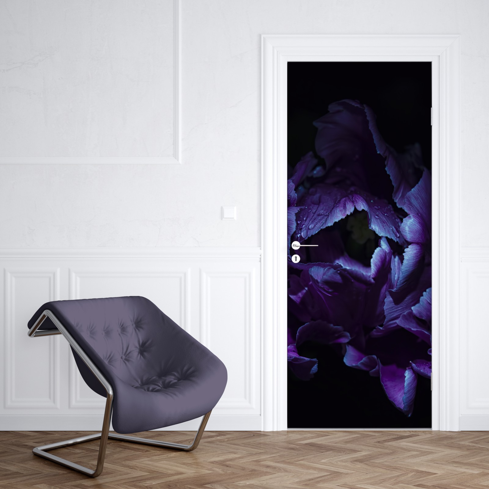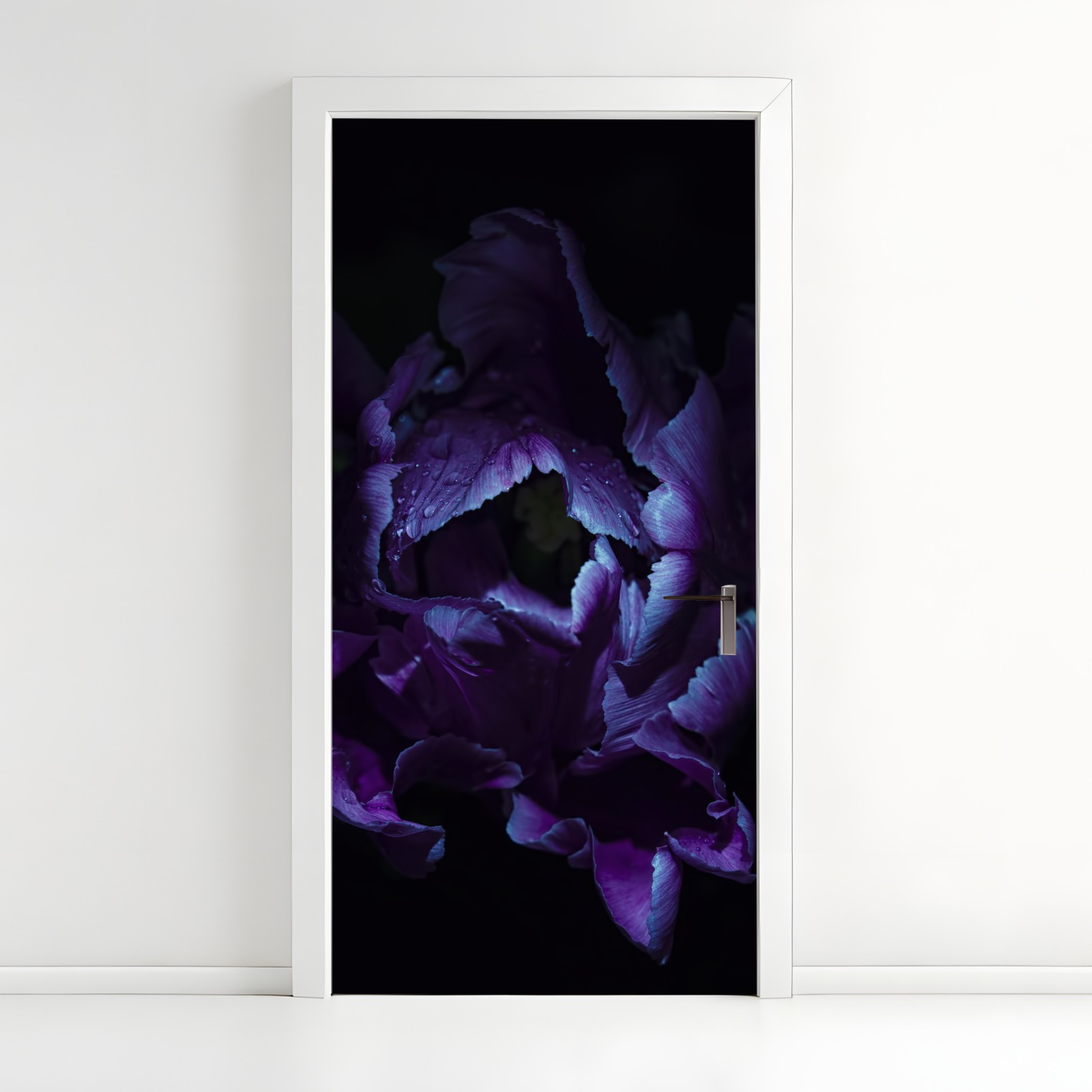 Bringen Sie dramatische florale Schönheit in den Raum mit einer Nahaufnahme einer lila Tulpe im ultravioletten Licht, die Tautropfen und feine Texturen vor dunklem Hintergrund hervorhebt.