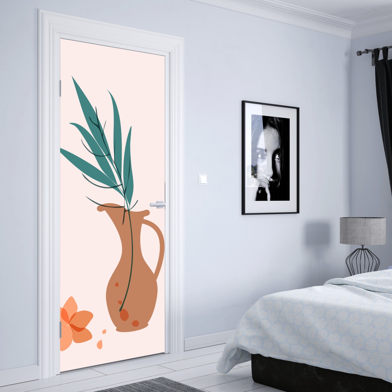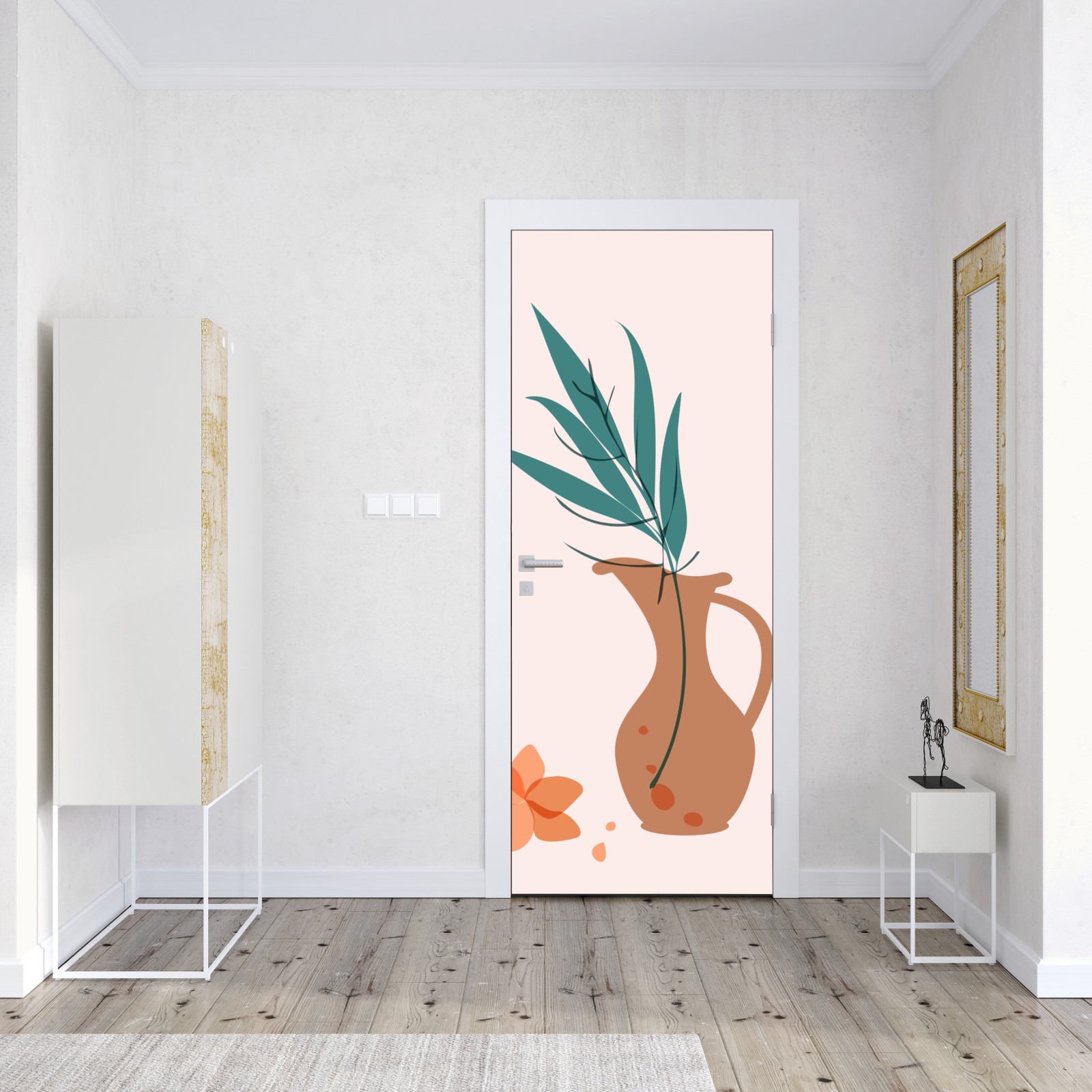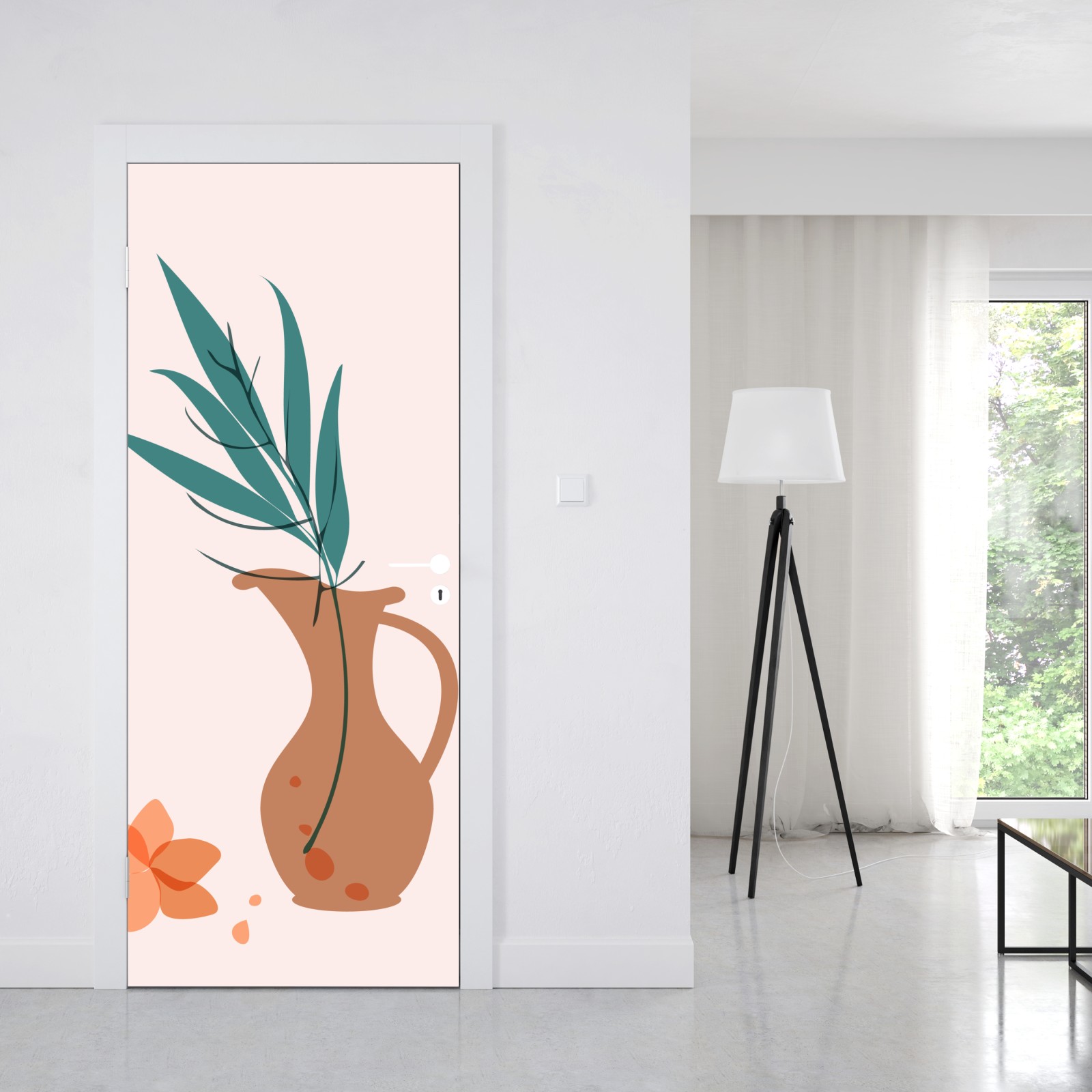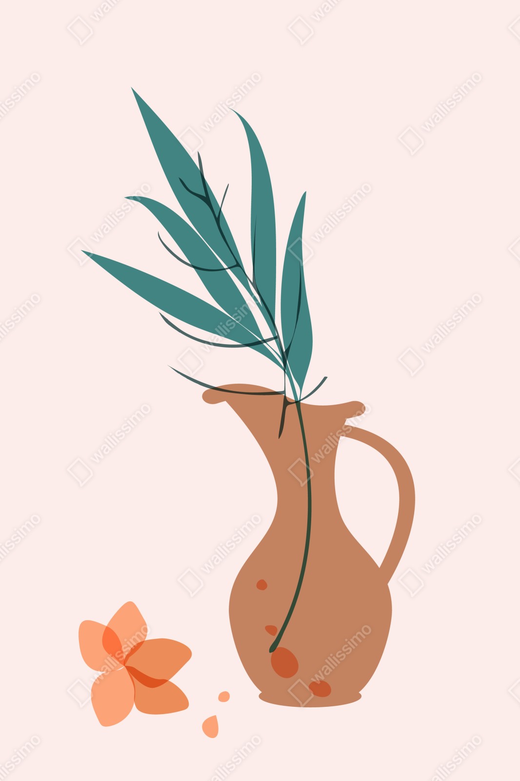 Fügen Sie Ihrem Raum einen beruhigenden botanischen Akzent hinzu mit dieser pastellfarbenen Illustration einer terrakottafarbenen Vase und grünen Blättern.