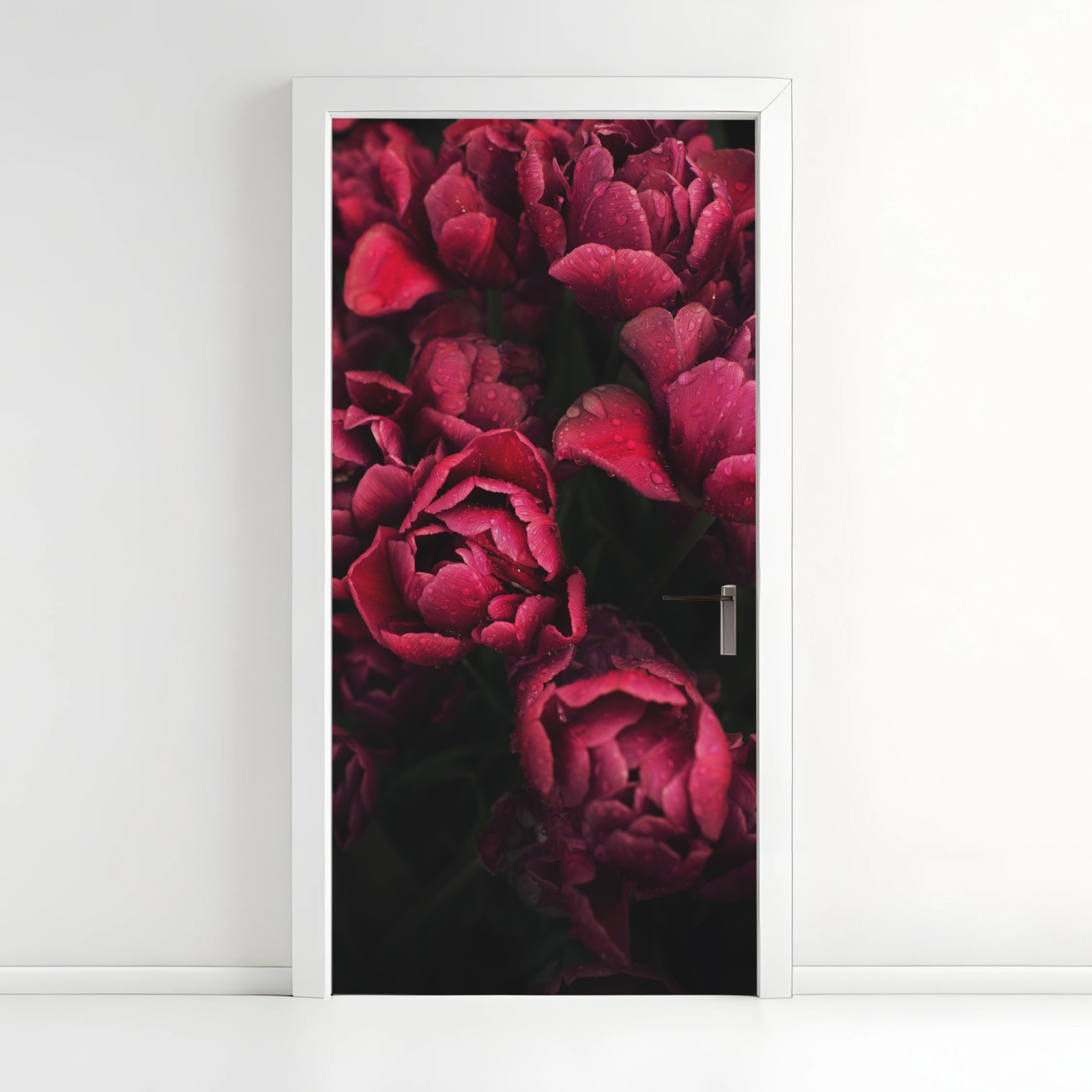 Türaufkleber Tiefrote blüten mit wassertropfen
