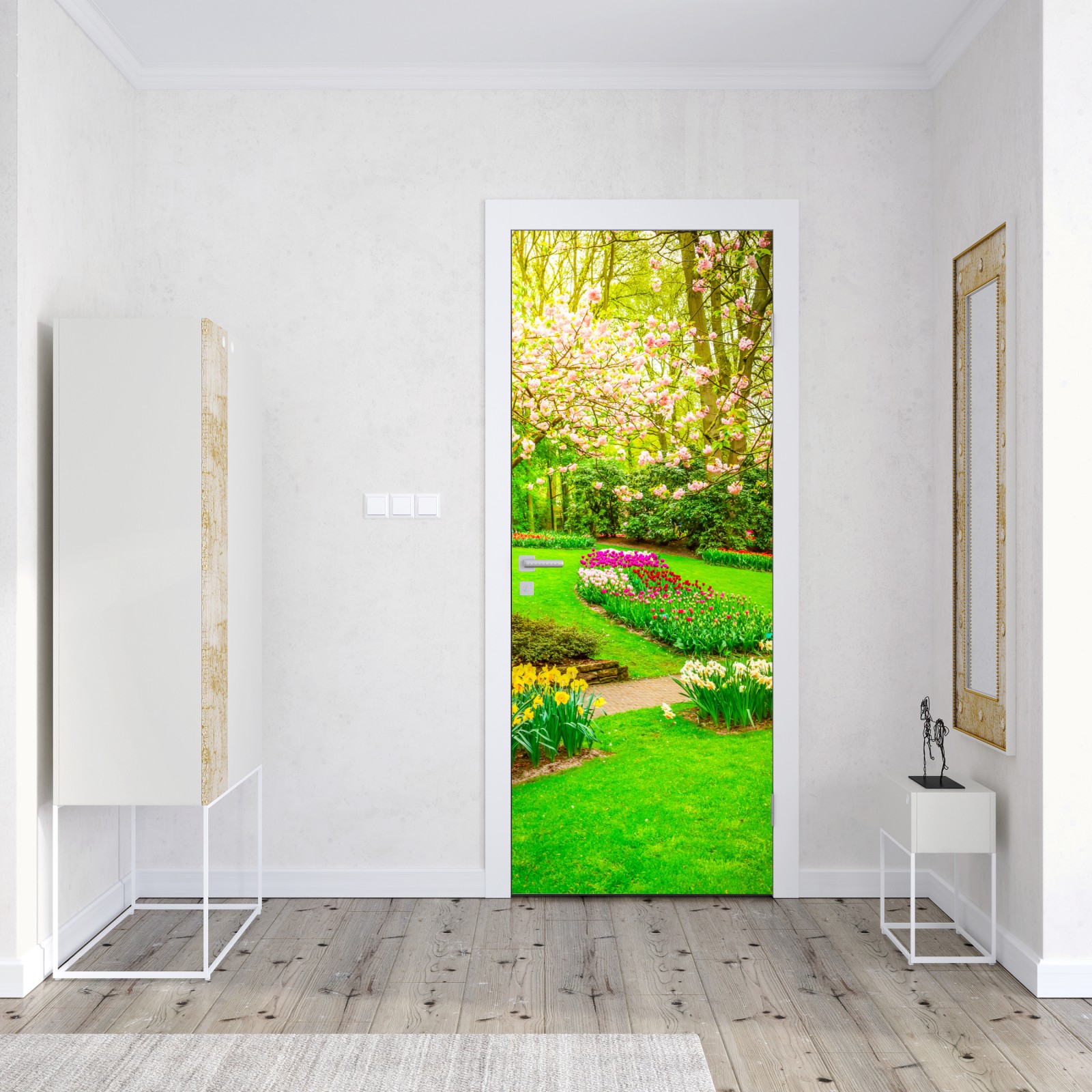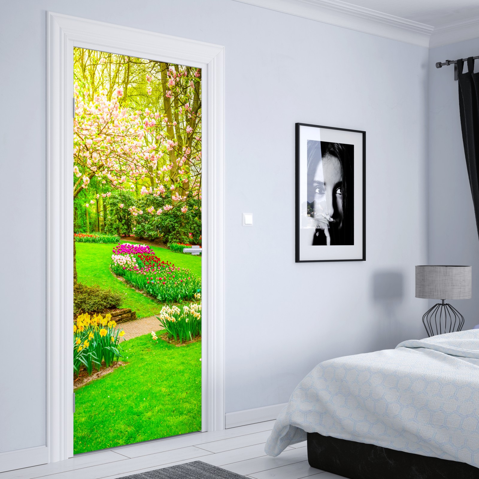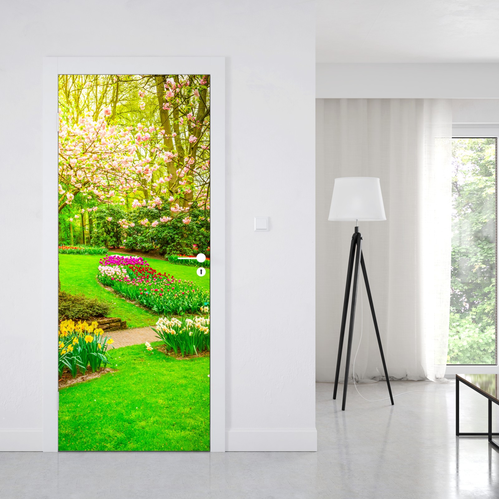 Türaufkleber frühlingsgarten in blüte: tulpen und kirschblüten