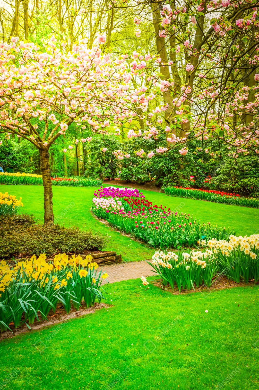 Bringen Sie den Frühling ins Zuhause mit dieser lebendigen Gartenansicht voller Tulpen, Narzissen und Kirschblüten.
