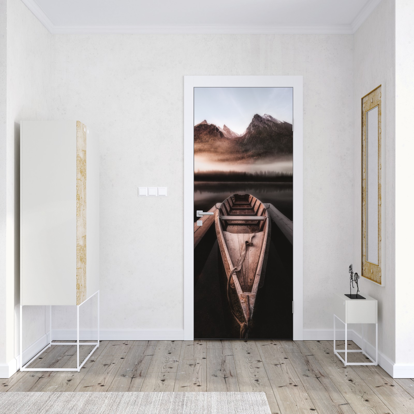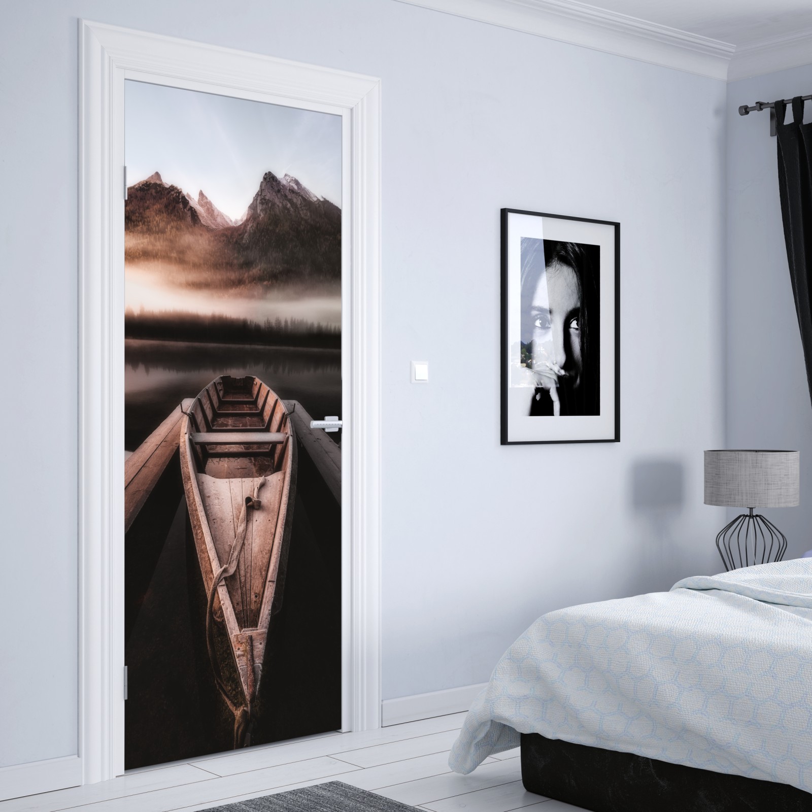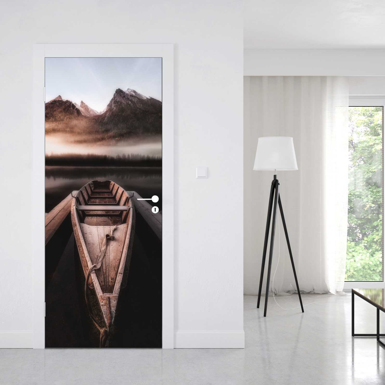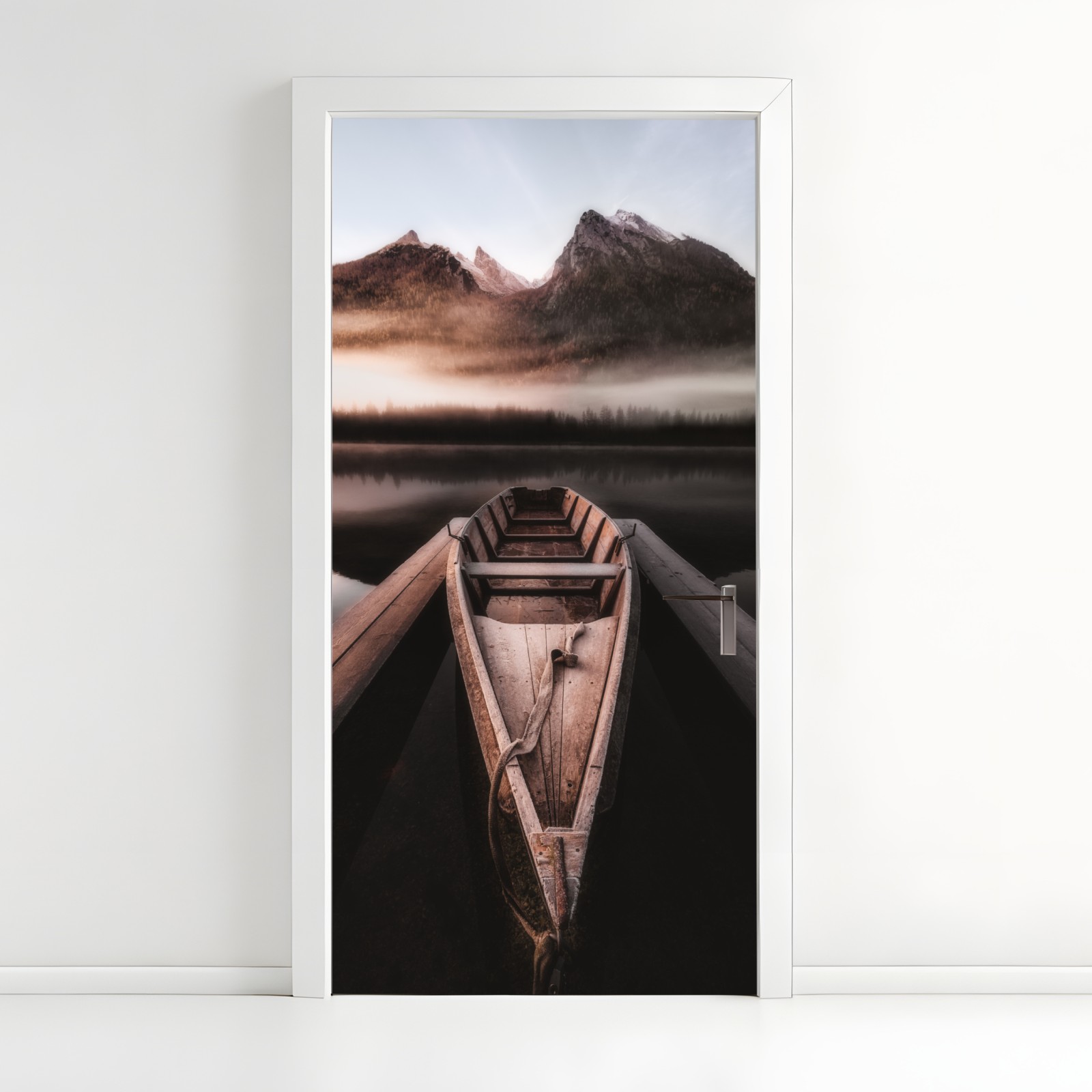 Erleben Sie ruhige Morgen mit einem nebligen Bergsee und einem einsamen hölzernen Boot, ideal um jedem Raum eine beruhigende Atmosphäre zu verleihen.