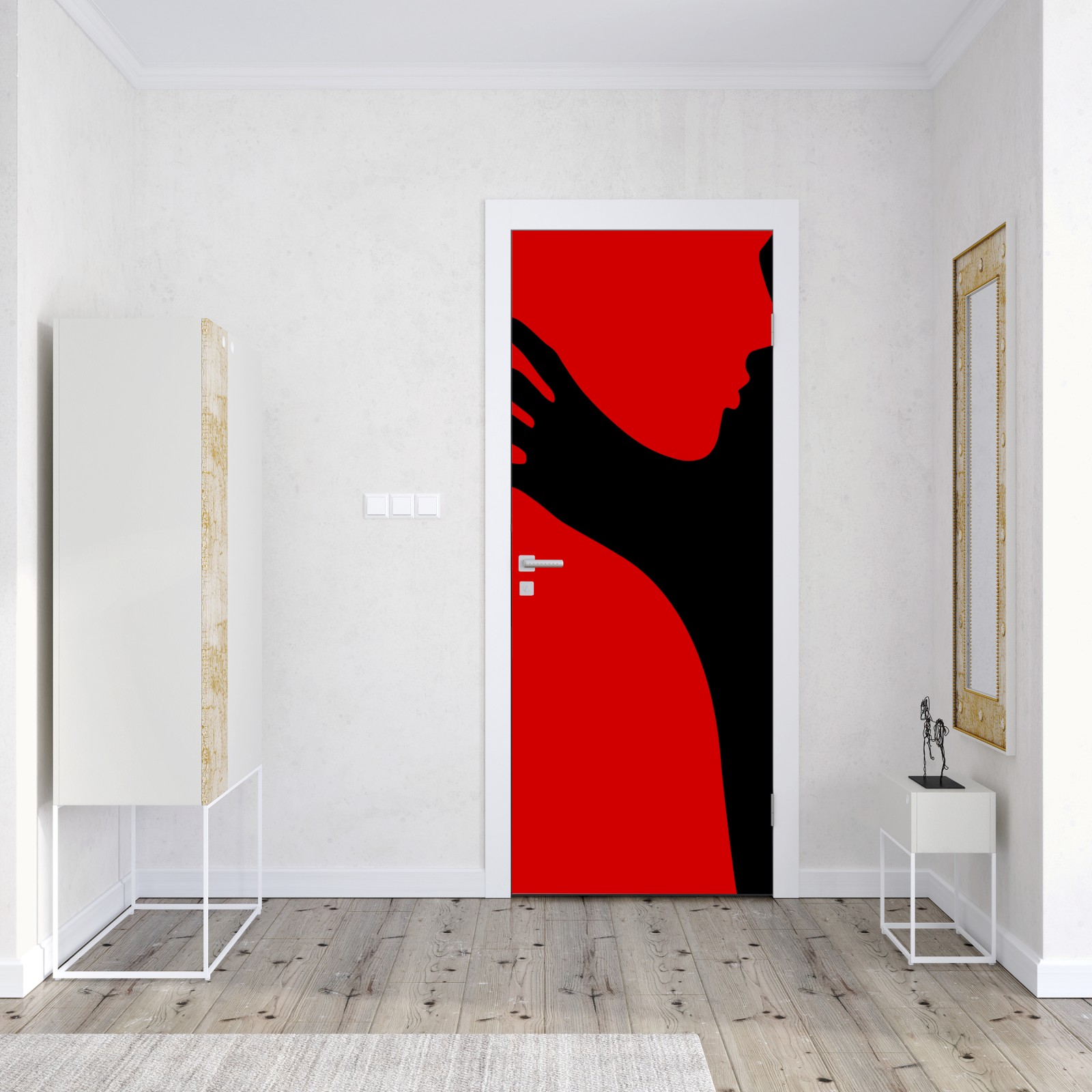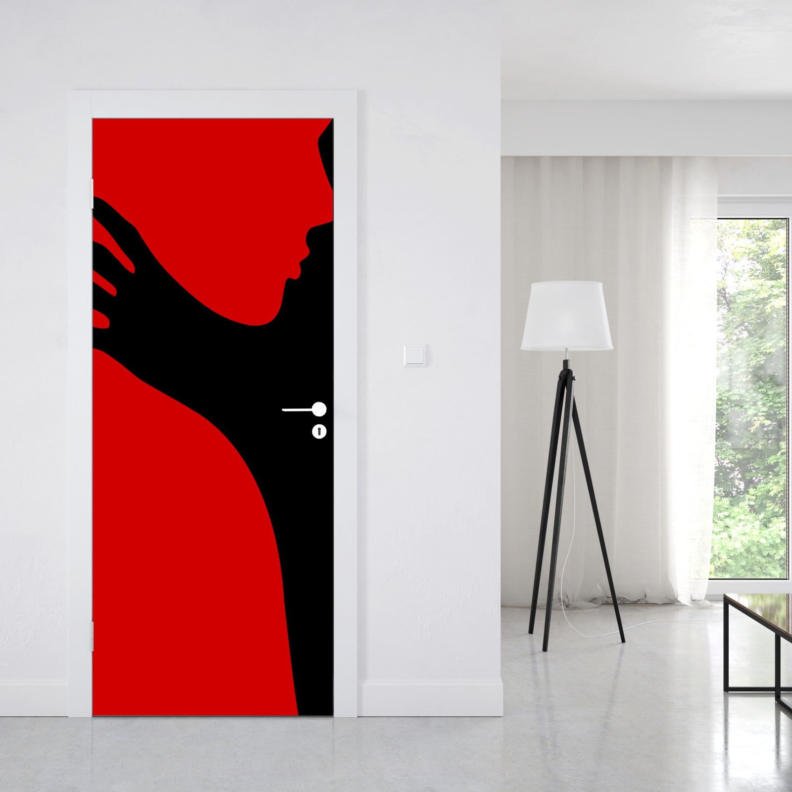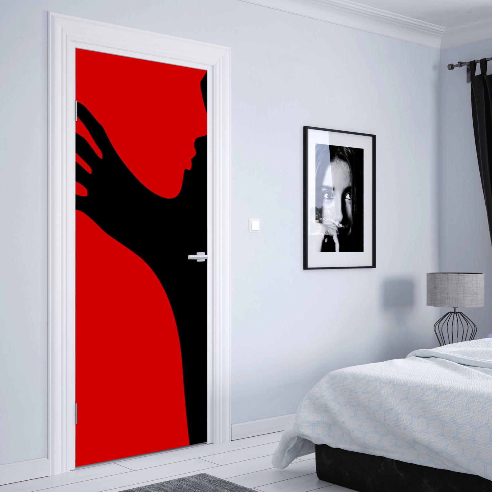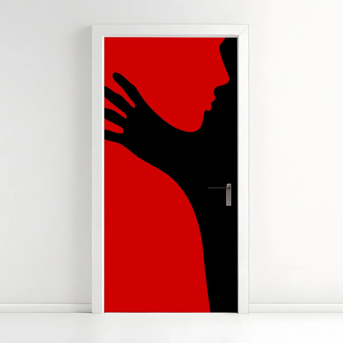 Auffälliges minimalistisches Kunstwerk mit kräftigen rot-schwarzen Silhouetten, das einen dramatischen und emotionalen Blickfang für jeden Raum schafft.