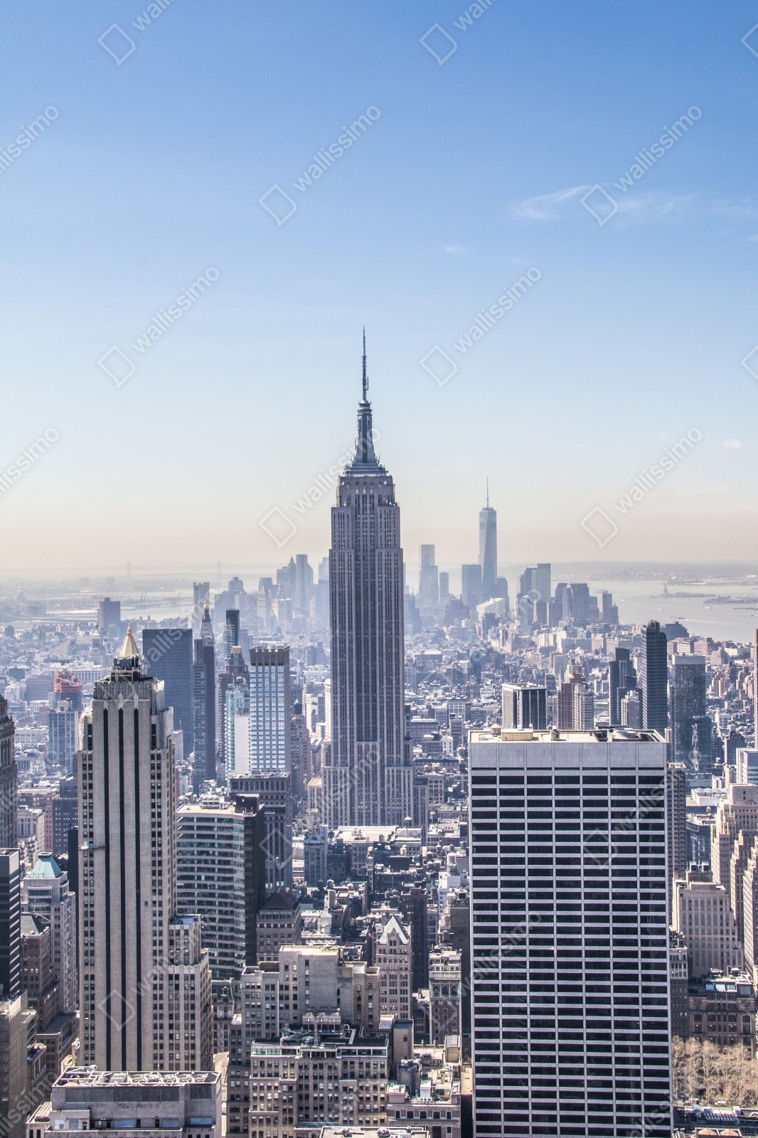 Verwandeln Sie Ihren Raum mit einem klaren Stadtbild von New York und dem Empire State Building vor blauem Himmel, ideal für moderne Einrichtungen.