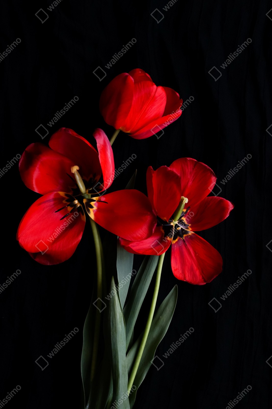 Bringen Sie dramatische florale Eleganz in Ihren Raum mit leuchtend roten Tulpen vor tiefschwarzem Hintergrund.