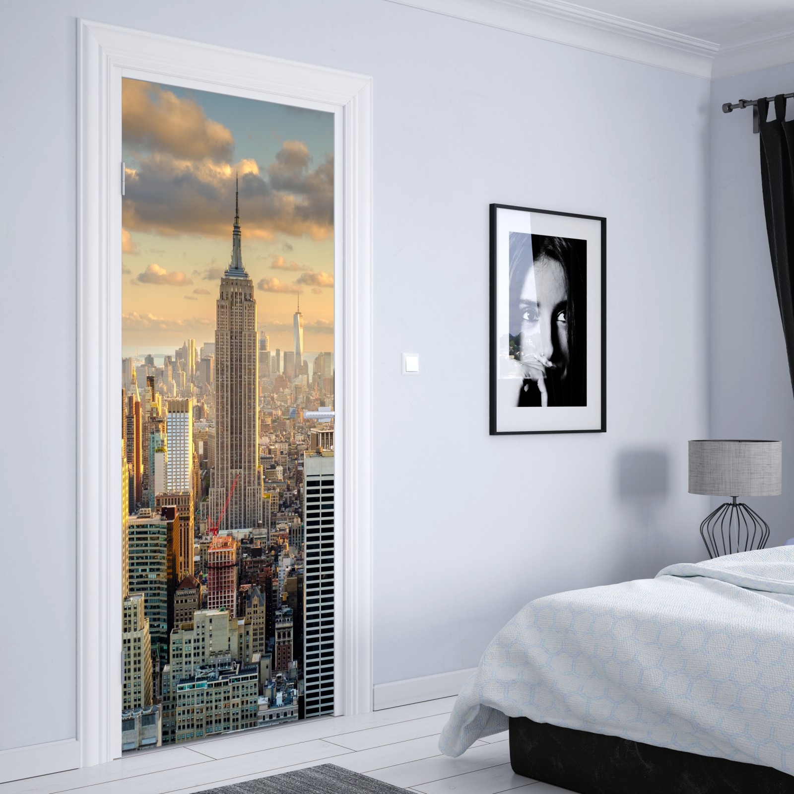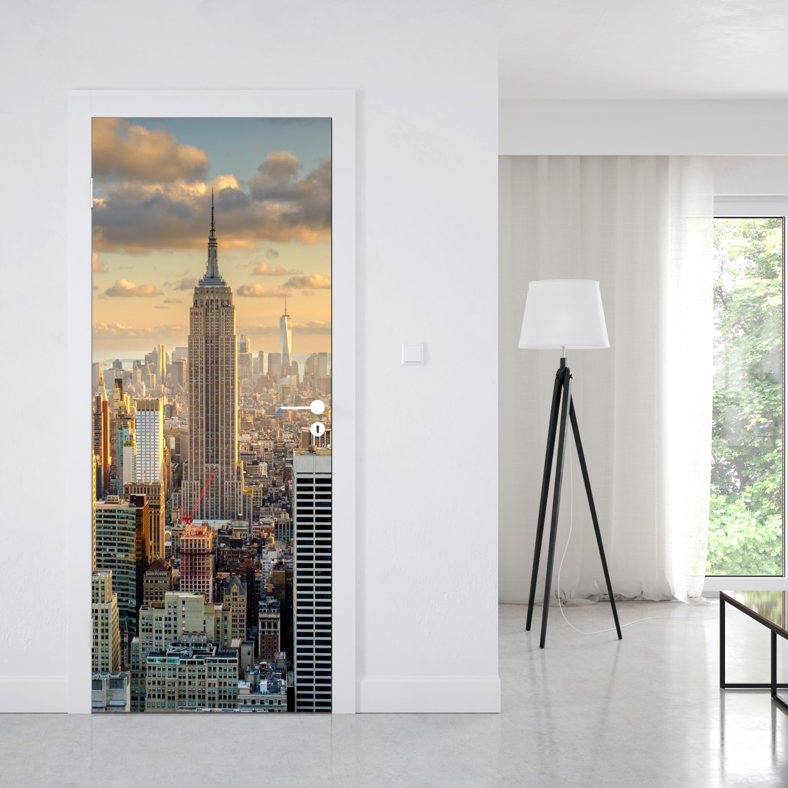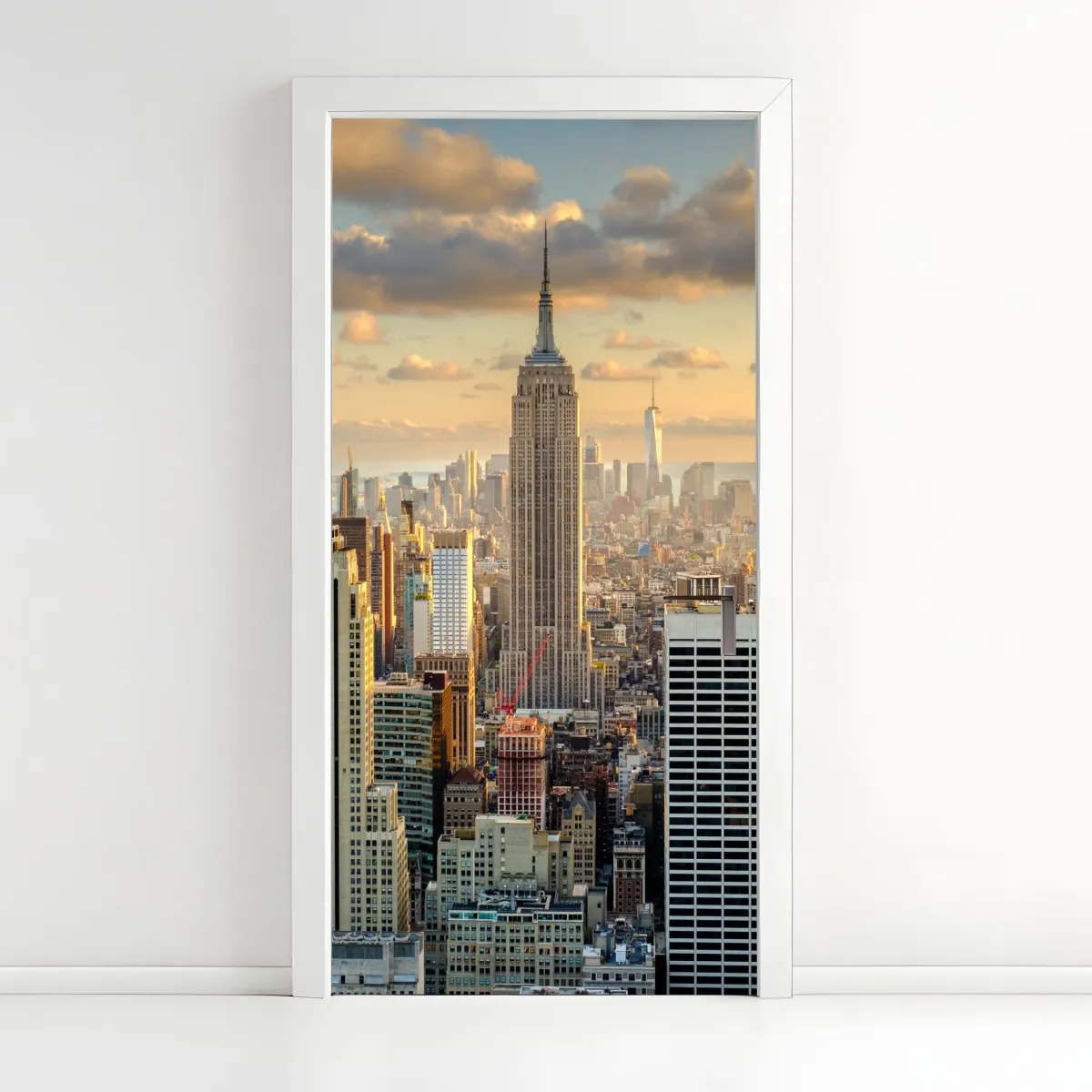 Bringen Sie die ikonische Skyline von New York in Ihr Zuhause mit warmen Sonnenuntergangstönen und beeindruckender urbaner Tiefe.