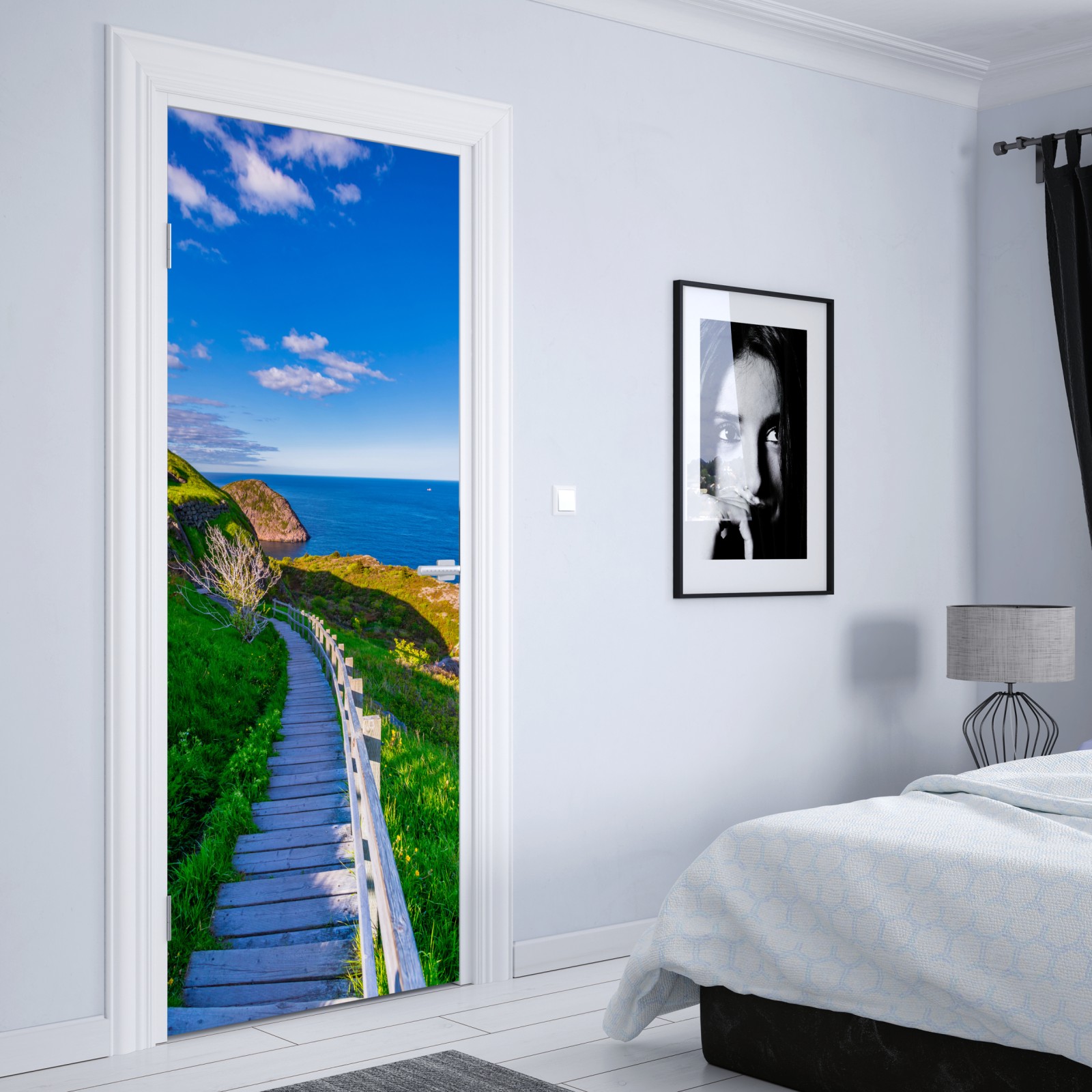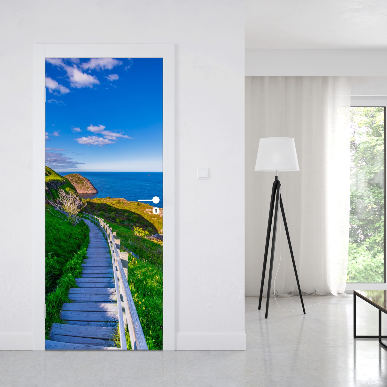 Bringen Sie ruhige Küstenlandschaft in Ihr Zuhause mit diesem lebendigen Motiv eines Holzstegs, grüner Klippen und tiefblauem Meer unter leicht bewölktem Himmel.
