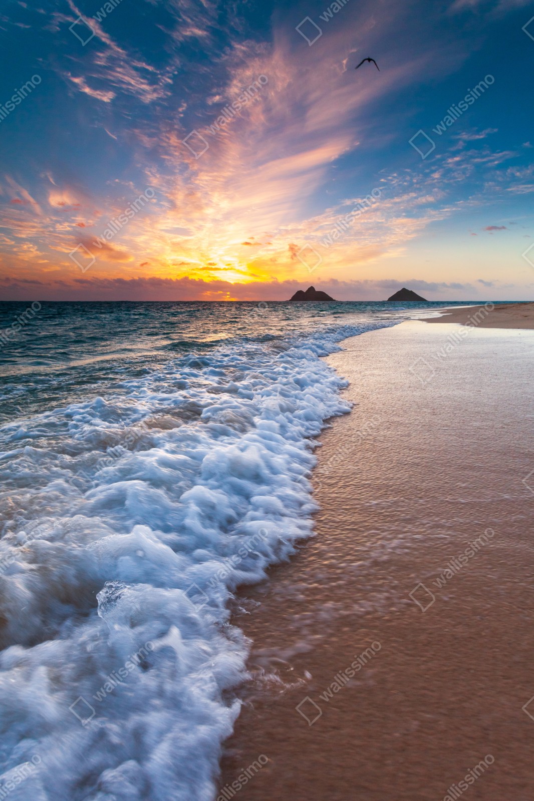 Bringen Sie beruhigende Meeresatmosphäre in Ihr Zuhause mit diesem lebendigen Sonnenaufgangsbild, das sanfte Wellen und einen farbenfrohen Himmel zeigt.