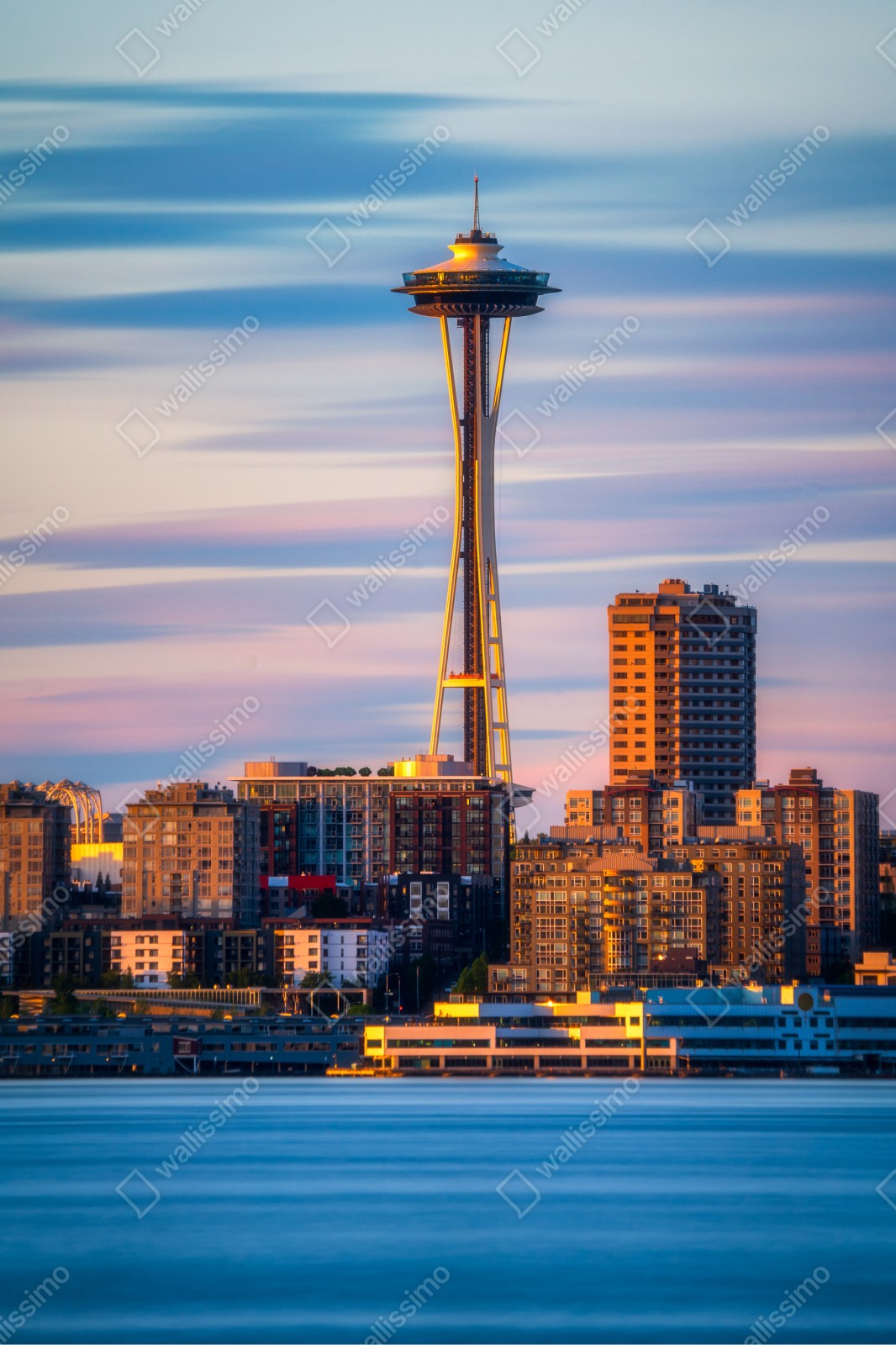 Bringen Sie Leben in Ihr Zuhause mit einer spektakulären Ansicht der Skyline von Seattle und dem leuchtenden Space Needle bei Sonnenuntergang.