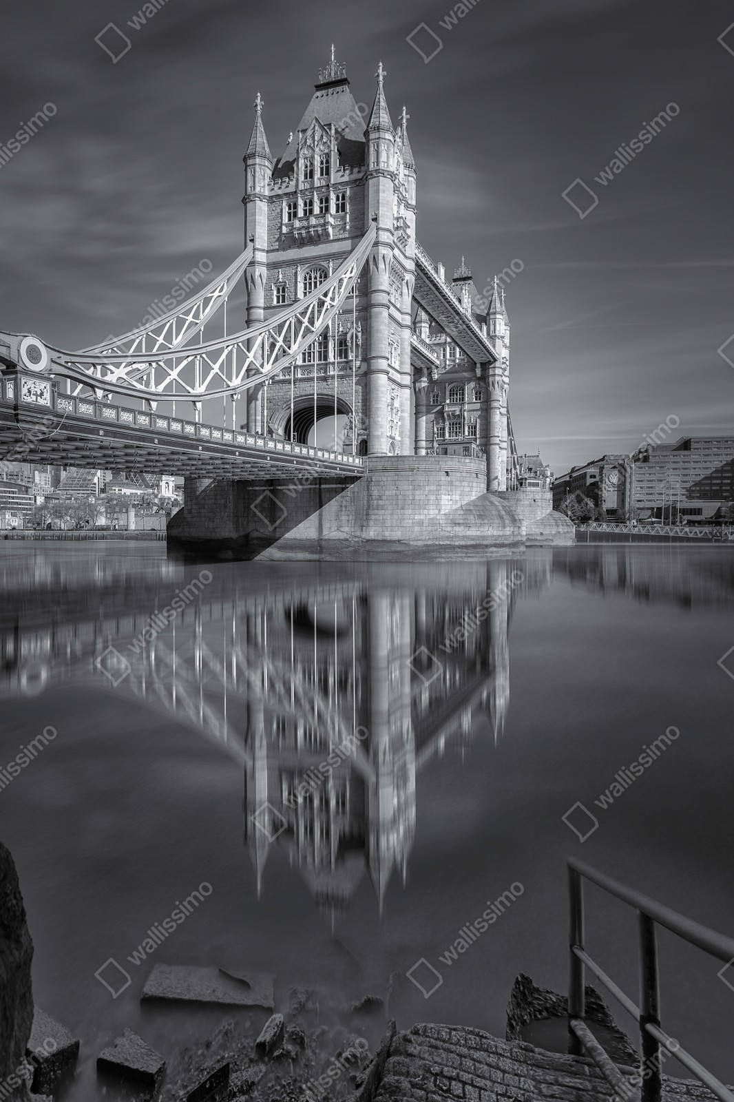 Erleben Sie zeitlose architektonische Eleganz mit diesem schwarzweißbild der Tower Bridge und ihrer klaren Spiegelung, perfekt für moderne Einrichtungen.
