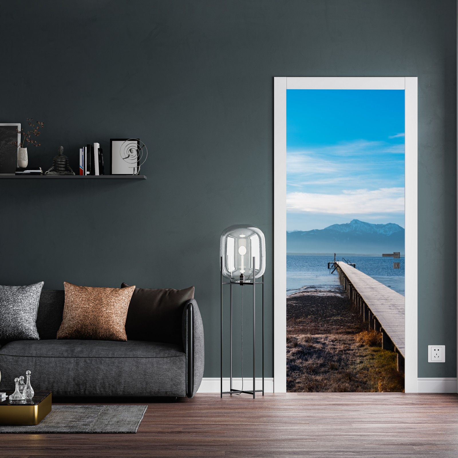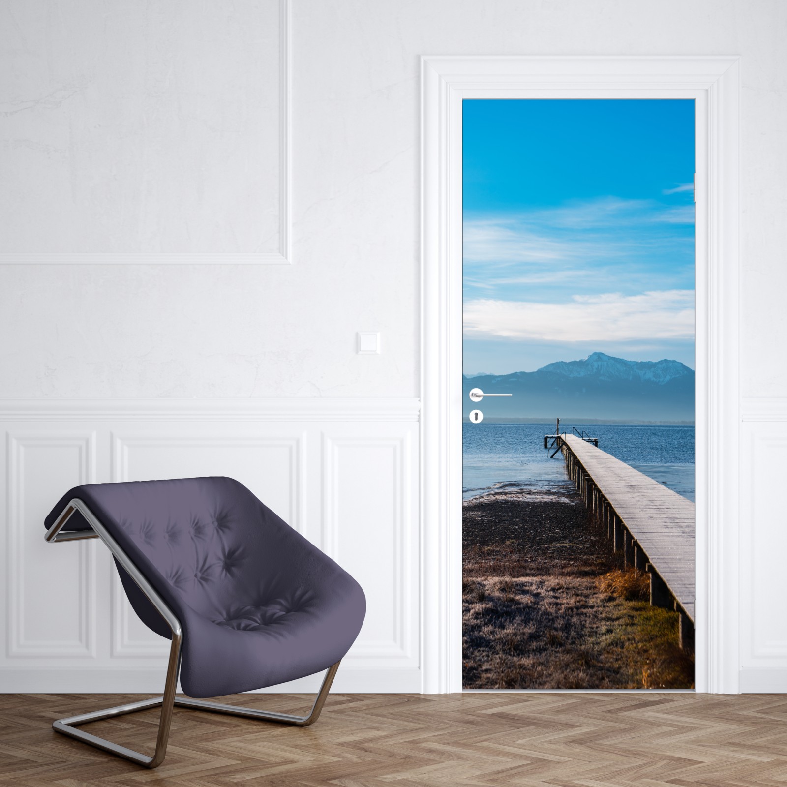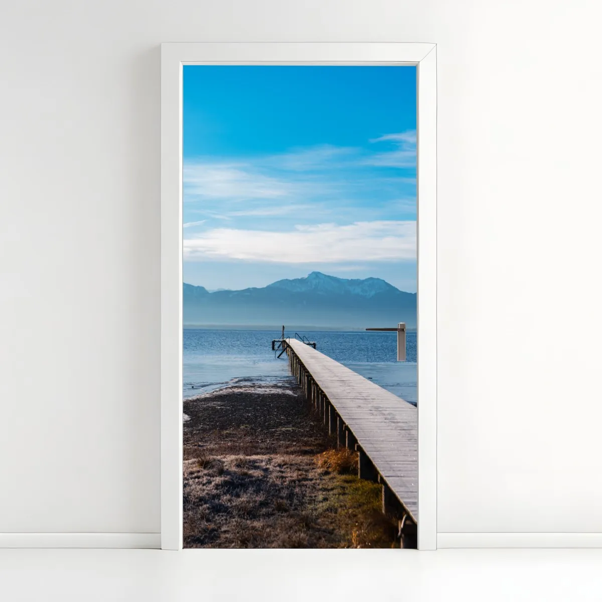 Bringen Sie Ruhe und natürliche Schönheit in Ihren Raum mit diesem friedlichen Steg am See vor schneebedeckten Bergen, perfekt als beruhigender Blickfang.