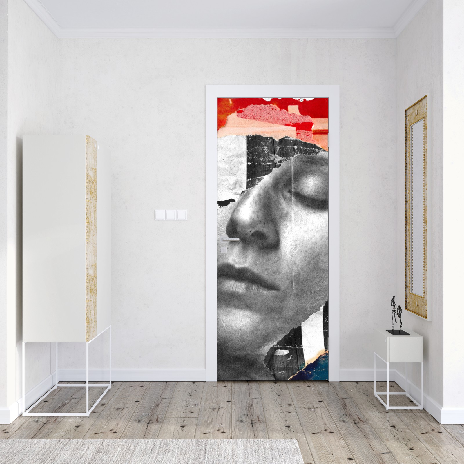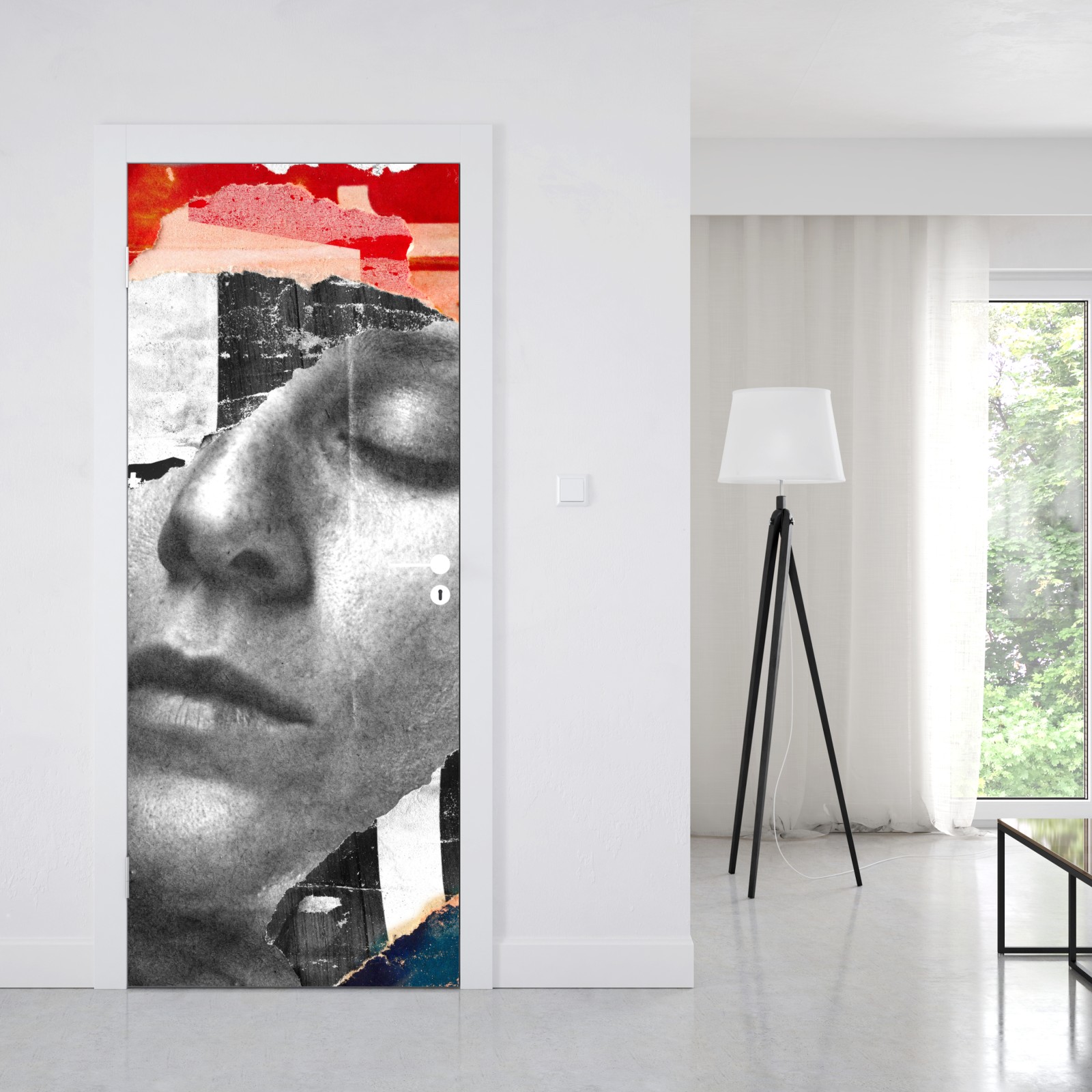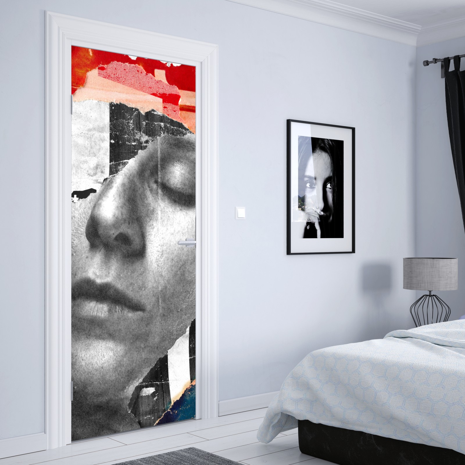 Entdecken Sie eine eindrucksvolle zerrissene Porträt-Collage, die monochrome Porträtfotografie mit kräftigen Farbflächen verbindet und einen urbanen, emotionalen Blickfang schafft.